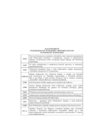 KALENDARIUM WA¯NIEJSZYCH WYDARZEÑ HISTORYCZNYCH W POWIECIE KONECKIM 1124 Pierwsza historyczna wzmianka o Koñskich, jako w³asnoœci protoplasty rodu Odrow¹¿ów Prandoty z Prandocina, zawarta w dokumencie nadania, wystawionym przez kardyna³a legata Idziego dla klasztoru tynieckiego. 1129 W Lipie wybudowano z modrzewia koœció³, pierwszy w obecnych granicach powiatu. 1145 W³aœciciel Koñskich Saul z rodu Odrow¹¿ów nadaje dziesiêciny z Koñskich klasztorowi w Trzemesznie. Biskup Krakowski Iwo Odrow¹¿ buduje w œrodku wsi Koœció³ 1220-24 pod wezwaniem œw. Miko³aja, ustanawiaj¹c w Koñskich parafiê. By³ to ju¿ drugi z kolei koœció³. Pierwszy sta³ w miejscu zwanym ,,Koœció³ki", obecnie Browary - dzielnica Koñskich. 1340 Król Kazimierz Wielki nadaje prawa miejskie dla Fa³kowa. 1348 Umiera Biskup Krakowski Piotr Falkowski, pos³any przez króla Kazimierza Wielkiego do papie¿a do Avinionu (Francja), gdzie po œmierci zosta³ pochowany. 1364 W Radoszycach powstaje parafia, do której nale¿y szeœæ wsi. 1370 Nadanie praw miejskich dla Radoszyc przez króla Kazimierza Wielkiego. Pierwsza lokacja miejska dla Odrow¹¿a. 1399 1411 Radoszyce - spotkanie króla W³adys³awa Jagie³³y z ¿on¹ królow¹ Ann¹ w Œwiêto Trzech Króli. 1430 Król W³adys³aw Jagie³³o nadaje prawa miejskie dla Gowarczowa. XV w. Wybitny historyk Jan D³ugosz wymienia Koñskie jako w³asnoœæ Tobiasza i Krzes³awa Odrow¹¿ów. Posiad³oœæ sk³ada siê z 50 ³anów kmiecych, trzech folwarków rycerskich o powierzchni 17 ³anów oraz siedmiu karczm. 1492 - 1520 Budowa w Koñskich obecnego koœcio³a pod wezwaniem œw. Miko³aja. Wykorzystano niektóre elementy z poprzedniego obiektu, rozebranego przed 1500 rokiem. Rozwój kuŸnic ¿elaznych (z zastosowaniem kó³ wodnych) na terenie XVI w. powiatu. W tym czasie znane s¹ kuŸnice w: Machorach, Odrow¹¿u, Pijanowie, Wyszynie, Turowicach, Ko³oñcu, Czarnej, Grzybowie, Królewcu, Niek³aniu, St¹porkowie, Starzechowicach. 1611 Druga lokacja miejska dla Odrow¹¿a. W po³owie wieku Kasztelan Sieradzki Rafa³ Ma³achowski z Ma³achowic kupuje wieœ Koñskie Wielkie oraz wsie: W¹sosz, B³otnicê i Duraczów. XVII w. Jego syn Stanis³aw, Wojewoda Poznañski, dokupuje dalsze wsie. Rozleg³e dobra koneckie przechodz¹ na w³asnoœæ rodziny Ma³achowskich. 1729 Kanclerz Jan Ma³achowski nadaje dla mieszkañców Koñskich przywileje. Zachowuje w nich podzia³ ludnoœci na czynszowników i ch³opów pañszczyŸnianych. Ustanawia samorz¹d - Urz¹d Miejski, Wójtowski. 1738 St¹porków - Kanclerz Jan Ma³achowski buduje pierwszy wielki piec i uruchamia produkcjê w ,,Hucie St¹porków”. 1748 Jan Ma³achowski, Kanclerz Wielki Koronny uzyskuje u króla Augusta III prawa miejskie dla Koñskich. Z miasta czyni centrum zarz¹dzania swymi rozleg³ymi dobrami o nazwie ,,Koñskie Wielkie", a mieszkañcy otrzymuj¹ wiêkszoœæ przywilejów ludnoœci miast królewskich. 1770 1784 1786 1787 22 Burgrabia Krakowski Jan Faygel funduje Koœció³ pod wezwaniem œw. Jana Chrzciciela w obecnej dzielnicy Koñskich-Browary. Maleniec - Jacek Jezierski, Kasztelan £ukowski za³o¿y³ zak³ad, sk³adaj¹cy siê z tartaku, drutarni i fryszerni z jedenastoma m³otami. Król Stanis³aw August Poniatowski zatwierdza poprzednie przywileje miasta, dodaj¹c prawo organizowania czterech dodatkowych jarmarków. 16-18 lipca w mieœcie i powiecie przebywa powracaj¹cy z Ukrainy król Stanis³aw August Poniatowski. Goszczony przez Ma³achowskich zwiedza miasto i pobliskie zak³ady przemys³owe. 1794 11 listopada w Radoszycach mia³a miejsce kapitulacja wojsk Insurekcji Koœciuszkowskiej pod dowództwem genera³a Tomasza Wawrzeckiego. 1797 Stanis³aw Staszic zwiedza Koñskie i okolicê. W swoim dzienniku podró¿y zwraca uwagê na dobry stan gospodarczy miasta i okolicznych zak³adów przemys³owych, nale¿¹cych do hr. Stanis³awa Ma³achowskiego. 1817 W dniach 18-19 lipca odbywaj¹ siê uroczystoœci ¿a³obne ku czci poleg³ego pod Lipskiem ksiêcia Józefa Poniatowskiego, którego zw³oki przewo¿ono z Warszawy przez Koñskie do Krakowa na Wawel. 1823 Pierwsza wzmianka o pracuj¹cej w Nieborowie (obecnie czêœci St¹porkowa) fryszerce, z której po latach powstaje Odlewnia ,,Nieborów". Powiat Konecki 1836 W Koñskich powstaje pierwsza œrednia szko³a rz¹dowa dla ch³opców nazywana obwodow¹ lub powiatow¹. 1860 W³aœciciel miasta hr. W³odzimierz Ma³achowski, maj¹c k³opoty finansowe z jego utrzymaniem, proponuje sprzeda¿ Koñskich skarbowi pañstwa za 192.820 rubli i 17 kopiejek. Transakcja nie dochodzi do skutku. 1863 21 kwietnia na uroczysku Ormanicha ko³o Szkucina zosta³a stoczona najwiêksza bitwa powstania styczniowego na terenie powiatu. 1864 8 maja odbywa siê egzekucja uczestników powstania styczniowego, Franciszka Makulskiego i Lucjana £¹czkowskiego, skazanych przez wojenny s¹d rosyjski w Koñskich na karê œmierci. 1867 Utworzenie powiatu koneckiego. Koñskie staj¹ siê siedzib¹ w³adz powiatowych a¿ do 1975 roku. 1870 Uprzemys³owione dobra koneckie kupuje hr. Jan Tarnowski. Rodzina Tarnowskich zamieszkuje w zespole pa³acowym. Maj¹tek pozostaje ich w³asnoœci¹ do 1945 roku. 1885 1894 Oddanie do u¿ytku linii kolejowej, co przyczyni³o siê do rozwoju w mieœcie odlewnictwa ¿elaza i przemys³u metalowego. Powstanie pierwszej w Koñskich odlewni Piotra £awacza oraz kolejnych ,,S³owianin" (1900r.) i S.Kronenblum (1903). Wzrost zatrudnienia w przemyœle z 10 osób w 1886 r., do blisko 1000 w roku 1914. 1912 8 listopada w Rudzie Malenieckiej otwarto doœwiadczaln¹ stacjê ryback¹, pierwsz¹ tego typu w Polsce placówkê naukowo-badawcz¹, której kierownikiem zosta³ Franciszek Staff, brat poety Leopolda Staffa. 1913 Koñskie otrzymuj¹ oœwietlenie elektryczne, uruchomione zostaje kino. 1914 5 wrzeœnia do Koñskich wje¿d¿a konny oddzia³ Legionów Józefa Pi³sudskiego pod dowództwem Beliny Pra¿mowskiego. Na ulicy Zamkowej docho