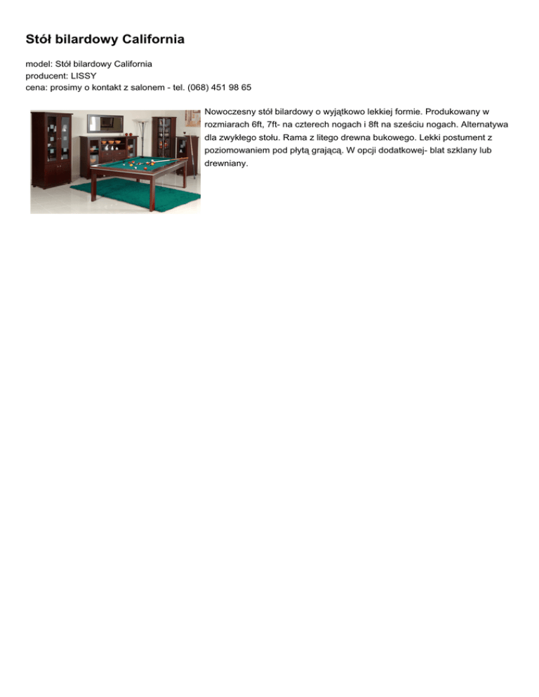 Stół bilardowy California model: Stół bilardowy California producent: LISSY cena: prosimy o kontakt z salonem - tel. (068) 451 98 65 Nowoczesny stół bilardowy o wyjątkowo lekkiej formie. Produkowany w rozmiarach 6ft, 7ft- na czterech nogach i 8ft na sześciu nogach. Alternatywa dla zwykłego stołu. Rama z litego drewna bukowego. Lekki postument z poziomowaniem pod płytą grającą. W opcji dodatkowej- blat szklany lub drewniany.