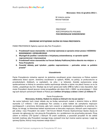 Ruch społeczny DzielnyTata.pl Warszawa Dnia 12 grudnia 2012 r. W imieniu ojców Michał Fabisiak ………………………… PREZYDENT RZECZYPOSPOLITEJ POLSKIEJ PAN BRONISŁAW KOMOROWSKI ZBIOROWE WYSTĄPIENIE OJCÓW DO PANA PREZYDENTA PANIE PREZYDENCIE Żądamy wprost aby Pan Prezydent : 1. Przedstawił nasze stanowisko na komisji sejmowej w sprawie zmian prawa i KODEKSU RODZINNEGO I OPIEKUŃCZEGO 2. Wystąpił do posłów i senatorów z inicjatywą ustawodawczą w sprawie opieki naprzemiennej i równoważnej 3. Przedstawił nasze stanowisko na Forum Debaty Publicznej która obecnie ma miejsce u Pana Prezydenta 4. Powołał debatę pod tytułem „opieka naprzemienna – potrzeba zmian w polskim prawie” Uzasadnienie Panie Prezydencie mówimy wprost że jesteśmy oszukiwani przez stworzony w Polsce system odbierania dzieci ojcom. Jesteśmy oszukiwani w sądach, RODK, na policji, w prokuraturze w przedszkolach, żłobkach, w szpitalach, na ulicy i w telewizji. Została wytworzona wizja społeczeństwa w której to samotna matka wychowuje dziecko a ojciec ma płacić haracz za to że matka „zaopiekuje się nim. Wydaje się że tych spraw jest tylko 170 bo tylko o tylu słyszałem, być może Prezydent słyszał jeszcze mniej przypadków ale dane GUS z 2002r są przerażające !. Otóż wg tych danych samotnych Matek w Polsce jest 1milion 19 tysięcy a dzieci z nimi 1,5 miliona !!! Panie Prezydencie: Warszawa, Kraków, Radom to miasta w których nie ma już ojców ! bo suma ludności tych miast składa się na liczbę samotnych matek z dziećmi która w 2012r wynosiła 2,7 miliona ! Dziś podpisuje Pan ustawy o praw kobiet do zamykania mężczyzn wynikających z przemocy domowej, gdy tym czasem w większości przypadków ta przemoc to fikcja, to intrygi, to kłamstwa kobiet wymierzone w kierunku mężczyzn, których sami mężczyźni i jak widzę i nasz Prezydent nie widzi ! Od Forum Matek Przeciw Dyskryminacji Ojców słyszę że ojcowie nie zgłaszają się i nie piszą do Prezydenta, że z problemem nie przychodzą ojcowie. Piszę zatem w imieniu 170 ojców! z których 70 znam osobiście, a pozostali przysłali mi do siebie kontakt mailowy aby Prezydent naszego kraju zostawił inne być możne ważne sprawy i zajął się sprawą Ojców, którzy tracą masowo swoje dzieci ! Michał Fabisiak wystąpienie do Prezydenta RP.docx Strona 1 z 5 Ruch społeczny DzielnyTata.pl Panie Prezydencie chcę aby Pan wiedział że w Polsce w Sądach używa się kłamstw, używa się intryg po to by oszukać prawo, po to by oszukać konstytucję. Sędziny za prawo wzięły pomówienia. Moi rodzice usłyszeli od sędzi że „mogli by pociąć skórę wnukowi i dlatego nie mogą widywać się z synem”. To kłamstwa, i bezczelność naszego wymiaru sprawiedliwości, który bez dowodów skazuje ojców, dziadków ojczystych na niemożność widzenia własnych dzieci i wnuków! Zapewne Pan prezydent nie może wyjść z podziwu dla tych sztuczek jakie są stosowane wobec nas, ojcowie słyszą w sądach że „przyniósł pan białe lilie małżonce dlatego wina w rozwodzie jest Pańska, gdy Ci ojcowie nawet nie wiedzą jak wyglądają białe lilie !!!. Być może jest to śmieszne ale w naszym przypadku tragiczne bo za te rzekomo przyniesione lilie ojciec teraz będzie musiał płacić haracz do końca życia na małżonkę – która sama się wyprowadziła do kochanka !!!!. Przez sędziny został stworzony system nagradzania własnej płci. Dziś w sądach nie dowody a słowa wytwarzające puste zagrożenie mają znaczenie. Mówi się że mąż „bił, mówi się ze pił, że lżył z żony” gdy w tym czasie np. mąż był za granicą. Mówi się przed sądem że dziecko było chore – po to żeby ojciec albo dziadek nie mógł zobaczyć syna/wnuka. A w tym czasie matka jest w Spa a dziecko siedzi z jej rodzicami. Zabieranie dzieci stało się modą, stało się kultem matki – samotnej matki. Samotne matki mają dofinansowanie od państwa, samotne matki mają pierwszeństwo w żłobkach, przedszkolach szkołach, na pasach na ulicy, kończąc na drzwiach mieszkania. Niczym święte krowy. Gdy mężczyzna niezgodzie się na taki stan rzeczy żona biegnie na policję kłamiąc że mąż ją pobił a tam zakłada się „niebieską kartę”. Gdy mężczyzna pokazuje siniaki, rany kłute, cieknie krew – wyśmiewany jest przez policję. Panie Prezydencie gdy matka zabiera dziecko do siebie a ojciec nie wie gdzie ono jest i idzie na Policję to słyszy że dziecko „porwali Talibowie, proszę szukać w Pakistanie”. Takie nagranie z komisariatu policji przedstawia jeden z ojców na swojej stronie www.tel112.org. Gdy ojciec prosi sąd o wakacje z synem ten działa w taki o to sposób: Na wakacje w dniach 13-22 sierpnia wydaje postanowienie 13go, wysyła 20go a dostarcza 28 go !!! A z postanowienia na wszelki wypadek nie wynika że Ojciec mógłby zabrać syna z sobą !!! Panie Prezydencie dowody umieściłem na stronie www.fabi.pl/przekret.html Proszę zobaczyć poczynania „mojego „ sądu i poczynania RODK. Poczynania RODK w Bielsku Białej to przestępstwo ale w opinii Prokuratury nie są. Oto fragment stenogramu nagrania z tego RODK przez dziecko jednego z ojcow Stenogram wniosków biegłych z badań przeprowadzonych w dniu 15.06.2011 roku Nagranie: wnioski biegłych RODK z dnia 15-06-2011 audio KK MD Katarzyna Kołodziejczyk Mariusz Drozd - psycholog - psycholog KK dziecko, no nie ma szczególnych zaburzeń, no ma trochę zaburzenie więzi z rodzicami, no ma, no jest ewidentnie zarzut który by podnieść można, równie częściej powiedzmy... no jest to poprzez wskaźnik tego jako że ona dystansuje się w ten sposób, ten konflikt rodziców jej przeszkadza, dystansuje się od niego, nie jest taka spontaniczna w tym,.... nie, nie jest taka spontaniczna, wiesz, tak wiesz, unika w ogóle wyrażania więzi, MD tak jak ja pytam z kim się bawi czy coś, to głuch, KK no Michał Fabisiak wystą