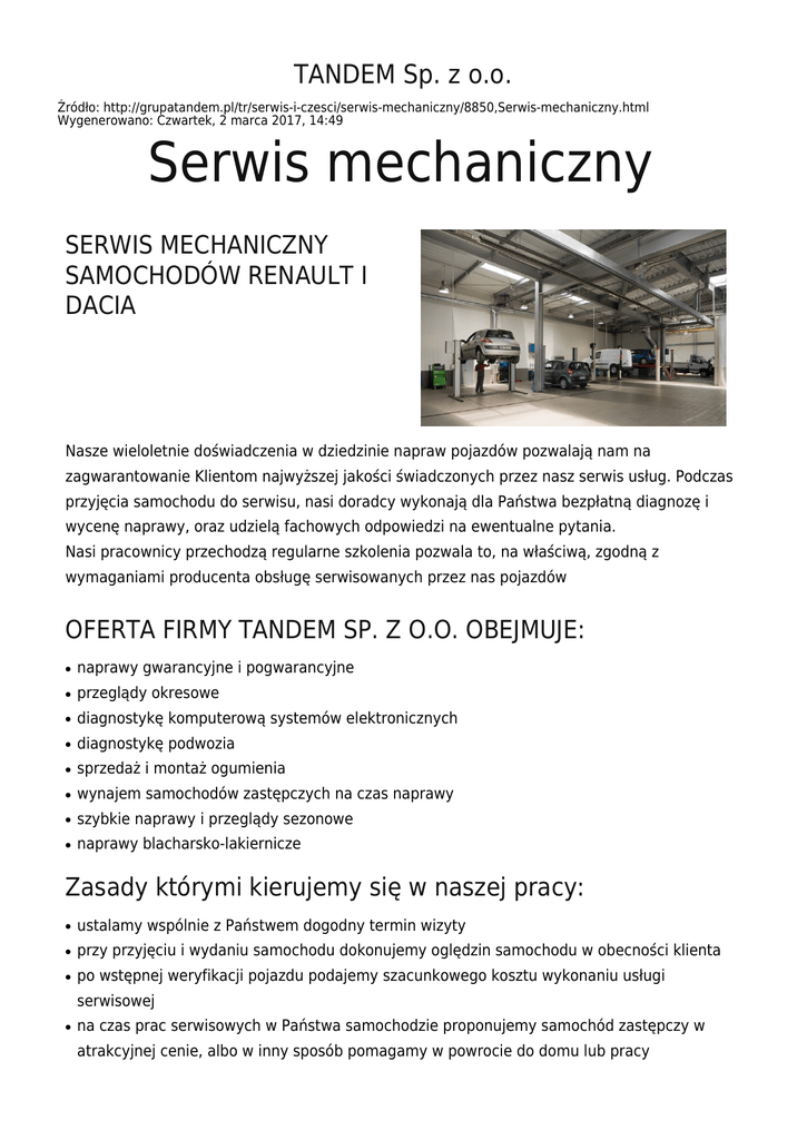TANDEM Sp. z o.o. Źródło: http://grupatandem.pl/tr/serwis-i-czesci/serwis-mechaniczny/8850,Serwis-mechaniczny.html Wygenerowano: Czwartek, 2 marca 2017, 14:49 Serwis mechaniczny SERWIS MECHANICZNY SAMOCHODÓW RENAULT I DACIA Nasze wieloletnie doświadczenia w dziedzinie napraw pojazdów pozwalają nam na zagwarantowanie Klientom najwyższej jakości świadczonych przez nasz serwis usług. Podczas przyjęcia samochodu do serwisu, nasi doradcy wykonają dla Państwa bezpłatną diagnozę i wycenę naprawy, oraz udzielą fachowych odpowiedzi na ewentualne pytania. Nasi pracownicy przechodzą regularne szkolenia pozwala to, na właściwą, zgodną z wymaganiami producenta obsługę serwisowanych przez nas pojazdów OFERTA FIRMY TANDEM SP. Z O.O. OBEJMUJE: ● naprawy gwarancyjne i pogwarancyjne ● przeglądy okresowe ● diagnostykę komputerową systemów elektronicznych ● diagnostykę podwozia ● sprzedaż i montaż ogumienia ● wynajem samochodów zastępczych na czas naprawy ● szybkie naprawy i przeglądy sezonowe ● naprawy blacharsko-lakiernicze Zasady którymi kierujemy się w naszej pracy: ● ustalamy wspólnie z Państwem dogodny termin wizyty ● przy przyjęciu i wydaniu samochodu dokonujemy oględzin samochodu w obecności klienta ● po wstępnej weryfikacji pojazdu podajemy szacunkowego kosztu wykonaniu usługi serwisowej ● na czas prac serwisowych w Państwa samochodzie proponujemy samochód zastępczy w atrakcyjnej cenie, albo w inny sposób pomagamy w powrocie do domu lub pracy ● poprzez wykwalifikowaną kadrę gwarantujemy Państwu wykonanie usługi na najwyższym poziomie - po wykonaniu usługi informujemy klienta o możliwości odbioru samochodu Potrzebujesz więcej informacji? Skontaktuj się ze swoim doradcą serwisowym: Będzin Częstochowa Kielce ul. Czeladzka 67 (DK 68 ul. Krótka 16 ul. Transportowców 16 Katowice – Warszawa) (32) 267 27 68 (34) 366 91 52 (41) 34 35 777