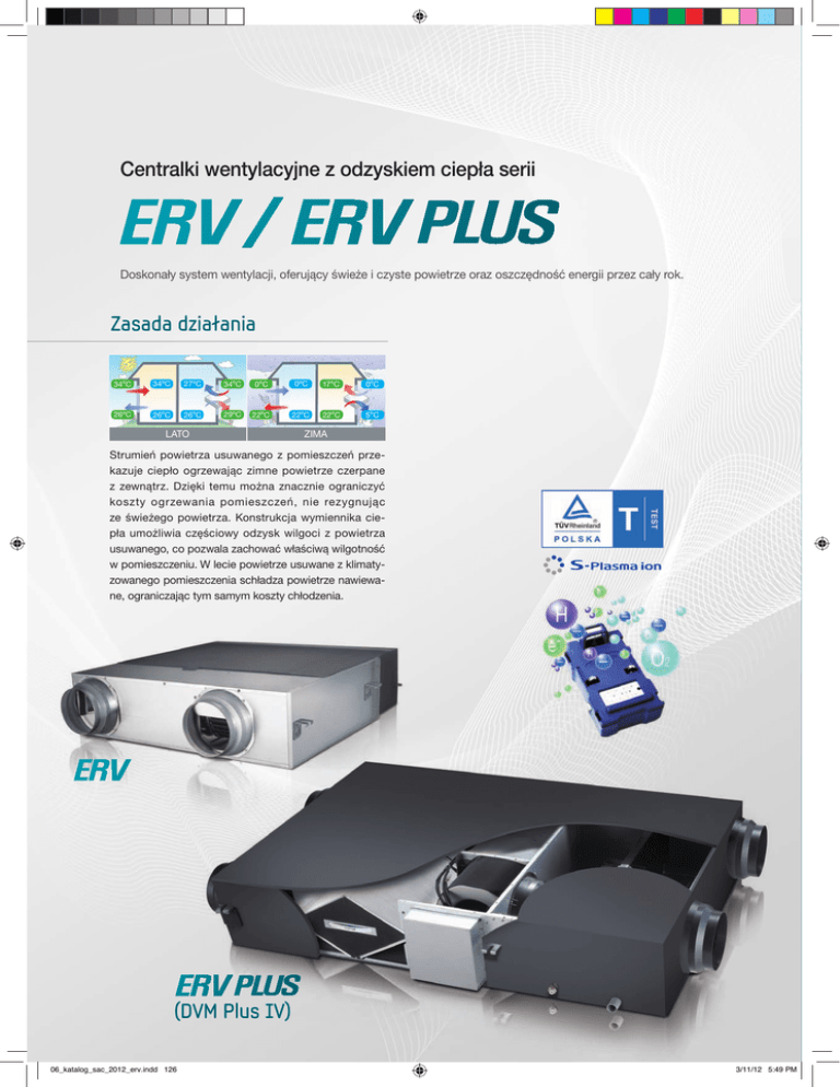 Centralki wentylacyjne z odzyskiem ciepła serii Doskonały system wentylacji, oferujący świeże i czyste powietrze oraz oszczędność energii przez cały rok. Zasada działania 34oC 34oC 27oC 34oC 0oC 0oC 17oC 0oC 26oC 26oC 26oC 29oC 22oC 22oC 22oC 5oC LATO ZIMA Strumień powietrza usuwanego z pomieszczeń przekazuje ciepło ogrzewając zimne powietrze czerpane z zewnątrz. Dzięki temu można znacznie ograniczyć koszty ogrzewania pomieszczeń, nie rezygnując ze świeżego powietrza. Konstrukcja wymiennika ciepła umożliwia częściowy odzysk wilgoci z powietrza usuwanego, co pozwala zachować właściwą wilgotność w pomieszczeniu. W lecie powietrze usuwane z klimatyzowanego pomieszczenia schładza powietrze nawiewane, ograniczając tym samym koszty chłodzenia. (DVM Plus IV) 06_katalog_sac_2012_erv.indd 126 3/11/12 5:49 PM oint Multi Zanieczyszczenia O2 O2 Ciepło CO2 Świeże i nawilżone powietrze O2 CO2 CO2 O2 Centralki ERV zapewniają niezbędną wymianę powietrza w pomieszczeniach, z jednoczesnym odzyskiem ciepła i wilgoci ze strumienia powietrza usuwanego. Urządzenia dedykowane są do domów jednorodzinnych i powierzchni komercyjnych. CO2 Free Joint Multi ERV i ERV Plus CO2 O2 CO2 Krzyżowy wymiennik ciepła CO2 Świeże powietrze z zewnątrz Zużyte powietrze wewnętrzne Free Joint Multi Wewnątrz Na zewnątrz Wymiennik freonowy chłodnica/ nagrzewnica Centralki ERV Plus to rozbudowana wersja klasycznego urządzenia ERV. Nowy typ może współpracować z systemem DVM Plus IV jak każda z wielu typów jednostek wewnętrznych, umożliwiając ogrzewanie lub chłodzenie pomieszczeń z jednoczesną wymianą powietrza. System znajduje zastosowanie w pomieszczeniach biurowych czy handlowych. CO2 O2 Świeże powietrze schłodzone lub ogrzane O2 CO2 CO2 O2 CO2 Krzyżowy wymiennik ciepła CO2 Zużyte powietrze wewnętrzne Świeże powietrze z zewnątrz ERV Plus konstrukcja Wentylatory Wentylatory nawiewny oraz wyciągowy pracują w oparciu o energooszczędne silniki prądu stałego, z możliwością dostosowania charakterystyki do strat ciśnienia w instalacji. Przepustnica by-pass Wbudowany wymiennik freonowy Umożliwia przepływ powietrza z obejściem krzyżowego wymiennika ciepła. Dzięki temu elementowi gdy jest to konieczne możemy korzystać z pracy w trybie freecoling do schłodzenia pomieszczenia powietrzem zewnętrznym. Ta sekcja umożliwia wtórne chłodzenie lub ogrzewanie powietrza nawiewanego do pomieszczenia we współpracy z systemem DVM Plus IV. Centralka może więc bilansować straty lub zyski ciepła w pomieszczeniu jak inne jednostki wewnętrzne. Wyrzutnia Wywiew Czujniki temperatury Odpowiadają za automatyczną zmianę trybu pracy urządzenia w zależności od warunków Czerpnia wewnętrznych i zewnętrznych. Filtr powietrza Nawiew Krzyżowy wymiennik ciepła Elementy automatyki Umożliwia odzysk ciepła i wilgoci z powietrza usuwanego z pomieszczeń Odpowiadają za utzrymanie właciwej pracy urzadzenia zależnie od wprowadzonych ustawień 06_katalog_sac_2012_erv.indd 127 Neutralizuje liczne patogeny obecne w powietrzu takie jak wirusy, bakterie czy grzyby SYSTEMY KLIMATYZACJI SAMSUNG 2012 Jonizator SPi (opcja) 127 Zapewniają właściwą filtrację powietrza nawiewanego do pomieszczeń 3/11/12 5:49 PM ulti Free Joint Multi Zasada działania Technologie Odzysk ciepła Zima Strumień powietrza usuwanego z pomieszczeń przekazuje ciepło ogrzewając zimne powietrze czerpane z zewnątrz. Dzięki temu można znacznie ograniczyć koszty ogrzewania pomieszczeń, nie rezygnując ze świeżego powietrza. Konstrukcja wymiennika ciepła umożliwia częściowy odzysk wilgoci z powietrza usuwanego, co pozwala zachować właściwą wilgotność w pomieszczeniu. Powietrze usuwane na zewnątrz ochłodzone i osuszone Powietrze usuwane z pomieszczeń ciepłe i wilgotne Powietrze zewnętrzne zimne i suche Powietrze nawiewane do pomieszczeń ogrzane i nawilżone Wymiennik krzyżowy Lato Powietrze usuwane z klimatyzowanego pomieszczenia schładza powietrze nawiewane, ograniczając tym samym koszty chłodzenia. Filtry klasy F8 Centralki wentylacyjne ERV firm Samsung są wyposażone standardowo w wysoce wydajne filtry klasy F8 (EU8), wg PN-EN 779, gwarantujące dokładną filtrację powietrza nawiewanego do pomieszczeń, podczas gdy filtry oferowane standardowo w centralach innych producentów to najczęściej filtry klasy G3 i G4. Podstawa klasyfikacji PN-EN 779 G1 Filtry wstępne G2 G3 G4 F5 F6 Klasa F8 Filtry bardzo dokładne Przeznaczenie Skuteczność filtracji PN-EN 779 Wszystkie rodzaje pyłu, sadze, Instalacje wentylacji mgła olejowa, zarodniki grzybów, częściowa skuteczność w pomieszczeniach czystych o wysokich dla dymu tytoniowego i bakterii rygorach jakości powietrza 80~90% Filtry dokładne F7 F8 F9 H10 H11 Filtry absolutne HEPA H12 H13 H14 128 Jonizator S-Plasma ion (Opcja) SYSTEMY KLIMATYZACJI SAMSUNG 2012 Centralka ERV może być opcjonalnie wyposażona w jonizator SPi, który ma zdolność do eliminowania licznych patogenów obecnych w powietrzu wewnętrznym takich jak bakterie, wirusy, roztocza, pleśnie i alergeny. Właściwości SPi zostały potwierdzone certyfikatem TUV Rheinland Polska. 06_katalog_sac_2012_erv.indd 128 3/11/12 5:49 PM oint Multi Free Joint Multi Automatyczny - „by-pass” W trybie pracy Auto, w zależności od różnicy temperatur w pomieszczeniu i na zewnątrz, centralka automatycznie steruje obejściem wymiennika (by-pass). Jeżeli różnica temperatur jest mniejsza niż 50C, urządzenie otwiera by-pass, zapewniając jedynie wymianę powietrza bez odzysku ciepła na wymienniku krzyżowym. Takie rozwiązanie zapobiega zjawisku niepożądanego podgrzewania powietrza, nawiewanego do pomieszczenia w okresach przejściowych (wiosna, jesień), gdy np. w pomieszczeniu panuje temperatura 250C (zyski ciepła), a na zewnątrz temperatura wynosi 200C. Warunki łagodne (wiosna i jesień) Kiedy różnica temperatur powietrza na zewnątrz i w