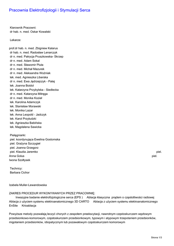 Pracownia Elektrofizjologii i Stymulacji Serca Kierownik Pracowni: dr hab. n. med. Oskar Kowalski Lekarze: prof.dr hab. n. med. Zbigniew Kalarus dr hab. n. med. Radosław Lenarczyk dr n. med. Patrycja Pruszkowska- Skrzep dr n. med. Adam Sokal dr n. med. Sławomir Pluta dr n. med. Michał Mazurek dr n. med. Aleksandra Woźniak lek. med. Agnieszka Liberska dr n. med. Ewa Jędrzejczyk - Patej lek. Joanna Boidol lek. Katarzyna Przybylska - Siedlecka dr n. med. Katarzyna Mitręga dr n. med. Monika Kozieł lek. Karolina Adamczyk lek. Stanisław Morawski lek. Monika Lazar lek. Anna Leopold - Jadczyk lek. Karol Przyłudzki lek. Agnieszka Babińska lek. Magdalena Sawicka Pielęgniarki: piel. koordynująca Ewelina Gostomska piel. Grażyna Szczygieł piel. Joanna Grzegorz piel. Klaudia Jaremko Anna Golus Iwona Szołtysek piel. piel. Technicy: Barbara Cichor Izabela Muller-Lewandowska ZAKRES PROCEDUR WYKONYWANYCH PRZEZ PRACOWNIĘ: Inwazyjne badanie elektrofizjologiczne serca (EPS ) Ablacja klasyczna prądem o częstotliwości radiowej Ablacja z użyciem systemu elektroanatomicznego 3D CARTO Ablacja z użyciem systemu elektroanatomicznego EnSite Krioablacja Powyższe metody pozwalają leczyć chorych z zespołem preekscytacji, nawrotnym częstoskurczem węzłowym przedsionkowo-komorowym, częstoskurczem przedsionkowym, typowym i atypowym trzepotaniem przedsionków, migotaniem przedsionków, idiopatycznym lub pozawałowym częstoskurczem komorowym Strona 1/3 INWAZYJNE BADANIE ELEKTROFIZJOLOGICZNE (EPS) Badanie wykonuje się w celu diagnostyki częstoskurczów nadkomorowych i komorowych. Kwalifikacja do badania odbywa się w ramach konsultacji kardiologicznych w Poradni Kardiologicznej Śląskiego Centrum Chorób Serca, ul. M.C Skłodowskiej 9, Zabrze. Pacjent skierowany do konsultacji powinien posiadać skierowanie z określeniem celu konsultacji oraz pełną dokumentację medyczną (w tym min. wypisy z poprzednich hospitalizacji, zapisy EKG w trakcie częstoskurczów oraz informacje o aktualnym leczeniu farmakologicznym). Chory zakwalifikowany ostatecznie do badania elektrofizjologicznego w chwili przyjęcia do szpitala powinien posiadać aktualne wyniki badań zaleconych przez konsultującego lekarza kardiologa oraz pełną dokumentację medyczną. U chorych kierowanych w trybie planowym zaleca się podanie przynajmniej dwóch dawek szczepionki przeciw WZW typu B. W razie przewlekłego stosowania leków przeciwkrzepliwych (np. Acenokumarol, Warfin, Sintrom) wskazane jest ich odstawienie na około 5-7 dni przed zabiegiem i zastąpienie heparyną drobnocząsteczkową w zastrzykach podskórnych (za wyjątkiem dnia zabiegu). Nie należy przed badaniem odstawiać leków przeciwpłytkowych np. preparatów kwasu acetylosalicylowego (np. Acard, Polocard, Aspiryn, Bestpirin) czy preparatów tiklopidyny/klopidogrelu (np. Ticlo, Plavix, Zyllt, Areplex), jeśli istnieją wskazania do ich stosowania. ABLACJA PRĄDEM O CZĘSTOTLIWOŚCI RADIOWEJ (RF) LUB KRIOABLACJA (CRYO) Badanie elektrofizjologiczne oraz zabiegi ablacji RF lub CRYO wykonuje się w celu diagnostyki i leczenia częstoskurczów nadkomorowych i komorowych. Kwalifikacja do ablacji odbywa się w ramach konsultacji kardiologicznych w Poradni Kardiologicznej Śląskiego Centrum Chorób Serca, ul. Szpitalna 2, Zabrze (tel. 32/37 33 676). Pacjent skierowany do konsultacji powinien posiadać skierowanie z określeniem celu konsultacji oraz pełną dokumentację medyczną (w tym wypisy z poprzednich hospitalizacji, zapisy EKG w trakcie częstoskurczów oraz informacje o aktualnym leczeniu farmakologicznym). Chory zakwalifikowany ostatecznie do ablacji w chwili przyjęcia do szpitala powinien posiadać aktualne wyniki badań zaleconych przez konsultującego lekarza kardiologa oraz pełną dokumentację medyczną. U chorych kierowanych w trybie planowym zaleca się podanie przynajmniej dwóch dawek szczepionki przeciw WZW typu B. W razie przewlekłego stosowania leków przeciwwkrzepliwych (np. Acenokumarol, Warfin, Sintrom) wskazane jest ich odstawienie na około 5-7 dni przed zabiegiem i zastąpienie heparyną drobnocząsteczkową w zastrzykach podskórnych (za wyjątkiem dnia zabiegu). Nie należy przez zabiegiem odstawiać leków przeciwpłytkowych np. preparatów kwasu acetylosalicylowego (np. Acard, Polocard, Aspiryn, Bestpirin) czy preparatów tiklopidyny/klopidogrelu (np. Ticlo, Plavix, Zyllt, Areplex), jeśli istnieją wskazania do ich stosowania. STYMULACJA PRZEZPRZEŁYKOWA Zabiegi stymulacji przezprzełykowej wykonuje się w celu określenia wydolności węzła zatokowego, sprawności przewodzenia przez łącze przedsionkowo-komorowe oraz prowokowania częstoskurczów, stanowiących potencjalną przyczynę zgłaszanych dolegliwości. Kwalifikacja do badania odbywa się w ramach konsultacji kardiologicznych w Poradni Kardiologicznej Śląskiego Centrum Chorób Serca, ul. M.C. Skłodowskiej 9, Zabrze (tel. 32/ 275-36-43 ) Termin zabiegu należy ustalić w Pracowni Elektrofizjologii, piel. Anna Golus (tel. 32/37 33 615) Strona 2/3 Pacjent skierowany do zabiegu powinien zgłosić się do pracowni na czczo, posiadać skierowanie z Poradni Kardiologicznej Śląskiego Centrum Chorób Serca z określeniem celu badania oraz wynik badania w kierunku obecności w surowicy krwi antygenu HBs. U pacjentów kierowanych w trybie planowym zalecane jest wykonanie szczepień ochronnych przeciw WZW typu B. IMPLANTACJA KARDIOSTYMULATORĂ W, KARDIOWERTERĂ W-DEFIBRYLATORĂ W ORAZ STYMULATORĂ W RESYNCHRONIZUJĄCYCH Z OPCJĄ KARDIOWERTERA-DEFIBRYLATORA. Kwalifikacja do zabiegów implantacji kardiostymulatorów, kardiowerterów-defibrylatorów i stymulatorów resynchronizujących z opcją kardiowertera- defibrylatora odbywa się w ramach konsultacji kardiologicznych w Poradni Kardiologicznej Śląskiego Centrum Chorób Serca, ul. M.C. Skłodowskiej 9, Zabrze (tel. 32 / 275-36-43) Pacjent skierowany do konsultacji powinien posiadać skierowanie z określeniem celu konsultac