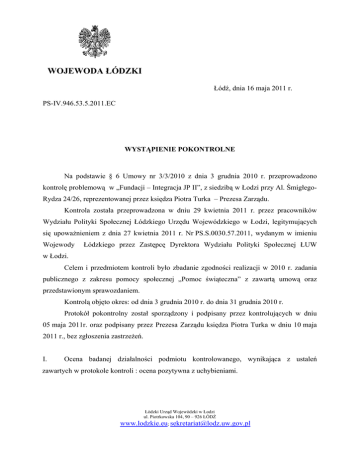 WOJEWODA ŁÓDZKI Łódź, dnia 16 maja 2011 r. PS-IV.946.53.5.2011.EC WYSTĄPIENIE POKONTROLNE Na podstawie § 6 Umowy nr 3/3/2010 z dnia 3 grudnia 2010 r. przeprowadzono kontrolę problemową w „Fundacji – Integracja JP II”, z siedzibą w Łodzi przy Al. ŚmigłegoRydza 24/26, reprezentowanej przez księdza Piotra Turka – Prezesa Zarządu. Kontrola została przeprowadzona w dniu 29 kwietnia 2011 r. przez pracowników Wydziału Polityki Społecznej Łódzkiego Urzędu Wojewódzkiego w Łodzi, legitymujących się upoważnieniem z dnia 27 kwietnia 2011 r. Nr PS.S.0030.57.2011, wydanym w imieniu Wojewody Łódzkiego przez Zastępcę Dyrektora Wydziału Polityki Społecznej ŁUW w Łodzi. Celem i przedmiotem kontroli było zbadanie zgodności realizacji w 2010 r. zadania publicznego z zakresu pomocy społecznej „Pomoc świąteczna” z zawartą umową oraz przedstawionym sprawozdaniem. Kontrolą objęto okres: od dnia 3 grudnia 2010 r. do dnia 31 grudnia 2010 r. Protokół pokontrolny został sporządzony i podpisany przez kontrolujących w dniu 05 maja 2011r. oraz podpisany przez Prezesa Zarządu księdza Piotra Turka w dniu 10 maja 2011 r., bez zgłoszenia zastrzeżeń. I. Ocena badanej działalności podmiotu kontrolowanego, wynikająca z ustaleń zawartych w protokole kontroli : ocena pozytywna z uchybieniami. Łódzki Urząd Wojewódzki w Łodzi ul. Piotrkowska 104, 90 – 926 ŁÓDŻ www.lodzkie.eu; [email protected] Stwierdzono następujące uchybienia : 1) w dniach 14 i 30 grudnia 2010 r., tj. w trakcie realizacji zadania, dokonano wpisów w Krajowym Rejestrze Sądowym, dotyczących odpowiednio zmiany nazwy : z Fundacja „Integracyjny Ośrodek Leczeń i Rehabilitacji im. Jana Pawła II” na „Fundacja – Integracja JP II” oraz zmiany siedziby Fundacji : z ul. L. Krzywickiego 20 na Al. Rydza-Śmigłego 24/26, o czym do dnia kontroli Fundacja nie powiadomiła Dotującego. 2) Fundacja prowadzi rachunkowość w sposób umożliwiający identyfikację kosztów poniesionych z dotacji przyznanej przez Wojewodę Łódzkiego. - wydatki z tego tytułu zaewidencjonowane zostały na koncie 712-01-01-04-07 "koszty Pomocy świątecznej ŁUW". Konto zostało zatytułowane nieprawidłowo. II. Opis przyczyn powstania, zakres i skutki stwierdzonych uchybień oraz wskazanie osób odpowiedzialnych za ich powstanie. W oparciu o dokumentację udostępnioną zespołowi kontrolerów stwierdzono uchybienia w działalności jednostki, będące konsekwencją nieprzestrzegania lub niedostatecznej znajomości niektórych przepisów prawa oraz braku właściwego nadzoru ze strony Zarządu Fundacji. Warto zauważyć, że uchybienia uznawane są za odstępstwa od stanu pożądanego o charakterze formalnym, nie powodujące następstw dla kontrolowanej działalności. III. Uwagi, wnioski i zalecenia w sprawie usunięcia stwierdzonych uchybień. W celu usunięcia stwierdzonych uchybień oraz usprawnienia prowadzenia zagadnień objętych kontrolą, zaleca się pełne wykorzystanie ustaleń zawartych w protokole kontroli oraz podjęcie skutecznych działań dążących do wyeliminowania powstałych uchybień, tj.: 1) informowanie Dotującego na piśmie o wszelkich dotyczących Fundacji zmianach, w odniesieniu do zawartych w przyszłości umów, w trakcie realizacji kolejnych zadań, 2) określanie, precyzyjnie i zgodnie ze stanem faktycznym, nazw kont księgowych dotyczących rozliczenia środków finansowych przyznanych w przyszłości przez Wojewodę Łódzkiego. Łódzki Urząd Wojewódzki w Łodzi ul. Piotrkowska 104, 90 – 926 ŁÓDŻ www.lodzkie.eu; [email protected] IV. Zgodnie z § 38 ust. 1 Regulaminu kontroli, stanowiącego załącznik do Zarządzenia Nr 210/2010 Wojewody Łódzkiego z dnia 1 lipca 2010 r., informację o sposobie usunięcia uchybień oraz wykonania zaleceń pokontrolnych, a także o podjętych działaniach lub przyczynach niepodjęcia działań, należy przekazać Wojewodzie Łódzkiemu, w terminie 30 dni od dnia otrzymania wystąpienia pokontrolnego. Pouczenie 1. Kierownik podmiotu kontrolowanego, któremu przekazano wystąpienie pokontrolne, w terminie określonym w wystąpieniu, nie krótszym niż 14 dni od dnia jego otrzymania, informuje wojewodę o sposobie wykorzystania uwag i wniosków oraz wykonania zaleceń, a także podjętych działaniach lub przyczynach niepodjęcia działań. Nie dotyczy to kontroli, wskutek której nie stwierdzono nieprawidłowości ani uchybień. 2. W przypadku niewykonania zalecenia pokontrolnego kierownik podmiotu kontrolowanego jest zobowiązany do wskazania innego niż określony w zaleceniu sposobu usunięcia stwierdzonej nieprawidłowości lub wykonania innych, niż wskazane w zaleceniu, działań. 3. Zarządzający kontrolę ma prawo żądania w każdym czasie informacji o stanie realizacji zaleceń pokontrolnych lub innych działaniach podjętych w wyniku kontroli, w szczególności w celu usunięcia nieprawidłowości i wykonania wniosków. Otrzymują : 1. „Fundacja - Integracja JP II” 2. a/a. Łódzki Urząd Wojewódzki w Łodzi ul. Piotrkowska 104, 90 – 926 ŁÓDŻ www.lodzkie.eu; [email protected]