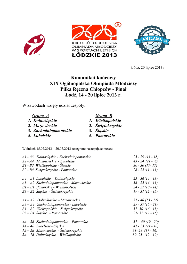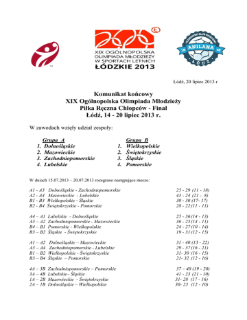 Łódź, 20 lipiec 2013 r Komunikat końcowy XIX Ogólnopolska Olimpiada Młodzieży Piłka Ręczna Chłopców - Finał Łódź, 14 - 20 lipiec 2013 r. W zawodach wzięły udział zespoły: Grupa A 1. Dolnośląskie 2. Mazowieckie 3. Zachodniopomorskie 4. Lubelskie 1. 2. 3. 4. Grupa B Wielkopolskie Świętokrzyskie Śląskie Pomorskie W dniach 15.07.2013 – 20.07.2013 rozegrano następujące mecze: A1 - A3 A2 - A4 B1 - B3 B2 - B4 Dolnośląskie - Zachodniopomorskie Mazowieckie - Lubelskie Wielkopolskie - Śląskie Świętokrzyskie - Pomorskie 25 - 29 (11 - 18) 43 - 24 (21 - 8) 30 - 30 (17- 17) 28 - 22 (11 - 11) A4 – A1 A3 – A2 B4 – B1 B3 – B2 Lubelskie - Dolnośląskie Zachodniopomorskie - Mazowieckie Pomorskie - Wielkopolskie Śląskie - Świętokrzyskie 25 - 36 (14 - 13) 36 - 25 (14 - 11) 24 - 27 (10 - 14) 19 - 31 (12 - 15) A1 – A2 A3 – A4 B1 – B2 B3 – B4 Dolnośląskie – Mazowieckie Zachodniopomorskie - Lubelskie Wielkopolskie - Świętokrzyskie Śląskie – Pomorskie 31 - 40 (13 - 22) 29 - 37 (16 - 21) 31- 30 (16 - 15) 21- 32 (12 - 16) 4A – 3B 3A – 4B 1A – 2B 2A – 1B Zachodniopomorskie – Pomorskie Lubelskie– Śląskie Mazowieckie - Świętokrzyskie Dolnośląskie – Wielkopolskie 37 – 40 (19 - 20) 41 - 23 (21 - 10) 31- 28 (17 - 16) 30- 23 (12 - 10) MECZ O 7 MIEJSCE Zachodniopomorskie – Śląskie 23:28 (11:12) Bramki dla zespołu z województwa Zachodniopomorskiego zdobyli: Trzaszczka 4, Lewandowski 3, Łutowicz 6, Wąsowski 1, Chodyniecki 1, Krysiak 8. Trener zespołu: Kejs Piotr Bramki dla zespołu z województwa Śląskiego zdobyli: Miłek 5, Dembicz 1, Walor 1, Korczyk 2, Krzak 7, Bąk 2, Ludyga 1, Cieślik 7, Michalak 1, Popczyk 1, Trener zespołu: Mikołajek Radosław Mecz sędziowali: Filipiak A. – Filipiak T. - Siemiatycze MECZ O 5 MIEJSCE Lubelskie – Pomorskie 28:34 (17:18) Bramki dla zespołu z województwa Lubelskiego zdobyli: Chajbos 3, Domański 1, Joniec 8, Gałan 3, Siemko 4, Izdebski 8, Kapłan 1. Trener zespołu: Morawski Damian Bramki dla zespołu z województwa Pomorskiego zdobyli: Łukasiewicz 7, Konkiel 6, Wierzbicki 3, Słowik 5, Kudełka 1, Czapran 1, Piekarski 8, Kwiatkowski 2, Dworaczek 1. Trener zespołu: Mońko Marek Mecz sędziowali: Kaniecki A. – Sarnowski M. - Brodnica MECZ O 3 MIEJSCE Świętokrzyskie – Wielkopolskie 36:26 (17:13) Bramki dla zespołu z województwa Świętokrzyskiego zdobyli: Mastalerz 3, Grabowski 2, Kaleta 1, Makowski 2, Szczepanik 9, Bugaj 2, Sledź 5, Siedlarz 9, Bis 2, Cioroch 1. Trener zespołu: Świętoń Janusz Bramki dla zespołu z województwa Wielkopolskiego zdobyli: Marszałęk 4, Kołtunowicz 4, Pszyszlak 5, Kaczmarek 3, Tyliński 1, Wosicki 3, Gajek 6. Trener zespołu: Hanyż Aldona Mecz sędziowali: Musiał K. – Szynklarz A. - Opole MECZ O 1 MIEJSCE Mazowieckie – Dolnośląskie 33:31 (11:16) Bramki dla zespołu z województwa Mazowieckiego zdobyli: Morawski 5, Dębiec 13, Lemaniak 5, Wypych 1, Turkowski 6, Smolarek Mariusz 2. Trener zespołu: Skórski Michał Bramki dla zespołu z województwa Dolnośląskiego zdobyli: Burzyński 1, Siwak 5, Szaynowski 3, Mauer 5, Misiurka 3, Tkaczyk 2, Cieślak 8, Stańko 1, Pedryc 3. Trener zespołu: Majchrzyk Tomasz Mecz sędziowali: Schiwon G. – Toczyński G. – Zabrze KOŃCOWA KOLEJNOŚĆ XIX OGÓLNOPOLSKIEJ OLIMPIADY MŁODZIEŻY 2013: 1. 2. 3. 4. 5. 6. 7. 8. Mazowieckie Dolnośląskie Świętokrzyskie Wielkopolskie Pomorski Lubelskie Śląskie Zachodniopomorskie NAJLEPSZY ZAWODNIK: DĘBIEC PATRYK (MAZOWIECKIE ) NAJLEPSZY BRAMKARZ: ZEMBRZYCKI MATEUSZ (DOLNOŚLĄSKIE ) KRÓL STRZELCÓW: DĘBIEC PATRYK ( MAZOWIECKIE ) Sędzia Główny Turnieju Sławomir Cłąpiński