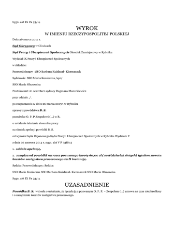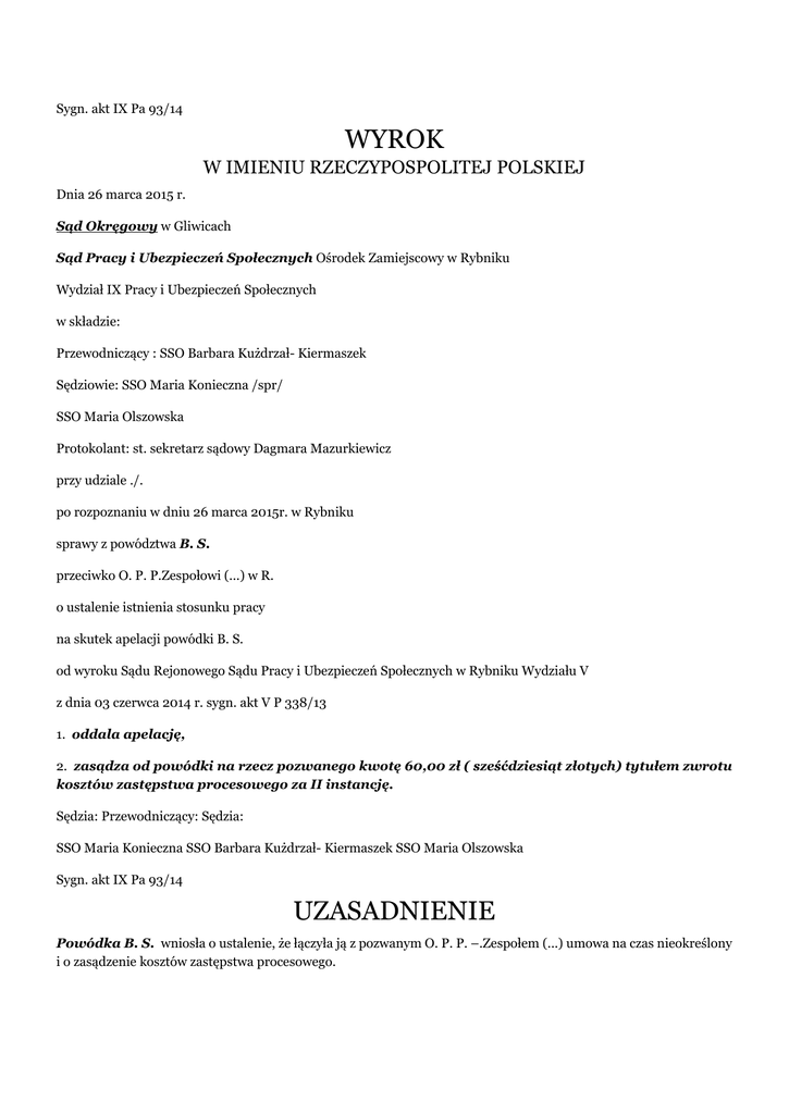 Sygn. akt IX Pa 93/14 WYROK W IMIENIU RZECZYPOSPOLITEJ POLSKIEJ Dnia 26 marca 2015 r. Sąd Okręgowy w Gliwicach Sąd Pracy i Ubezpieczeń Społecznych Ośrodek Zamiejscowy w Rybniku Wydział IX Pracy i Ubezpieczeń Społecznych w składzie: Przewodniczący : SSO Barbara Kużdrzał- Kiermaszek Sędziowie: SSO Maria Konieczna /spr/ SSO Maria Olszowska Protokolant: st. sekretarz sądowy Dagmara Mazurkiewicz przy udziale ./. po rozpoznaniu w dniu 26 marca 2015r. w Rybniku sprawy z powództwa B. S. przeciwko O. P. P.Zespołowi (...) w R. o ustalenie istnienia stosunku pracy na skutek apelacji powódki B. S. od wyroku Sądu Rejonowego Sądu Pracy i Ubezpieczeń Społecznych w Rybniku Wydziału V z dnia 03 czerwca 2014 r. sygn. akt V P 338/13 1. oddala apelację, 2. zasądza od powódki na rzecz pozwanego kwotę 60,00 zł ( sześćdziesiąt złotych) tytułem zwrotu kosztów zastępstwa procesowego za II instancję. Sędzia: Przewodniczący: Sędzia: SSO Maria Konieczna SSO Barbara Kużdrzał- Kiermaszek SSO Maria Olszowska Sygn. akt IX Pa 93/14 UZASADNIENIE Powódka B. S. wniosła o ustalenie, że łączyła ją z pozwanym O. P. P. –.Zespołem (...) umowa na czas nieokreślony i o zasądzenie kosztów zastępstwa procesowego. Powódka w uzasadnieniu podała, że w dniu 1.04.2010r. została zatrudniona przez pozwaną na podstawie umowy o pracę na czas określony w roku szkolnym 2010/2011 na stanowisku nauczyciela w wymiarze 5/18 godzin zajęć dydaktyczno –wychowawczych do 30.06.2010r. w związku z odejściem nauczyciela A. M. (1). Od kolejnego roku szkolnego powódka otrzymała nową trzyletnią umowę o pracę w niepełnym wymiarze godzin, który zwiększano z 9/18 do 11/18. Powódka była nauczycielem mianowanym. Około czerwca 2013r. zorientowała się , że zawarta z nią umowa na czas określony jest bezprawna, bo regułą jest zatrudnianie nauczycieli na czas nieokreślony, a zatrudnianie na czas określony na podstawie art. 10 Karty Nauczyciela może zależeć od uznania dyrektora placówki, w przypadku jeżeli nie zostały spełnione przesłanki uzasadniające zastępstwo nieobecnego nauczyciela . Powódka zaprzeczyła zatrudnieniu na zastępstwo podczas nieobecności nauczyciela E. B., zwłaszcza, że kiedy wróciła ona na część etatu, wymiar godzin powódki nie zmniejszył się i z umowy nie wynika, by powódka była zatrudniona na zastępstwo. Brak było przesłanek uzasadniających zawarcie z powódką umowy o pracę na czas określony. Powódka wskazała, że ma interes prawny dochodząc ustalenia istnienia umowy na czas nieokreślony. Pozwane O. P. P. –.Zespół (...)wniosło o oddalenie powództwa i o zasądzenie kosztów zastępstwa procesowego. W uzasadnieniu podało, że zaproponowało powódce umowę na okres trzech lat, bo wiedziało o planowanej długiej nieobecności E. B. – nauczyciela tańca ludowego. Zawarcie umowy na okres trzech lat było też związane ze stażem powódki na nauczyciela dyplomowanego, z koniecznością zawarcia umowy na co najmniej trzy lata. W ocenie dyrektora formalne kwalifikacje powódki nie przekładały się na specyfikę pracy placówki, praca powódki, w oczach pozwanego nie przyniosła oczekiwanych efektów. Pozwane ognisko podniosło, że zatrudnia nauczycieli młodych , którzy mają także oczekiwania związane z rodziną, z posiadaniem dzieci, a w płaszczyźnie pracodawcy ze zwolnieniami, urlopami macierzyńskimi, uzupełniającymi, wychowawczymi, z koniecznością zatrudniania na zastępstwo. Wskazało, że nie decyduje nazwa umowy, a kontekst i przydział konkretnych zadań nauczycielowi, z którym umowę nawiązuje się na podstawie art. 10 ust 7 Karty Nauczyciela, podało w jaki sposób kolejno godziny określonych nauczycieli korzystających z różnego rodzaju zwolnień były wykorzystywane by zatrudniać kolejne osoby. Wyrokiem z dnia 3.06.2014r. Sąd Rejonowy w Rybniku Sąd Pracy i Ubezpieczeń Społecznych Wydział V w pkt. 1 oddalił powództwo, w pkt. 2 zasądził od powódki na rzecz pozwanego kwotę 60,00 zł tytułem zwrotu kosztów zastępstwa procesowego. W uzasadnieniu wyroku Sąd podał, iż ustalił i zważył co następuje: Powódka B. S. uzyskała stopień nauczyciela mianowanego w dniu 21.12.2005r. , gdy ma ona wykształcenie wyższe magisterskie z przygotowaniem pedagogicznym. Świadczyła pracę w pozwanym O. P. P. –. Zespole (...) jako nauczyciel na podstawie umowy z dnia 1.04. 2010r. w wymiarze 5/18 godzin zajęć dydaktyczno- wychowawczych w tygodniu, za nieobecnego już plastyka A. M. (1) . Kolejną umową z dnia 1 września 2009r. zawartą na czas określony od dnia 1.09.2009r. do dnia 31.08.2013r. powódce powierzono stanowisko nauczyciela w wymiarze 9/18 godzin dydaktyczno – wychowawczych w tygodniu, aneksem z dnia 2.01.2011r. od tego dnia zwiększono powódce wymiar czasu pracy z 9/18 do 11/18 godzin dydaktyczno – wychowawczych w tygodniu. Przez cały czas jw. powódka pozostawała w zatrudnieniu na pełnym etacie w Kolegium Nauczycielskim w B., gdzie jest w trakcie pisania pracy doktorskiej. Powódka w dniu 1.09.2010r. rozpoczęła staż na stopień nauczyciela dyplomowanego, który na swój wniosek zgłoszony w piśmie z dnia 26.02.2013r. przerwała, uzasadniając decyzję doznawanymi licznymi przejawami mobbingu. Pismem z dnia 17.06.2013r. powódka wniosła do dyrektora pozwanego o ustalenie wymiaru etatu na rok szkolny 2013/2014, uznając, że umowa o pracę z dnia 1.09. 2010r. do dnia 31.08.2013r. jest umową na czas nieokreślony, podtrzymała swoje stanowisko w piśmie z dnia 1.09. 2013r. O. P. P. –.Zespół (...) w R. działa na podstawie ustawy o Systemie Oświaty z dnia 7.09.1991r. Organem prowadzącym jest Miasto R., a sprawującym nadzór pedagogiczny jest (...) Kurator Oświaty. Ognisko jest zakładem budżetowym rozliczającym się z wykonania budżetu z Radą Miasta R., służy potrzebom dzieci w wieku przedszkolnym, dzieci i młodzieży w wieku szkolnym i za zgodą R