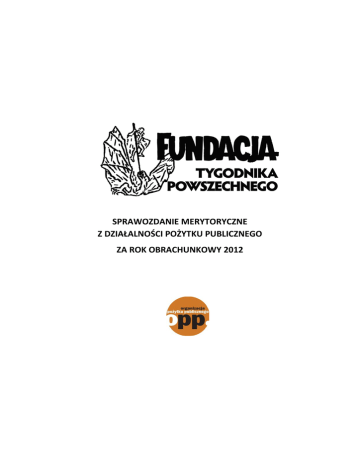 SPRAWOZDANIE MERYTORYCZNE Z DZIAŁALNOŚCI POŻYTKU PUBLICZNEGO ZA ROK OBRACHUNKOWY 2012 6\JQDWXUDVSUDZR]GDQLDZ\SHáQLD 6\JQDWXUDVSUDZR]GDQLDZ\SHáQLD03L36 MPiPS) Ministerstwo Pracy L3ROLW\NL6SRáHF]QHM 5RF]QHVSUDZR]GDQLHPHU\WRU\F]QH]G]LDáDOQRĞFL RUJDQL]DFMLSRĪ\WNXSXEOLF]QHJR za rok 2012 • • • • )RUPXODU]QDOHĪ\Z\SHáQLüZMĊ]\NXSROVNLPGUXNRZDQ\PLOLWHUDPL 6SUDZR]GDZFDZ\SHáQLDW\ONRSU]H]QDF]RQHGODQLHJRELDáHSROD :HZV]\VWNLFKS\WDQLDFKZNWyU\FKLVWQLHMHPRĪOLZRĞüZ\ERUXRGSRZLHG]LQDOHĪ\]D]QDF]\üZáDĞFLZHRGSRZLHG]L]QDNLHP; :HZV]\VWNLFKSRODFKZNWyU\FKQLHEĊGąZSLVDQHRGSRZLHGQLHLQIRUPDFMHQDOHĪ\ZVWDZLüSRMHG\QF]\]QDNP\ĞOQLND 'DWDZSá\QLĊFLDVSUDZR]GDQLD Z\SHáQLD03L36 Miejsce na notatki MPiPS ,'DQHRUJDQL]DFMLSRĪ\WNXSXEOLF]QHJR FUNDACJA TYGODNIKA POWSZECHNEGO 1. Nazwa organizacji 2. Adres siedziby i dane kontaktowe Kraj Gmina KRAKÓW POLSKA Województwo 0$à232/6.,( Powiat KRAKÓW 8OLFD:,ĝ/1$ Nr domu 12 Nr lokalu 0LHMVFRZRĞü.5$.Ï: Kod pocztowy 31-007 Poczta KRAKÓW Nr telefonu 12 4265331 Nr faksu 12 4265311 E-mail Strona www www.fundacja.tygodnik.com.pl [email protected] 3. Data rejestracji w Krajowym Rejestrze 6ąGRZ\P 'DWDX]\VNDQLDVWDWXVXRUJDQL]DFMLSRĪ\WNX publicznego 5. Numer REGON Druk: MPiPS 35655335800000 2004-11-26 6. Numer KRS 0000125605 1 6NáDGRUJDQX]DU]ąG]DMąFHJRRUJDQL]DFML 1DOHĪ\ZSLVDüLPLRQDQD]ZLVNDRUD]LQIRUPDFMHRIXQNFML SHáQLRQHMSU]H]SRV]F]HJyOQ\FKF]áRQNyZRUJDQX ]DU]ąG]DMąFHJR $OHNVDQGHU.DUG\Ğ3UH]HV=DU]ąGX &]áRQNRZLH6WDOL5DG\)XQGDFML 6NáDGRUJDQXNRQWUROLOXEQDG]RUXRUJDQL]DFML .V$GDP%RQLHFNL3U]HZRGQLF]ąF\:RMFLHFK%RQRZLF] 1DOHĪ\ZSLVDüLPLRQDQD]ZLVNDRUD]LQIRUPDFMHRIXQNFML .U]\V]WRI%XUQHWNR3LRWU0XFKDUVNL0LFKDá2NRĔVNL SHáQLRQHMSU]H]SRV]F]HJyOQ\FKF]áRQNyZRUJDQXNRQWUROL &]áRQHN1LHVWDá\5DG\)XQGDFML lub nadzoru) :RMFLHFK3LĊFLDN 9. Cele statutowe organizacji 1DOHĪ\RSLVDüFHOHQDSRGVWDZLHVWDWXWXRUJDQL]DFML Druk: MPiPS &HODPL)XQGDFMLVą D3RJáĊELDQLHLSURPRZDQLHGHPRNUDW\F]QHJRPRGHOXĪ\FLD VSRáHF]QHJRRSDUWHJRQDFKU]HĞFLMDĔVNLFKZDUWRĞFLDFK E3URSDJRZDQLHPRGHOXGLDORJXVSRáHF]QHJRLUR]ZRMXSRGVWDZ LQVW\WXFMLVSRáHF]HĔVWZDRE\ZDWHOVNLHJR F3URSDJRZDQLHLSRJáĊELDQLHLGHLZROQRĞFLVáRZDRUD]ZROQ\FKL QLH]DOHĪQ\FKĞURGNyZPDVRZHJRSU]HND]X G3RJáĊELDQLHLSURPRZDQLHF]\WHOQLFWZDLHGXNDFMLPLQSRSU]H] ĞURGNLPDVRZHJRSU]HND]XG]LDáDOQRĞüZ\GDZQLF]ąLQRZH technologie; e) Promowanie modelu integracji europejskiej opartego na MXGHRFKU]HĞFLMDĔVNLFKZDUWRĞFLDFKNXOWXU\HXURSHMVNLHM I3RJáĊELDQLHLSURPRZDQLHNXOWXU\LQDXNLSROVNLHMZ(XURSLHLQD ĞZLHFLH J'RNXPHQWRZDQLHLDUFKLZL]RZDQLHNDWROLFNLHJRĪ\FLD VSRáHF]QHJRNXOWXUDOQHJRLQDXNRZHJR K,QVSLURZDQLHG]LDáDOQRĞFLLVSUDZRZDQLHSLHF]\QDGG]LDáDOQRĞFLą LUR]ZRMHPVSyáNL7\JRGQLN3RZV]HFKQ\6S]RR]VLHG]LEąZ .UDNRZLHRUD]VSyáHN]DOHĪQ\FKRGVSyáNL7\JRGQLN3RZV]HFKQ\ 6S]RR]VLHG]LEąZ.UDNRZLHDWDNĪHIXQGDFMLLVWRZDU]\V]HĔ XWZRU]RQ\FKSU]H]OXEZNWyU\FKELHU]HXG]LDáVSyáND7\JRGQLN 3RZV]HFKQ\6S]RR]VLHG]LEąZ.UDNRZLH L)LQDQVRZHZVSLHUDQLHG]LDáDOQRĞFLZ\GDZQLF]HMVSyáNL7\JRGQLN 3RZV]HFKQ\6S]RR]VLHG]LEąZ.UDNRZLH M:VSLHUDQLHUR]ZRMXNXOWXU\LQDXNLFKU]HĞFLMDĔVNLHMRUD] FKU]HĞFLMDĔVNLFKPHGLyZZ3ROVFH 2 10. Sposób realizacji celów statutowych organizacji 1DOHĪ\RSLVDüVSRVyEUHDOL]DFMLFHOyZVWDWXWRZ\FK organizacji na podstawie statutu organizacji) 1DMZDĪQLHMV]HVIHU\G]LDáDOQRĞFLSRĪ\WNX publicznego 1DOHĪ\ZVND]DüQLHZLĊFHMQLĪWU]\QDMZDĪQLHMV]HSRG Z]JOĊGHPZLHONRĞFLZ\GDWNRZDQ\FKĞURGNyZVIHU\ G]LDáDOQRĞFLSRĪ\WNXSXEOLF]QHJRRNWyU\FKPRZDZDUW XVWXVWDZ\]GQLDNZLHWQLDURG]LDáDOQRĞFL SRĪ\WNXSXEOLF]QHJRLRZRORQWDULDFLH(Dz. U. z 2010 r. Nr 234, poz. 1536), ]DF]\QDMąFRGQDMZDĪQLHMV]HM Fundacja realizuje swe cele poprzez: D']LDáDOQRĞüHGXNDF\MQąZ\GDZQLF]ąOLWHUDFNąLDUW\VW\F]QąRUD] SU]H]SURPRZDQLHWDNLHMG]LDáDOQRĞFL b) Finansowanie prac wydawniczych i redakcyjnych, a w V]F]HJyOQRĞFLRSUDFRZDĔSXEOLF\VW\F]Q\FKLUHSRUWHUVNLFKGHEDW redakcyjnych przeznaczonych do publikacji, wystroju graficznego wydawnictw, zaplecza technicznego redakcji, redakcyjnych Z\MD]GyZ]DJUDQLF]Q\FKG]LDáDOQRĞFLSURPRF\MQHMLLQQHMSRGREQHM G]LDáDOQRĞFL F,QLFMRZDQLHLRUJDQL]RZDQLHDNFMLZFHOXSR]\VNLZDQLDĞURGNyZ do realizacji celów statutowych Fundacji; d) Udzielanie stypendiów i nagród; H3URSDJRZDQLHLG\VWU\EXFMĊSXEOLNDFMLRUD]G]LHáQDXNLLV]WXNL NWyU\FKFKDUDNWHUMHVW]ELHĪQ\]FHODPL)XQGDFMLRNUHĞORQ\PLZ niniejszym Statucie; I2UJDQL]RZDQLHVSRWNDĔV\PSR]MyZNXUVyZNRQNXUVyZ NXOWXUDOQ\FKLDUW\VW\F]Q\FKRUD]LPSUH]SURPXMąF\FKFHOHG]LDáDQLD Fundacji; J2UJDQL]RZDQLHLSURZDG]HQLHELEOLRWHNDUFKLZyZRUD]RĞURGNyZ dokumentacji; K2SLHNĊQDG]DVáXĪRQ\PLWZyUFDPL]ZLą]DQ\PL]SLVPHP 7\JRGQLN3RZV]HFKQ\]QDMGXMąF\PLVLĊZWUXGQHMV\WXDFML materialnej; L:VSyáSUDFĊ]RVREDPLSUDZQ\PLLIL]\F]Q\PLZNUDMXL]DJUDQLFą NWyU\FKFHOHVą]ELHĪQH]FHODPL)XQGDFML M:VSLHUDQLHQLHGRFKRGRZ\FKLQVW\WXFMLSURZDG]ąF\FKG]LDáDOQRĞü ]JRGQą]FHODPL)XQGDFML k) Organizowanie i finansowanie odczytów, seminariów, V\PSR]MyZZDUV]WDWyZLV]NROHĔMDNUyZQLHĪG]LDáDOQRĞFL RĞZLDWRZHMRUD]SURSDJRZDQLDLZ\PLDQ\GRĞZLDGF]HĔZ]DNUHVLH REMĊW\PFHODPL)XQGDFML O2UJDQL]RZDQLHLILQDQVRZDQLHVWDĪ\SUDNW\NLZ\MD]GyZ VW\SHQGLDOQ\FKGODRVyE]DDQJDĪRZDQ\FKZG]LDáDOQRĞüZ]DNUHVLH REMĊW\PFHODPL)XQGDFML P:VSyáSUDFĊ]RVREDPLLLQVW\WXFMDPLNUDMRZ\PLL]DJUDQLF]Q\PL SURZDG]ąF\PLG]LDáDOQRĞüRFKDUDNWHU]HWRĪVDP\P]FHODPL Fundacji; Q6NXSLDQLHZRNyáLGHL)XQGDFMLRVyE]DLQWHUHVRZDQ\FKMHMFHODPL ZW\PSU]HGVWDZLFLHOLĞURGRZLVNQDXNRZ\FKLHGXNDF\MQ\FKZNUDMX L]DJUDQLFą kultura, sztuka, ochrona dóbr kultury i dziedzictwa narodowego XSRZV]HFKQLDQLHLRFKURQDZROQRĞFLLSUDZF]áRZLHNDRUD]VZREyG RE\ZDWHOVNLFKDWDNĪHG]LDáDQLDZVSRPDJDMąFHUR]ZyMGHPRNUDFML SURPRFMD5]HF]\SRVSROLWHM3ROVNLHM]DJUDQLFą ,,&KDUDNWHU\VW\NDG]LDáDOQRĞFLRUJDQL]DFMLSRĪ\WNXSXEOLF]QHJRZRNUHVLHVSUDZR]GDZF]\P 2SLVG]LDáDOQRĞFLSRĪ\WNXSXEOLF]QHJR :ĞUyGJáyZQ\FKG]LDáDĔSRGMĊW\FKSU]H])XQGDFMĊZURNX2011]QDOD]á\VLĊ QDVWĊSXMąFHSURMHNW\ 12UJDQL]DFMD,9(G\FML0LĊG]\QDURGRZHJR)HVWLZDOX/LWHUDWXU\LP-&RQUDGD w Krakowie &HOHPSURMHNWXE\áDSURPRFMDF]\WHOQLFWZDRUD]ZDUWRĞFLRZHMOLWHUDWXU\SRSU]H] jej osadzenie w praktykach codziennych, zakotw