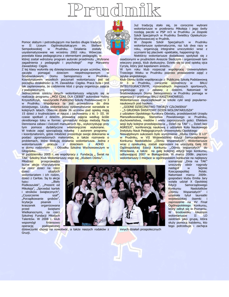 Pomoc słabym i potrzebującym ma bardzo długie tradycje w II Liceum Ogólnokształcącym im. Stefanii Sempołowskiej w Prudniku. Działania zostały usystematyzowane we wrześniu 2002 roku. Wówczas powstała klasa pedagogiczna z elementami pedagogiki, w której został wdroŜony program autorski przedmiotu ,,Wybrane zagadnienia z pedagogiki i psychologii" mgr Marzanny Zawadzkiej- Ciępki. Z tej klasy wyłoniła się dziesięcioosobowa grupa uczniów, która zaczęła pomagać dzieciom niepełnosprawnym w Środowiskowym Domu Samopomocy w Prudniku. Koordynatorem wszelkich poczynań wolontariuszy jest od początku działalności p. M. Zawadzka- Ciępka. Praca była i jest tak zaplanowana, Ŝe codziennie ktoś z grupy organizuje zajęcia z podopiecznymi. Jednocześnie sześciu innych wolontariuszy włączyło się w realizację programu ,,MÓJ CZAS DLA CIEBIE" autorstwa Haliny Krzysztofczyk, nauczycielki Publicznej Szkoły Podstawowej nr 3 w Prudniku. Współpraca ta jest prowadzona do dnia dzisiejszego. Liczba wolontariuszy systematycznie wzrastała w kolejnych latach. Obecnie działa 36 uczniów pod opieką mają 15 dzieci z trudnościami w nauce i zachowaniu z kl. I- III. W czasie spotkań z dziećmi prowadzą zajęcia według ściśle określonego toku w formie: gimnastyki mózgu metodą Paula Dennisona zabaw i ćwiczeń manualnych itp., wykorzystując przy tym pomoce dydaktyczne własnoręcznie wykonane. W trakcie zajęć sporządzają notatkę i autorem programu i koordynatorem, gdzie młodzieŜ prezentuje swoje dokonania w postaci zgromadzonych materiałów, a takŜe rozmawia o problemach, które blokują działania wolontariusza. Jedna z wolontariuszek pracuje z dzieckiem z ADHD w domu rodzinnym i Ośrodku Szkolno Wychowawczym w Głogówku. W październiku 2005 r. we współpracy z Fundacją ,, Świat na TAK" Szkolny Klub Wolontariuszy staje się ,,Klubem Ośmiu". MłodzieŜ przeprowadza liczne akcje charytatywne na rzecz dzieci na rzecz dzieci objętych wolontariatem i ich rodzin, dzieci z Caritas. Są to akcje typu: ,,Biały Podkoszulek", ,,Prezent od Mikołaja", „SprzedaŜ kartek i stroików świątecznych”, „Czyszczenie szaf”, „Porządkowanie grobów”, licytacja pisanek i kraszanek organizowana przed świętami Wielkanocnymi, na rzecz Szkolnej Fundacji Młodych Talentów. W 2008 r. klub wspomógł finansowo operację podopiecznej dziewczynki chorej na nowotwór, a takŜe naszych rodaków z Gruzji. JuŜ tradycją stało się, Ŝe corocznie wybrani wolontariusze w przebraniu Mikołaja i jego świty rozdają paczki w PSP nr3 w Prudniku ,w Zespole Szkół Specjalnych w Prudniku Świetlicy OpiekuńczoWychowawczej w Prudnik. W Zespole Szkół Specjalnych w Prudniku wolontariusze systematycznie, raz lub dwa razy w roku, organizują integralne uroczystości wraz z uczniami tej placówki -spektakle, happeningi itp. Niektórzy wolontariusze dodatkowo spotykali się z osadzonymi w prudnickim Areszcie Śledczym i organizowali tam wieczory poezji, klub dyskusyjny. Dzieło się to pod opieką ojca Cyryla, który jest kapelanem aresztu. W tym roku klub rozpoczął współpracę Uniwersytetem Trzeciego Wieku w Prudniku poprzez prowadzenie zajęć z języka angielskiego. Klub Ośmiu ściśle współpracuje z Publiczną Szkołą Podstawową nr 3 w Prudniku, corocznie uczestniczy w BALU INTEGTEGRACYJNYM, róŜnorodnych imprezach sportowych, organizując gry i zabawy z dziećmi. Natomiast W Środowiskowym Domu Samopomocy w Prudniku pomaga w organizacji i przebiegu BALU KASZTANOWEGO. Wolontariusze zapoczątkowali w szkole cykl sesji popularnonaukowych pod hasłem: - ,,GODNE DZIECIŃSTWO TWORZY CZŁOWIEKA" - ,,5 GRUDNIA ŚWIATOWY DZIEŃ WOLONTARIUSZA" z udziałem Opolskiego Kuratora Oświaty, przedstawicieli Urzędu Marszałkowskiego, Starostwa Powiatowego w Prudniku, duchowieństwa, mediów i wielu zaproszonych gości. Efektem sesji były kolejne przedsięwzięcia ,, Dzień na TAK" i ,, Dzień bez AGRESJI", konferencję naukową z udziałem Koła Naukowego Instytutu Nauk Pedagogicznych Uniwersytetu Opolskiego Niewątpliwym sukcesem było wyróŜnienie ,,Klubu Ośmiu II LO" w Prudniku, w VII Wojewódzkiej Edycji Samorządowego Konkursu Nastolatków ,,Ośmiu Wspaniałych". Wolontariusze wraz z opiekunką, zostali zaproszeni na uroczystą Galę XII Ogólnopolskiej Edycji Konkursu ,,Ośmiu wspaniałych" do Wrocławia, a takŜe na galę kolejnej edycji tego konkursu, odbywającej 2007 w Białogardzie. W marcu 2008r. pięcioro wolontariuszy I miejsce w ogólnopolskim konkursie na najlepszy scenariusz „Dnia na TAK” uroczysty obiór nagrody nastąpił w Sejmie Rzeczpospolitej Polski. Natomiast marcu 2009r. gospodarz klubu Emilia Jary wzięła udział X Opolskiej Edycji Samorządowego Konkursu Nastolatków „Ośmiu Wspaniałych” i uzyskała tytuł laureatki wojewódzkiej ósemki i zaproszenie na XV Finał Ogólnopolskiego Konkursu, który odbył się w Poznaniu. W środowisku lokalnym wolontariusze II LO zaistnieli jako grupa, która słuŜy pomocą kaŜdemu, kto tego potrzebuje i zachęca innych działań prospołecznych