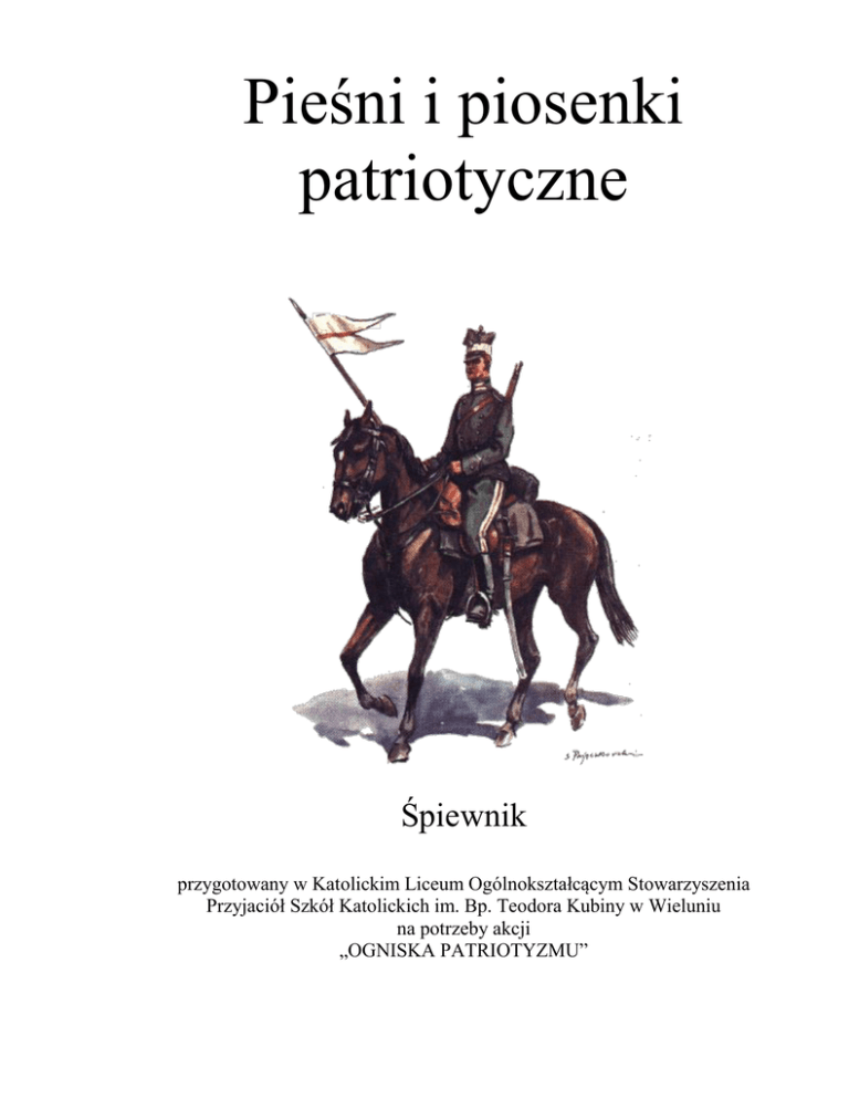 Pieśni i piosenki patriotyczne Śpiewnik przygotowany w Katolickim Liceum Ogólnokształcącym Stowarzyszenia Przyjaciół Szkół Katolickich im. Bp. Teodora Kubiny w Wieluniu na potrzeby akcji „OGNISKA PATRIOTYZMU” Spis treści 1. Płonie ognisko ______________________________________________ 3 2. Maszerują strzelcy (Piechota) __________________________________ 4 3. Białe róże __________________________________________________ 5 4. Deszcz jesienny ______________________________________________ 6 5. Dziś do Ciebie przyjść nie mogę _________________________________ 7 6. Hej, chłopcy, bagnet na broń ___________________________________ 8 7. Jak długo w sercach naszych ___________________________________ 9 8. Bartoszu, Bartoszu __________________________________________ 10 9. Modlitwa partyzancka _______________________________________ 11 10. Ojczyzno ma ______________________________________________ 12 11. O mój rozmarynie __________________________________________ 13 12. Marsz Pierwszej Brygady ____________________________________ 14 13. Kadrówka ________________________________________________ 15 14. Przybyli ułani pod okienko ___________________________________ 16 15. Wojenko, wojenko, cóżeś ty za pani ____________________________ 17 16. Kalina, malina ____________________________________________ 18 17. Z młodej piersi się wyrwało __________________________________ 19 18. Ułan ____________________________________________________ 20 19. Po ten kwiat czerwony ______________________________________ 21 20. Kujawiak partyzancki _______________________________________ 22 21. Sadźmy róże ______________________________________________ 23 22. Rota _____________________________________________________ 24 2 1. Płonie ognisko I. Płonie ognisko i szumią knieje Drużynowy jest wśród nas Opowiada starodawne dzieje Bohaterski wskrzesza czas d A7 d A7 d d A7 d g A7 d II. O rycerstwie spod kresowych stanic O obrońcach naszych polskich granic A ponad nami wiatr szumny wieje I dębowy huczy las III. Już do odwrotu głos trąbki wzywa Alarmując ze wszech stron Wstaje wiara w ordynku szczęśliwa Serca biją zgodny ton IV. Każda twarz się w uniesieniu płoni Każdy laskę krzepko dzierży w dłoni A z młodzieńczej się piersi wyrywa Pieśń potężna, pieśń jak dzwon. 3 ( C) FC g A7 d A7 dA7 d g A7 d (C) 2. Maszerują strzelcy (Piechota) Piosenka powstała w 1918 r. i została najbardziej popularną pieśnią międzywojenną, kampanii wrześniowej, sił zbrojnych na Zachodzie i oddziałów partyzanckich w kraju. Na podstawie jej melodii powstało wiele piosenek w kraju i na Zachodzie. Inny tytuł: "Piechota". Autor - Leon Łuskino (1817-1948) - legionista, oficer Wojska Polskiego, kompozytor, aktor teatrzyku "Qui pro quo", grał i śpiewał. Niektórzy twierdzą, że autorem słów jest Bolesław Lubicz- Zachorski. "Szary ich strój" - mundury koloru szarego nosiła piechota wywodząca się z Legionów. Kolor ten jest symbolem skromności, poświęcenia i dzielności żołnierskiej tej formacji. I. Nie noszą lampasów, lecz szary ich strój, Nie noszą ni srebra, ni złota, Lecz w pierwszym szeregu podąża na bój, Piechota ta szara piechota. Ref. Maszerują strzelcy, maszerują, Karabiny błyszczą, szary strój A przed nimi drzewa salutują, Bo za naszą Polskę idą w bój! II. Idą, a w słońcu kołysze się stal, Dziewczęta zerkają zza płota, A oczy ich dumne utkwione są w dal, Piechota, ta szara piechota. Ref. ….. III. Nie grają im surmy, nie huczy im róg, A śmierć im pod stopy się miota, Lecz w pierwszym szeregu podąża na bój, Piechota, ta szara piechota. Ref. ….. 4 d gd gd A7 d dgd A7 d dgd A7 d A7 d 3. Białe róże I. Rozkwitały pąki białych róż, wróć Jasieńku, z tej wojenki wróć, wróć, ucałuj, jak za dawnych lat, dam ci za to róży najpiękniejszy kwiat. bis a E7 a FC da E7 a E7 / a II. Ponad stepem nieprzejrzana mgła, wiatr w burzanach cichuteńko łka. Przyszła zima, opadł róży kwiat, poszedł w świat Jasieńko, zginął za nim ślad. III. Już przekwitły pąki białych róż, przyszło lato, jesień, zima już. Cóż ci teraz dam, Jasieńku, hej, gdy z wojenki wrócisz do dziewczyny swej? IV. Jasieńkowi nic nie trzeba już, bo mu kwitną pąki białych róż; tam pod jarem, gdzie w wojence padł, wyrósł na mogile białej róży kwiat. V. Nie rozpaczaj, lube dziewczę, nie, w polskiej ziemi nie będzie mu źle. Policzony będzie trud i znój, za Ojczyznę poległ ukochany twój. 5 4. Deszcz jesienny Słowa: Marian Matyszkiewicz "Rysiek" Muzyka: melodia z opery "Poławiacze pereł" Georgesa Bizeta Autor - żołnierz AK zginął w 1944 r. w obozie w Stutthofie. Był absolwentem liceum im. Górskiego w Warszawie. Na Kresy piosenka trafiła z Uderzeniowym Batalionem Kadrowym działającym pod dowództwem B.Piaseckego. Deszcz jesienny, deszcz, smutne pieśni gra. Mokną na nim karabiny, hełmy kryje rdza. Nieś po błocie w dal, w zachlapany świat, Przemoczone pod plecakiem osiemnaście lat. CeFC GCGC FCFC GCGC Deszcz jesienny, deszcz, bębni w hełmu stal. Idziesz młody żołnierzyku gdzieś w nieznaną dal. Może dobry Bóg da, że wrócisz znów, Będziesz tulił ciemną główkę miłej swej do snu. Gdzieś daleko stąd, mrok zapada znów, Ciemna główka mej dziewczyny chyli się do snu. Może właśnie gdzieś, patrzy w mroczną mgłę I modlitwą prosi Boga, by zachował Cię. Deszcz jesienny, deszcz, bębni w hełmu stal. Idziesz młody żołnierzyku gdzieś w nieznaną dal. Może dobry Bóg da, że wrócisz znów, Będziesz tulił ciemną główkę miłej swej do snu. 6 5. Dziś do Ciebie przyjść nie mogę Autor: Stanisław Magierski. Pierwotny tytuł „Kołysanka”- powstała zimą 1943 roku. Skomponowana specjalnie dla lubelskiego partyzanckiego oddziału „Nerwy” I. Dziś do Ciebie przyjść nie mogę, Zaraz idę w nocy mrok. Nie wyglądaj za mną oknem, W mgle utonie próżno wzrok. Po cóż Ci