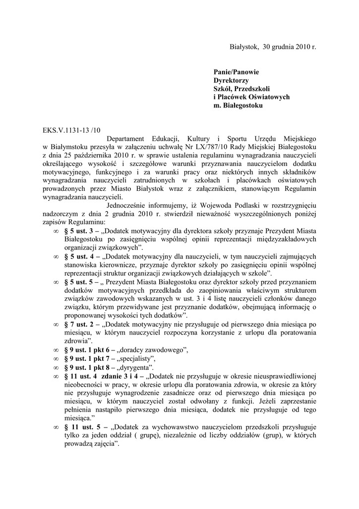 Białystok, 30 grudnia 2010 r. Panie/Panowie Dyrektorzy Szkół, Przedszkoli i Placówek Oświatowych m. Białegostoku EKS.V.1131-13 /10 Departament Edukacji, Kultury i Sportu Urzędu Miejskiego w Białymstoku przesyła w załączeniu uchwałę Nr LX/787/10 Rady Miejskiej Białegostoku z dnia 25 października 2010 r. w sprawie ustalenia regulaminu wynagradzania nauczycieli określającego wysokość i szczegółowe warunki przyznawania nauczycielom dodatku motywacyjnego, funkcyjnego i za warunki pracy oraz niektórych innych składników wynagradzania nauczycieli zatrudnionych w szkołach i placówkach oświatowych prowadzonych przez Miasto Białystok wraz z załącznikiem, stanowiącym Regulamin wynagradzania nauczycieli. Jednocześnie informujemy, iŜ Wojewoda Podlaski w rozstrzygnięciu nadzorczym z dnia 2 grudnia 2010 r. stwierdził niewaŜność wyszczególnionych poniŜej zapisów Regulaminu: • § 5 ust. 3 – „Dodatek motywacyjny dla dyrektora szkoły przyznaje Prezydent Miasta Białegostoku po zasięgnięciu wspólnej opinii reprezentacji międzyzakładowych organizacji związkowych”. • § 5 ust. 4 – „Dodatek motywacyjny dla nauczycieli, w tym nauczycieli zajmujących stanowiska kierownicze, przyznaje dyrektor szkoły po zasięgnięciu opinii wspólnej reprezentacji struktur organizacji związkowych działających w szkole”. • § 5 ust. 5 – „ Prezydent Miasta Białegostoku oraz dyrektor szkoły przed przyznaniem dodatków motywacyjnych przedkłada do zaopiniowania właściwym strukturom związków zawodowych wskazanych w ust. 3 i 4 listę nauczycieli członków danego związku, którym przewidywane jest przyznanie dodatków, obejmującą informację o proponowanej wysokości tych dodatków”. • § 7 ust. 2 – „Dodatek motywacyjny nie przysługuje od pierwszego dnia miesiąca po miesiącu, w którym nauczyciel rozpoczyna korzystanie z urlopu dla poratowania zdrowia”. • § 9 ust. 1 pkt 6 – „doradcy zawodowego”, • § 9 ust. 1 pkt 7 – „specjalisty”, • § 9 ust. 1 pkt 8 – „dyrygenta”. • § 11 ust. 4 zdanie 3 i 4 – „Dodatek nie przysługuje w okresie nieusprawiedliwionej nieobecności w pracy, w okresie urlopu dla poratowania zdrowia, w okresie za który nie przysługuje wynagrodzenie zasadnicze oraz od pierwszego dnia miesiąca po miesiącu, w którym nauczyciel został odwołany z funkcji. JeŜeli zaprzestanie pełnienia nastąpiło pierwszego dnia miesiąca, dodatek nie przysługuje od tego miesiąca.” • § 11 ust. 5 – „Dodatek za wychowawstwo nauczycielom przedszkoli przysługuje tylko za jeden oddział ( grupę), niezaleŜnie od liczby oddziałów (grup), w których prowadzą zajęcia”. • • § 16 ust. 8 – „Godziny ponadwymiarowe przydzielone w planie organizacyjnym, nie zrealizowane przez nauczyciela z przyczyn leŜących po stronie pracodawcy, w tym zwłaszcza w związku z zawieszeniem zajęć z powodu epidemii i mrozów, traktuje się jak godziny faktycznie odbyte”. § 16 ust. 9 - „Dla ustalenia liczby godzin ponadwymiarowych, za które przysługuje wynagrodzenie w tygodniach, w których przypadają dni usprawiedliwionej nieobecności w pracy lub dni ustawowo wolne od pracy oraz w tygodniach, w których zajęcia rozpoczynają się i kończą w środku tygodnia, przyjmuje się obowiązkowy tygodniowy wymiar godzin pomniejszony o 1/5 tego wymiaru (lub o ¼ gdy dla nauczyciela ustalono czterodniowy tydzień pracy) lub dzień ustawowo wolny od pracy. Liczba godzin ponadwymiarowych w takim tygodniu nie moŜe być większa niŜ liczba godzin przydzielonych w planie organizacyjnym”. W związku z powyŜszym wyŜej wymieniony Regulamin wynagradzania nauczycieli naleŜy stosować z wyłączeniem uchylonych zapisów. DYREKTOR Departamentu Edukacji, Kultury i Sportu Wojciech Janowicz