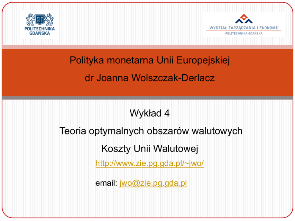 Polityka monetarna Unii Europejskiej dr Joanna Wolszczak-Derlacz Wykład 4 Teoria optymalnych obszarów walutowych Koszty Unii Walutowej http://www.zie.pg.gda.pl/~jwo/ email: [email protected] Teoria optymalnych obszarów walutowych (theory of optimum currency areas - OCA)  analiza kosztów i korzyści z unii walutowej  OCA określa warunki jakie muszą spełniać kraje, aby było dla nich opłacalne: 1. Elastyczność cen i płac (Mundell 1961) 2. Mobilność środków produkcji (Mundell 1961) 3. Otwartość gospodarki (McKinon 1963) 4. Dywersyfikaja gospodarki (Kenen 1969) Analiza w oparciu o badania Robert Mundella(1961)  Model: dwa kraje Francja i Niemcy  Sytuacja: szok asymetryczny tzn.  Spadek zagregowanego popytu we Francji  Wzrost zagregowanego popytu w Niemczech Analiza obejmuje dwa warianty  1. 2. Niezależność walutowa Unia walutowa 1. Niezależność walutowa Francja PF Niemcy P SF SG G DF YF DG Y G - Spadek zagregowanego popytu we Francji prowadzi do …….? - Wzrost zagregowanego popytu w Niemczech prowadzi do …..? Co można zrobić w przypadku niezależności walutowej ? 2. Unia walutowa Francja PF Niemcy P SF SG G DF YF DG Y G Co można zrobić w przypadku unii walutowej ? A. Automatyczny proces dostosowawczy oparty na elastyczności płac i cen Francja Niemcy PF P G YF Y G B. Efekt mobilności siły roboczej Francja PF Niemcy P SF SG G DF YF DG Y G Udział obcokrajowców w całkowitej populacji w %, 2013 Źródło: Eurostat Efekt mobilności siły roboczej - problemy  Mobilność pracowników ograniczona w Europie (np.w porównaniu z USA)  Różna w zależności od typu pracowników (wysoko-, niskowykwalifikowanych)  Główne przyczyny: bariery językowe, krajowe systemy ubezpieczeń i świadczeń społecznych … C. Publiczny i prywatny system zabezpieczeń 1. Publiczny system zabezpieczeń  Centralny budżet który automatycznie uruchamia transfery pomiędzy krajami Unii Może przeciwdziałać szokom Budżet UE to ok. 1% PKB Unijnego – czy spełnia taka rolę?  Elastyczne budżety krajowe: Francja pożycza pieniądze od Niemiec Problem długu publicznego Co oznacza dla przyszłych pokoleń Francuzów i Niemców? 2. Prywatny system zabezpieczeń  Zintegrowane rynki kapitałowe pozwalają na automatyczne zabezpieczenie przed skutkami szoku  Przykład: giełda  ale – zabezpieczenie głównie dla bogatych Wnioski  Kraje w unii walutowej narażone na szoki asymetryczne potrzebują elastyczności płac i mobilności siły roboczej w celu dostosowania się do skutków szoku  Pomocny może być system zabezpieczeń, który zezwala na transfery finansowe do kraju negatywnie doświadczonego przez szok  System zabezpieczeń nie jest wystarczający, gdy szok jest permanentny, ale daje krajom czas na dostosowanie się  Koszty unii walutowej mogą być duże, jeśli występują sztywne płace, niska mobilność Przyczyny problemów w unii walutowej 1. Szoki popytowe 2. Szoki podażowe 3. Różne preferencje co do poziomu inflacji i bezrobocia 4. Różnice w rynkach pracy 5. Różnice w systemach prawnych 6. Różnice stóp wzrostu gospodarczego 7. Różne systemy fiskalne i problem senioratu Różne preferencje co do poziomu inflacji i bezrobocia  Dwa kraje Włochy i Niemcy p w  Ww  q w p N  WN  q N gdzie p – stopa inflacji, W – stopa wzrostu płac, q – stopa wzrostu wydajności pracy  Hipoteza parytetu stóp procentowych  Analiza w oparciu o krzywą Philipsa e  pw  p N . wG Niemcy C B . pG Włochy . qG e . UG 0 wI A C’ . pI . qI 0 Źródło: De Grauwe, 2000, Unia Walutowa, s.23 UI Różnice w zorganizowaniu rynków pracy  pozycja związków zawodowych  Instytucje rynku pracy  Centralne i decentralne negocjacje płacowe Uzwiązkowienie, % zatrudnionych będących członkami związków zawodowych, 2010 Źródło: OECD, trade union density Bezpieczeństwo zatrudnienia, 2013 Indeks od 0 (najbardziej liberalne regulacje) do 6 (najbardziej restrykcyjne regulacje) Źródło: OECD, employment protection Różnice w systemach prawnych  Odnośnie rynków kredytów hipotecznych  Odnośnie dostosowania bankowych stóp procentowych  Odnośnie pozyskiwania środków kapitałowych przez przedsiębiorstwa Różnice stóp wzrostu gospodarczego Realna stopa wzrostu gospodarczego w 2013, w % Źródło: obliczenia własne na podstawie danych z Eurostatu Różne systemy fiskalne Deficyt budżetowy jako % PKB, 2013 2 0 -2 -4 -6 -8 -10 -12 -14 -16 Źródło: dane z Eurostatu Dochody z senioratu G  T  rB  B  M gdzie: G – wydatki budżetowe T – podatki r – koszty obsługi długu publicznego B – dług publiczny M – wielkość bazy monetarnej Seniorat (renta emisyjna) - suma wszystkich dochodów, będących rezultatem monopolu banku centralnego na prowadzenie polityki pieniężnej i emisję pieniądza; dochód z tytułu emisji pieniądza przez bank centralny, wg. Cukrowski (2001) w Europie Zach (0.5 – 1.5% PKB), Europa Pd (2-4% PKB) Szok symetryczny - analiza Francja Niemcy PF P G YF Y G Szoki symetryczne i asymetryczne - porównanie  Gdy szoki są asymetryczne  Unia walutowa przyczynia się do powstania kosztów w stosunku do niezależności walutowej  Wspólny centralny bank nie potrafi z nimi walczyć  Gdy szoki są symetryczne :  Unia walutowa staje się bardziej atrakcyjna  Wspólny centralny bank potrafi z nimi walczyć Pytania Jak można przeciwdziałać asymetrycznym szokom przy niezależności monetarnej? Jak można przeciwdziałać asymetrycznym szokom w unii walutowej? Dlaczego asymetryczne szoki są niebezpieczne dla członków unii walutowej? Źródła literaturowe De Grauwe P. (2003) Unia Walutowa, PWE Materiały do książki De Grauwe P. (2009) Economics of Monetary Union, Oxford University Press: http://www.oup.com:80/uk/orc/bin/9780199563234/