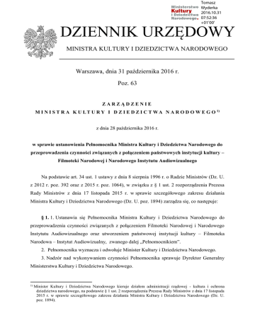 Tomasz Wyderka 2016.10.31 07:52:36 +01'00' DZIENNIK URZĘDOWY MINISTRA KULTURY I DZIEDZICTWA NARODOWEGO Warszawa, dnia 31 października 2016 r. Poz. 63 ZARZĄDZENIE M I N I S T R A K U L T U R Y I D Z I E D Z I C T W A N A R O D O W E G O 1) z dnia 28 października 2016 r. w sprawie ustanowienia Pełnomocnika Ministra Kultury i Dziedzictwa Narodowego do przeprowadzenia czynności związanych z połączeniem państwowych instytucji kultury – Filmoteki Narodowej i Narodowego Instytutu Audiowizualnego Na podstawie art. 34 ust. 1 ustawy z dnia 8 sierpnia 1996 r. o Radzie Ministrów (Dz. U. z 2012 r. poz. 392 oraz z 2015 r. poz. 1064), w związku z § 1 ust. 2 rozporządzenia Prezesa Rady Ministrów z dnia 17 listopada 2015 r. w sprawie szczegółowego zakresu działania Ministra Kultury i Dziedzictwa Narodowego (Dz. U. poz. 1894) zarządza się, co następuje: § 1. 1. Ustanawia się Pełnomocnika Ministra Kultury i Dziedzictwa Narodowego do przeprowadzenia czynności związanych z połączeniem Filmoteki Narodowej i Narodowego Instytutu Audiowizualnego oraz utworzeniem państwowej instytucji kultury – Filmoteka Narodowa – Instytut Audiowizualny, zwanego dalej „Pełnomocnikiem”. 2. Pełnomocnika wyznacza i odwołuje Minister Kultury i Dziedzictwa Narodowego. 3. Nadzór nad wykonywaniem czynności Pełnomocnika sprawuje Dyrektor Generalny Ministerstwa Kultury i Dziedzictwa Narodowego. 1) Minister Kultury i Dziedzictwa Narodowego kieruje działem administracji rządowej - kultura i ochrona dziedzictwa narodowego, na podstawie § 1 ust. 2 rozporządzenia Prezesa Rady Ministrów z dnia 17 listopada 2015 r. w sprawie szczegółowego zakresu działania Ministra Kultury i Dziedzictwa Narodowego (Dz. U. poz. 1894). Dziennik Urzędowy Ministra Kultury i Dziedzictwa Narodowego § 2. 1. Pełnomocnik podejmuje -2- czynności Poz. 63 niezbędne do przygotowania i przeprowadzenia połączenia państwowych instytucji kultury – Filmoteki Narodowej i Narodowego Instytutu Audiowizualnego, zwanych dalej „łączonymi instytucjami kultury” oraz utworzenia państwowej instytucji kultury – Filmoteka Narodowa – Instytut Audiowizualny, zwanego dalej „FInA”, w szczególności w zakresie: 1) nadzorowania i koordynowania procesu sporządzania bilansów oraz protokołów zdawczo-odbiorczych łączonych instytucji kultury, sporządzonych zgodnie z zasadami rachunkowości określonymi w ustawie z dnia 29 września 1994 r. o rachunkowości (Dz. U. z 2016 r. poz. 1047) według stanu na dzień 28 lutego 2017 r.; 2) nadzorowania procesu przejęcia przez FInA mienia, ze szczególnym uwzględnieniem muzealiów łączonych instytucji kultury, oraz zobowiązań i wierzytelności łączonych instytucji kultury; 3) nadzorowania i koordynowania procesu przejęcia przez FInA praw i obowiązków dotyczących zbiorów łączonych instytucji kultury przechowywanych i eksponowanych na podstawie umów zawartych przez te instytucje kultury z osobami fizycznymi lub prawnymi; 4) nadzorowania i koordynowania procesu przejęcia przez FInA dokumentacji będącej w posiadaniu łączonych instytucji kultury; 5) nadzorowania i koordynowania realizacji zobowiązań pracodawców wobec pracowników łączonych instytucji kultury stających się pracownikami FInA zgodnie z treścią art. 231 ustawy z dnia 26 czerwca 1974 r. - Kodeks pracy (Dz. U. z 2014 r. poz. 1502, z późn. zm.2)); 6) współpracy z dyrektorami łączonych instytucji kultury. 2. Pełnomocnik dokonuje innych niezbędnych czynności pozostających w zakresie kompetencji Ministra, a mających na celu połączenie instytucji kultury i utworzenie FInA, po uzyskaniu akceptacji Ministra Kultury i Dziedzictwa Narodowego. 2) Zmiany tekstu jednolitego wymienionej ustawy zostały ogłoszone w Dz. U. z 2014 r. poz. 1662, z 2015 r. poz. 1066, 1220, 1224, 1240, 1268 i 1735 oraz z 2016 r. poz. 868, 910, 960 i 1053. Dziennik Urzędowy Ministra Kultury i Dziedzictwa Narodowego -3- Poz. 63 § 3. Pełnomocnik w terminie 14 dni od dnia wejścia w życie zarządzenia przedkłada Ministrowi Kultury i Dziedzictwa Narodowego za pośrednictwem Dyrektora Generalnego Ministerstwa Kultury i Dziedzictwa Narodowego do zatwierdzenia harmonogram czynności określonych w § 2 ust. 1. § 4. Obsługę merytoryczną, organizacyjno-techniczną i kancelaryjną Pełnomocnika zapewnia Departament Własności Intelektualnej i Mediów. § 5. Pełnomocnik przedłoży Ministrowi Kultury i Dziedzictwa Narodowego sprawozdanie z przeprowadzonych czynności w terminie 14 dni od dnia ich zakończenia. § 6. Zarządzenie wchodzi w życie z dniem podpisania. Minister Kultury i Dziedzictwa Narodowego: P. Gliński