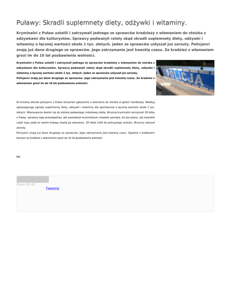 Puławy: Skradli suplemnety diety, odżywki i witaminy. Kryminalni z Puław ustalili i zatrzymali jednego ze sprawców kradzieży z włamaniem do stoiska z odżywkami dla kulturystów. Sprawcy podważyli rolety skąd skradli suplemnety diety, odżywki i witaminy o łącznej wartości około 1 tys. złotych. Jeden ze sprawców usłyszał już zarzuty. Policjanci znają już dane drugiego ze sprawców. Jego zatrzymanie jest kwestią czasu. Za kradzież z włamaniem grozi im do 10 lat pozbawienia wolności. Kryminalni z Puław ustalili i zatrzymali jednego ze sprawców kradzieży z włamaniem do stoiska z odżywkami dla kulturystów. Sprawcy podważyli rolety skąd skradli suplemnety diety, odżywki i witaminy o łącznej wartości około 1 tys. złotych. Jeden ze sprawców usłyszał już zarzuty. Policjanci znają już dane drugiego ze sprawców. Jego zatrzymanie jest kwestią czasu. Za kradzież z włamaniem grozi im do 10 lat pozbawienia wolności. W miniony wtorek policjanci z Puław otrzymali zgłoszenie o włamaniu do stoiska w galerii handlowej. Według zgłaszającego zginęły suplementy diety, odżywki i witaminy dla sportowców o łącznej wartości około 1 tys. złotych. Włamywacze dostali się do stoiska podważając metalową roletę. Wczoraj kryminalni zatrzymali 20 latka z Puław, sprawcę tego przestępstwa. Jak powiedział kryminalnym niewiele pamięta, bo był pijany. Jak twierdził część łupu zjadł ze swoim kolegą chwilę po włamaniu. 20 latek trafił do policyjnego aresztu. Wczoraj usłyszał zarzuty. Policjanci znają już dane drugiego ze sprawców. Jego zatrzymanie jest kwestią czasu. Zgodnie z kodeksem karnym za kradzież z włamaniem grozi do 10 lat pozbawienia wolności. MK Ocena: 0/5 (0) Tweetnij