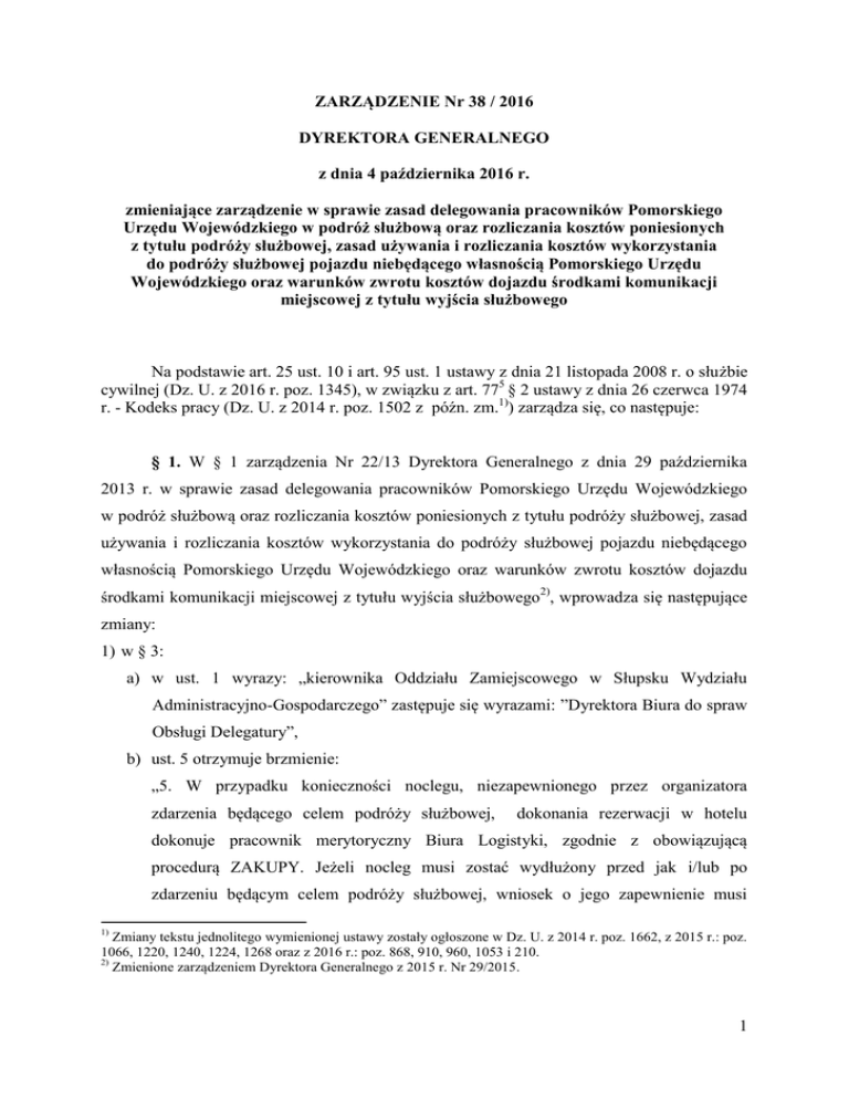 ZARZĄDZENIE Nr 38 / 2016 DYREKTORA GENERALNEGO z dnia 4 października 2016 r. zmieniające zarządzenie w sprawie zasad delegowania pracowników Pomorskiego Urzędu Wojewódzkiego w podróż służbową oraz rozliczania kosztów poniesionych z tytułu podróży służbowej, zasad używania i rozliczania kosztów wykorzystania do podróży służbowej pojazdu niebędącego własnością Pomorskiego Urzędu Wojewódzkiego oraz warunków zwrotu kosztów dojazdu środkami komunikacji miejscowej z tytułu wyjścia służbowego Na podstawie art. 25 ust. 10 i art. 95 ust. 1 ustawy z dnia 21 listopada 2008 r. o służbie cywilnej (Dz. U. z 2016 r. poz. 1345), w związku z art. 775 § 2 ustawy z dnia 26 czerwca 1974 r. - Kodeks pracy (Dz. U. z 2014 r. poz. 1502 z późn. zm.1)) zarządza się, co następuje: § 1. W § 1 zarządzenia Nr 22/13 Dyrektora Generalnego z dnia 29 października 2013 r. w sprawie zasad delegowania pracowników Pomorskiego Urzędu Wojewódzkiego w podróż służbową oraz rozliczania kosztów poniesionych z tytułu podróży służbowej, zasad używania i rozliczania kosztów wykorzystania do podróży służbowej pojazdu niebędącego własnością Pomorskiego Urzędu Wojewódzkiego oraz warunków zwrotu kosztów dojazdu środkami komunikacji miejscowej z tytułu wyjścia służbowego2), wprowadza się następujące zmiany: 1) w § 3: a) w ust. 1 wyrazy: „kierownika Oddziału Zamiejscowego w Słupsku Wydziału Administracyjno-Gospodarczego” zastępuje się wyrazami: ”Dyrektora Biura do spraw Obsługi Delegatury”, b) ust. 5 otrzymuje brzmienie: „5. W przypadku konieczności noclegu, niezapewnionego przez organizatora zdarzenia będącego celem podróży służbowej, dokonania rezerwacji w hotelu dokonuje pracownik merytoryczny Biura Logistyki, zgodnie z obowiązującą procedurą ZAKUPY. Jeżeli nocleg musi zostać wydłużony przed jak i/lub po zdarzeniu będącym celem podróży służbowej, wniosek o jego zapewnienie musi 1) Zmiany tekstu jednolitego wymienionej ustawy zostały ogłoszone w Dz. U. z 2014 r. poz. 1662, z 2015 r.: poz. 1066, 1220, 1240, 1224, 1268 oraz z 2016 r.: poz. 868, 910, 960, 1053 i 210. 2) Zmienione zarządzeniem Dyrektora Generalnego z 2015 r. Nr 29/2015. 1 zawierać uzasadnienie jednoznacznie wskazujące o problemach dotyczących dojazdu lub powrotu”, c) ust. 6 otrzymuje brzmienie: „6. W terminie nie późniejszym niż 2 dni poprzedzające podróż służbową na terenie kraju oraz 7 dni za granicą „polecenie wyjazdu służbowego” pracowników Urzędu w Gdańsku i Delegatury w Słupsku, z wyłączeniem ust. 6a, podlega rejestracji odpowiednio w Biurze Budżetowo-Księgowym oraz Biurze do spraw Obsługi Delegatury.”, d) po ust. 6 dodaje się ust. 6a w brzmieniu: „6a. „Polecenie wyjazdu służbowego” kierowców podlega rejestracji odpowiednio w Biurze Logistyki i Biurze do spraw Obsługi Delegatury, przy czym: rejestracja polecenia wyjazdu służbowego na terenie kraju odbywa się najpóźniej w dniu rozpoczęcia podróży służbowej, rejestracja polecenia wyjazdu służbowego poza granicami kraju odbywa się nie później niż na 2 dni poprzedzające podróż służbową. „Polecenie wyjazdu służbowego” dla kierowcy samochodu służbowego rejestrowane jest odpowiednio przez Biuro Logistyki lub Biuro do spraw Obsługi Delegatury, przy czym: w przypadku krajowej podróży służbowej kierowcy, która nie będzie generować kosztów delegacji, dopuszcza się rozliczenie tej podróży służbowej kierowcy na podstawie danych z karty eksploatacji pojazdu i nie wystawianie „polecenia wyjazdu służbowego”. Powyższe dane z karty eksploatacji pojazdu powinny zawierać m.in. informacje określone w § 3 ust. 4 zarządzenia.”, e) po ust. 6a dodaje się ust. 6b w brzmieniu: „6b. Wzór obowiązującego w Urzędzie Rejestru poleceń wyjazdów służbowych stanowi załącznik nr 2 do zarządzenia. Rejestr poleceń wyjazdów służbowych prowadzony jest w formie elektronicznej.”; 2) w § 6 ust. 1 wyraz „WAG” zastępuje się wyrazem „Biura Budżetowo-Księgowego”, a wyrazy: „dyrektora Wydziału Administracyjno-Gospodarczego” zastępuje się wyrazami „dyrektora Biura Budżetowo-Księgowego”; 3) w § 9 po ust. 2 dodaje się ust. 2a i 2b: „2a. W przypadku zgody uprawnionego dyrektora na odbycie podróży samochodem służbowym w czasie do 8 godzin i sytuacji kiedy czas ten zostanie przekroczony, kierowca samochodu służbowego wraz z pracownikami korzystającymi z samochodu zobowiązani są do przedłożenia odpowiednio dyrektorowi Biura Logistyki lub 2 dyrektorowi Biura do spraw Obsługi Delegatury, szczegółowego uzasadnienia opisującego przyczyny trwania podróży służbowej powyżej 8 godzin. 2b. W przypadku planowania podróży służbowej samochodem służbowym w czasie powyżej 8 godzin, pracownik zobowiązany jest dołączyć do zapotrzebowania na samochód służbowy szczegółowe uzasadnienie ekonomiczne i organizacyjne jego wykorzystania.”; 4) § 10 otrzymuje brzmienie: „1. Nadzór nad wykonaniem niniejszego zarządzenia sprawuje dyrektor Biura Logistyki w zakresie delegowania kierowców świadczących pracę w Biurze Logistyki oraz w zakresie zapisów § 3 ust. 5 zarządzenia. 2. Nadzór nad wykonaniem niniejszego zarządzenia sprawuje dyrektor Biura do spraw Obsługi Delegatury w zakresie delegowania pracowników świadczących pracę w Delegaturze w Słupsku, w tym kierowców. 3. Nadzór nad wykonaniem niniejszego zarządzenia w zakresie delegowania pracowników zatrudnionych w Urzędzie, za wyjątkiem wymienionych w ust. 1 i 2 sprawuje dyrektor Biura Budżetowo-Księgowego.”; 5) załącznik nr 2 dotyczący wniosku o wyrażenie zgody na odbycie podróży służbowej pojazdem niebędącym własnością pracodawcy otrzymuje brzmienie określone w Załączniku nr 1 do niniejszego Zarządzenia. § 2. Zarządzenie wchodzi w życie z dniem podpisania. DYREKTOR GENERALNY Krzysztof Maci