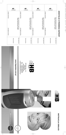Grzejnik ceramiczny CFH1801E.qxd 2010-10-04 14:25 Page 1 ADNOTACJE O PRZEBIEGU NAPRAWY pieczątka serwisu Opis wykonanych czynności, wykaz wymienionych części podpis technika odcinek a pieczątka serwisu Opis wykonanych czynności, wykaz wymienionych części podpis technika odcinek b pieczątka serwisu Opis wykonanych czynności, wykaz wymienionych części podpis technika odcinek c pieczątka serwisu Opis wykonanych czynności, wykaz wymienionych części podpis technika Data zgłoszenia Data naprawy Data zgłoszenia Data naprawy Data zgłoszenia Data naprawy Data zgłoszenia Data naprawy HB Polska Sp. z o.o. Solec 29K 05-532 Baniocha tel.: + 48 22 736 48 00 fax: + 48 22 736 48 10 e-mail: [email protected] www.hbpolska.com.pl INSTRUKCJA OBSŁUGI odcinek d Grzejnik ceramiczny CFH1801E.qxd GRATULUJEMY! 2010-10-04 14:25 Page 4 Kupując grzejnik ceramiczny firmy HB, wybrali Państwo jedno z najlepszych tego typu urządzeń dostępnych obecnie na rynku. Prawidłowo używany i konserwowany grzejnik zapewni Państwu wiele lat satysfakcjonującego działania. Przepisy bezpieczeństwa: Przed rozpoczęciem użytkowania grzejnika należy dokładnie zapoznać się z niniejszą instrukcją obsługi i bezwzględnie jej przestrzegać. Instrukcję obsługi wraz z dowodem zakupu należy przechowywać w łatwo dostępnym miejscu. z Należy upewnić się, że napięcie w sieci jest takie samo jak wskazane na urządzeniu. z W celu uniknięcia pożaru, względnie wstrząsu elektrycznego należy podłączyć urządzenie bezpośrednio do gniazdka elektrycznego całkowicie wsuwając do niego wtyczkę. Nie należy używać kabla przedłużającego. z Zawsze należy wyłączać urządzenie ze źródła prądu, jeżeli w danej chwili nie jest używane bądź następuje zamiana akcesoriów lub czyszczenie urządzenia. Aby wyłączyć urządzenie z sieci, należy wyciągnąć wtyczkę z gniazda. W ŻADNYM WYPADKU nie należy ciągnąć za przewód. z Urządzenie przeznaczone jest wyłącznie do użytku przez osoby dorosłe i powinno znajdować się poza zasięgiem dzieci. z Stosowanie akcesoriów nie zalecanych lub nie sprzedawanych przez producenta grozi niebezpieczeństwem. z Urządzenie przeznaczone jest WYŁĄCZNIE do użytku domowego. Nie należy używać go w obiektach komercyjnych ani przemysłowych. Urządzenie nie jest przeznaczone do użytku na dworze. z Nie wolno zostawiać urządzenia podłączonego do źródła zasilania bez nadzoru ze względu na możliwość powstania pożaru. z Przed pierwszym użyciem urządzenia, należy upewnić się czy wszystkie zabezpieczenia zostały z niego usunięte (folia itp.). z Przed użyciem należy sprawdzić, czy urządzenie nie jest uszkodzone, należy zwrócić szczególną uwagę na przewód zasilający. Jeżeli jakakolwiek część jest uszkodzona, NIE WOLNO korzystać z urządzenia. z NIE WOLNO włączać urządzenia, gdy w pobliżu znajdują się wybuchowe i/lub łatwopalne opary. z Nie należy wystawiać urządzenia na działanie promieni słonecznych, gorących powierzchni, wilgoci, ostrych krawędzi i tym podobnych. z Nie stawiać grzejnika w pobliżu nieosłoniętego płomienia, ani w pobliżu urządzeń kuchennych lub grzewczych. z Przewód nie powinien zwisać ze stołu lub blatu. Uważać, aby przewód nie dotykał gorących powierzchni. z Należy wybrać miejsce, gdzie nie istnieje ryzyko porażenia prądem lub pożaru. Grzejnik należy dotykać jedynie suchymi rękoma. z Grzejnik należy ustawić na stabilnej, twardej, najlepiej żaroodpornej powierzchni w bezpiecznej odległości od mebli lub innych sprzętów: należy pozostawić co najmniej 50 cm wolnego miejsca od góry i po bokach oraz 120 cm z przodu. z Nie ustawiać grzejnika bezpośrednio pod gniazdkiem zasilającym. z Przewód zasilający musi znajdować się w bezpiecznej odległości od otworów wlotowych i wylotowych. z Nie należy przenosić urządzenia podczas jego pracy. Do przenoszenia ochłodzonego urządzenia należy używać uchwytu (grzejnik podczas pracy nagrzewa się). z Włączonego grzejnika NIE WOLNO ustawiać w pobliżu wanny, prysznica ani basenu. z NIE WOLNO wkładać żadnych przedmiotów wewnątrz urządzenia, po za osłonę. z NIE WOLNO zanurzać urządzenia w wodzie lub jakimkolwiek innym roztworze. z Aby grzejnik nie przegrzewał się należy uważać, aby wlot i wylot powietrza nie były zablokowane. NIE NALEŻY wieszać niczego nad lub przed grzejnikiem. Od czasu do czasu należy sprawdzić, czy we wlocie i wylocie nie nagromadził się kurz. Uwaga! Jeżeli urządzenie przegrzeje się wbudowany wyłącznik bezpieczeństwa automatycznie wyłączy grzejnik. z W przypadku awarii lub uszkodzenia urządzenia albo któregokolwiek z jego elementów, urządzenie należy dostarczyć Sprzedawcy albo Autoryzowanemu Punktowi Serwisowemu w celu przeprowadzeniu naprawy albo wymiany. 1 KARTA GWARANCYJNA MODEL PRODUKTU . . . . . . . . . . . . . . . . . . . . . . . . . . . . . . . . . . . . . . . NR SERYJNY . . . . . . . . . . . . . . . . . . . . . . . . . . . . . . . . . . . . . . . . . . . . . . . DATA SPRZEDAŻY . . . . . . . . . . . . . . . . . . . . . . . . . . . . . . . . . . . . . . . . Na produkt udziela się gwarancji na okres 24 miesięcy, która obejmuje wady powstałe z przyczyn tkwiących w sprzedanym urządzeniu. Gwarant zobowiązuje się do bezpłatnego usunięcia ewentualnej niesprawności urządzenia, pod warunkiem wykorzystywania go zgodnie z przeznaczeniem i zaleceniami Instrukcji Obsługi oraz przedstawienia prawidłowo wypełnionej karty gwarancyjnej wraz oryginalnym dowodem zakupu. Naprawa gwarancyjna urządzenia zostanie wykonana w możliwie najkrótszym terminie, nie przekraczającym 14 dni roboczych od daty zgłoszenia usterki. Termin ten może w wyjątkowych przypadkach ulec wydłużeniu do 21 dni roboczych, jeżeli naprawa będzie wymagać sprowadzenia części zamiennych z zagranicy. Zakres niniejszej Gwarancji nie obejmuje żadnych uszkodzeń mechanicz