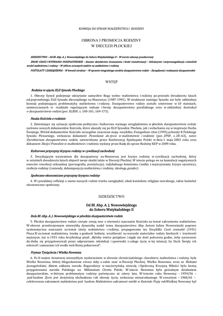 KOMISJA DO SPRAW MAŁŻEŃSTWA I RODZINY OBRONA I PROMOCJA RODZINY W DIECEZJI PŁOCKIEJ DZIEDZICTWO – Od Bł. Abp. A. J. Nowowiejskiego do Soboru Watykańskiego II – W nurcie odnowy posoborowej ZNAKI CZASU I WYZWANIA DUSZPASTERSKIE – Smutne dziedzictwo komunizmu i braki transformacji – Sekularyzm i antyewangelizacja a katolicki model małżeństwa i rodziny – W obliczu nowszych ataków na małżeństwo i rodzinę POSTULATY I ZARZĄDZENIA – W kwestii struktur – W sprawie integralnego modelu duszpasterstwa rodzin – Zarządzenia i wskazania duszpasterskie WSTĘP Rodzina w ujęciu XLII Synodu Płockiego 1. Obecny Synod podejmuje odczytanie zamysłów Boga wobec małżeństwa i rodziny po przeszło dwudziestu latach od poprzedniego, XLII Synodu diecezjalnego na Mazowszu (1987-1991). W strukturze tamtego Synodu nie było oddzielnej komisji podejmującej problematykę małżeństwa i rodziny. Duszpasterstwo rodzin zostało omówione w 10 statutach, zamieszczonych w rozdziale regulującym rodzaje i formy duszpasterstwa parafialnego oraz w oddzielnej Instrukcji o duszpasterstwie rodzin (por. XLIISP, s. 100-101; 169-173). Nauka Kościoła o rodzinie 2. Zmieniające się sytuacja społeczno-polityczna i kulturowa wymaga uwzględnienia w płockim duszpasterstwie rodzin zarówno nowych dokumentów Kościoła, które ukazały się po XLII Synodzie Płockim, jak i wsłuchania się w inspiracje Ducha Świętego. Wśród dokumentów Kościoła szczególne znaczenie mają: encyklika Evangelium vitae (1995),uchwały II Polskiego Synodu Plenarnego, zwłaszcza dokument Powołanie do życia w małżeństwie i rodzinie (por. 2PSP, s. 28–63), nowe Dyrektorium duszpasterstwa rodzin, zatwierdzone przez Konferencję Episkopatu Polski w dniu 1 maja 2003 roku oraz dokument Służyć Prawdzie w małżeństwie i rodzinie, wydany przez Radę do spraw Rodziny KEP w 2009 roku. Kulturowe przyczyny kryzysu rodziny w cywilizacji zachodniej 3. Decydującym wyzwaniem dla duszpasterzy na Mazowszu jest kryzys rodziny w cywilizacji zachodniej, który w ostatnich dwudziestu latach objawił swoje skutki także w Diecezji Płockiej. W istocie polega on na kumulacji negatywnych owoców rewolucji seksualnej (pornografia, prostytucja), radykalnego feminizmu (walka z mężczyznami, kryzys ojcostwa), rozbicia rodziny (rozwody, dekompozycja małżeństwa i rodziny, ideologa gender). Społeczno-ekonomiczne przyczyny kryzysu rodziny 4. W synodalnej refleksji o stanie naszych rodzin trzeba uwzględnić, obok kontekstu religijno-moralnego, także kontekst ekonomiczno-społeczny. DZIEDZICTWO Od Bł. Abp. A. J. Nowowiejskiego do Soboru Watykańskiego II Rola Bł. Abp. A. J. Nowowiejskiego w płockim duszpasterstwie rodzin 5. Płockie duszpasterstwo rodzin czerpie swoją moc z wierności nauczaniu Kościoła na temat sakramentu małżeństwa. W okresie przedwojennym niezwykłą dynamikę nadał temu duszpasterstwu Abp Antoni Julian Nowowiejski poprzez systematyczne nauczanie na temat istoty małżeństwa i rodziny, propagowanie tez Encykliki Casti connubii (1931) Piusa XI na temat małżeństwa, troskę o godność kobiety, wrażliwość na warunki materialne rodzin biednych i trzeźwość mężczyzn. Już w 1931 roku Arcybiskup pisał: „Byłoby wielce pożądane i nigdy nie dość polecenia godne, żeby narzeczeni do ślubu się przygotowywali przez odprawianie rekolekcji i spowiedzi z całego życia w tej intencji, by Duch Święty ich oświecił i zamiarami ich wedle woli Bożej pokierował”. Prymas Tysiąclecia i Wielka Nowenna 6. Po II wojnie światowej niezwykłym wydarzeniem w obronie chrześcijańskiego charakteru małżeństwa i rodziny była Wielka Nowenna, której błogosławione owoce dały o sobie znać w Diecezji Płockiej. Wielka Nowenna, wraz ze Ślubami Jasnogórskimi, Aktem oddania narodu Bogarodzicy w macierzyńską niewolę i Społeczną Krucjatą Miłości była formą przygotowania narodu Polskiego na Millennium Chrztu Polski. W istocie Nowenna była genialnym działaniem duszpasterskim, w którym problematyce rodziny poświęcono aż cztery lata. W trzecim roku Nowenny – 1959/56 – pod hasłem Życie jest świętością obchodzono rok obrony życia, zwłaszcza nienarodzonego. W czwartym – 1960/61 – celebrowano sakrament małżeństwa pod hasłem Małżeństwo sakrament wielki w Kościele. Piąty rokWielkiej Nowenny był obchodzony pod hasłem Rodzina Bogiem silna. Problematyka rodziny była obecna także w szóstym roku, dotyczącym młodzieży. Bp Tadeusz P. Zakrzewski i powojenni referenci rodzin 7. W Diecezji Płockiej, kierowanej przez Bp. Tadeusza Pawła Zakrzewskiego, przesłanie Wielkiej Nowenny wcielali w życie pierwsi po wojnie referenci Referatu Duszpasterskiego Kurii Diecezjalnej, który obejmował również duszpasterstwo rodzin. Organizatorem Referatu Duszpasterskiego był ks. Piotr Dudziec (1947-1950), późniejszy sufragan płocki. Jego następcą był ks. Władysław Celmerowski, kierujący referatem w latach 1950-1962. Znaczenie Roku Stanisławowskiego dla duszpasterstwa rodzin 8. Godnym odnotowania wydarzeniem duszpasterskim był Rok Stanisławowski, obchodzony w całej Polsce z okazji 400lecia śmierci św. Stanisława Kostki. Po zakończeniu w 1966 roku obchodów milenijnych, Prymas Polski poprosił Bp. Bogdana Sikorskiego o projekt obchodów Roku Stanisławowskiego zarówno w Diecezji Płockiej, jak i o materiały dla wszystkich diecezji polskich. W naszej Diecezji centralne uroczystości odbyły się w Przasnyszu, 19 sierpnia 1967 roku. Do wszystkich kurii biskupich w kraju rozesłano teksty czytanek i projekty kazań o św. Stanisławie Kostce. Zarówno w przemówieniach Kardynała S. Wyszyńskiego, jak i w materiałach duszpasterskich problemy młodzieży łączono z ideałami rodzinnymi Kostków, stawianych jako wzór do naśladowania. Soborowa wizja małżeństwa i rodziny 9. Niezwykłym impulsem dla duszpasterstwa rodziny był II Sobór Watykański, który uwydatni