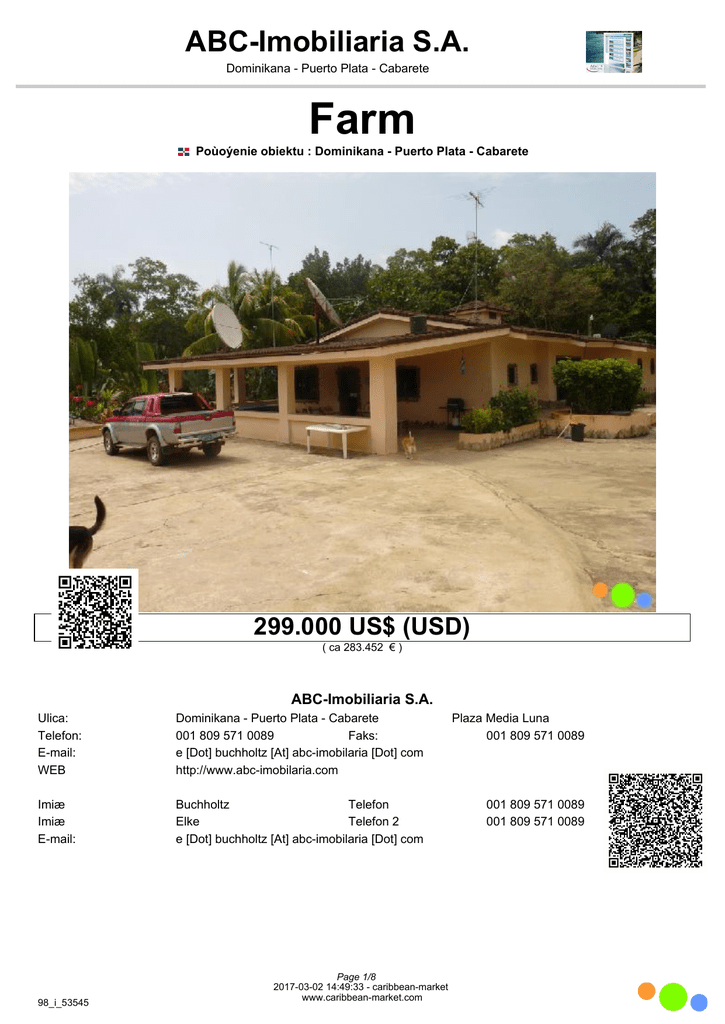ABC-Imobiliaria S.A. Dominikana - Puerto Plata - Cabarete Farm Poùoýenie obiektu : Dominikana - Puerto Plata - Cabarete 299.000 US$ (USD) ( ca 283.452 € ) ABC-Imobiliaria S.A. Ulica: Telefon: E-mail: WEB Dominikana - Puerto Plata - Cabarete 001 809 571 0089 Faks: e [Dot] buchholtz [At] abc-imobilaria [Dot] com http://www.abc-imobilaria.com Plaza Media Luna 001 809 571 0089 Imiæ Imiæ E-mail: Buchholtz Telefon Elke Telefon 2 e [Dot] buchholtz [At] abc-imobilaria [Dot] com 001 809 571 0089 001 809 571 0089 98_i_53545 Page 1/8 2017-03-02 14:49:33 - caribbean-market www.caribbean-market.com ABC-Imobiliaria S.A. Dominikana - Puerto Plata - Cabarete Numer kodu Typ budynku Poùoýenie Materiaùy Property Address 98_i_53545 Farm Obszarów Wiejskich Beton Numer kodu Nr referencyjny Status objektet Rok po uzgodnieniu potrzebne 2002 Powierzchnia dziaùki Firma Ýycie Kuchnia Sypialnie Zùy Opinie Toaleta 61000 m2 Powierzchnia 240 m2 2 1 3 2 Biznes Inne Usùugi Garaý Carport zadaszony taras Dojazd: 20 Protokoùy Samochód Plaýa Akcesoria Dzierýawa Taras Balkon Jetty Pokój Party Klimatyzacja Resort Ogród Pralnia Goràcy zadaszony taras ogrodzony / murem 98_i_53545 Page 2/8 2017-03-02 14:49:33 - caribbean-market www.caribbean-market.com 1 1 ABC-Imobiliaria S.A. Dominikana - Puerto Plata - Cabarete 98_i_53545 Page 3/8 2017-03-02 14:49:33 - caribbean-market www.caribbean-market.com ABC-Imobiliaria S.A. Dominikana - Puerto Plata - Cabarete 98_i_53545 Page 4/8 2017-03-02 14:49:33 - caribbean-market www.caribbean-market.com ABC-Imobiliaria S.A. Dominikana - Puerto Plata - Cabarete 98_i_53545 Page 5/8 2017-03-02 14:49:33 - caribbean-market www.caribbean-market.com ABC-Imobiliaria S.A. Dominikana - Puerto Plata - Cabarete 98_i_53545 Page 6/8 2017-03-02 14:49:33 - caribbean-market www.caribbean-market.com ABC-Imobiliaria S.A. Dominikana - Puerto Plata - Cabarete 98_i_53545 Page 7/8 2017-03-02 14:49:33 - caribbean-market www.caribbean-market.com ABC-Imobiliaria S.A. Dominikana - Puerto Plata - Cabarete 98_i_53545 Page 8/8 2017-03-02 14:49:33 - caribbean-market www.caribbean-market.com