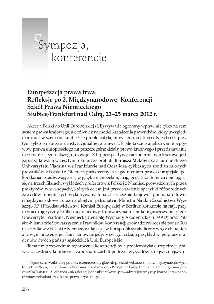SSympozja, konferencje Europeizacja prawa trwa. Refleksje po 2. Międzynarodowej Konferencji Szkół Prawa Niemieckiego Słubice/Frankfurt nad Odrą, 23–25 marca 2012 r. Akcesja Polski do Unii Europejskiej (UE) wywarła ogromny wpływ nie tylko na sam system prawa krajowego, ale również na model kształcenia prawników, który uwzględniać musi w szerokim kontekście problematykę prawa europejskiego. Nie chodzi przy tym tylko o nauczanie instytucjonalnego prawa UE, ale także o analizowanie wpływów prawa europejskiego na poszczególne działy prawa krajowego i przedstawianie możliwości jego dalszego rozwoju. Z tej perspektywy niezmiernie wartościowa jest zapoczątkowana w zeszłym roku przez prof. dr. Bartosza Makowicza z Europejskiego Uniwersytetu Viadrina we Frankfurcie nad Odrą idea cyklicznych spotkań młodych prawników z Polski i z Niemiec, poświęconych zagadnieniom prawa europejskiego. Spotkania te, odbywające się w języku niemieckim, mają postać konferencji opierającej się na trzech filarach: wykładach profesorów z Polski i z Niemiec, prowadzonych przez praktyków, workshopach, których celem jest przedstawienie specyfiki różnorodnych zawodów prawniczych wykonywanych na płaszczyźnie krajowej, ponadnarodowej i międzynarodowej, oraz na objętym patronatem Ministra Nauki i Szkolnictwa Wyższego RP i Przedstawicielstwa Komisji Europejskiej w Berlinie konkursie na najlepszy niemieckojęzyczny krótki esej naukowy. Innowacyjna formuła organizowanej przez Uniwersytet Viadrina, Niemiecką Centralę Wymiany Akademickiej (DAAD) oraz Polsko-Niemieckie Stowarzyszenie Prawników konferencji gromadzi rokrocznie ponad 200 uczestników z Polski i z Niemiec, nadając jej w ten sposób symboliczny wręcz charakter, a w wymiarze europejskim stanowiąc jedyny swego rodzaju przykład współpracy studentów dwóch państw sąsiedzkich Unii Europejskiej. Tematem przewodnim tegorocznej konferencji była problematyka europeizacji prawa. Uczestnicy konferencji zapoznani zostali podczas wykładów z najważniejszymi Tegoroczne workshopy poprowadzone zostały głównie przez adwokatów (m.in. z międzynarodowych kancelarii: Noerr, bunk-alliance i Viadrina), przedstawiciela Prezydium Policji Landu Brandenburgia oraz pracownika Instytutu Allerhanda – niezależnej jednostki naukowej prowadzącej interdyscyplinarne i prawnoporównawcze badania w zakresie prawa prywatnego. 256 Sympozja, konferencje 7–8/2012 wyzwaniami stojącymi przed polskim i niemieckim prawem karnym, cywilnym oraz publicznym w dobie postępującej europeizacji, a następnie mogli, w ramach ośmiu workshopów, przekonać się, jak silny jest wpływ prawa europejskiego na praktykę stosowania prawa w Polsce i w Niemczech. 1. Prawo karne Prowadzący wykład prof. dr Martin Heger z Uniwersytetu Humboldta w Berlinie wskazał na wstępie swoich rozważań, że proces europeizacji prawa karnego rozpoczął się dopiero od wejścia w życie traktatu z Maastricht, który dla urzeczywistniania przestrzeni wolności, bezpieczeństwa i sprawiedliwości przewidywał w ramach ówczesnego III filaru środki współpracy międzyrządowej w sprawach karnych. Współcześnie mówi się już wprawdzie o europejskim prawie karnym, choć nadal brak jest europejskiego sądu karnego czy aktu prawnego, który regulowałby przynajmniej część ogólną wspólnego unijnego prawa karnego. Profesor Heger podkreślił w tej kwestii, że znaczącą rolę w procesie rozwoju europejskiego prawa karnego mogłaby odegrać Prokuratura Europejska, której powołanie może nastąpić na podstawie art. 86 TFUE. Trudno byłoby wprawdzie wyobrazić sobie sytuację, że jej powołanie nastąpiłoby w drodze jednomyślnej decyzji Rady, jednak przewidziana została tu możliwość zastosowania procedury wzmocnionej współpracy, która – jak pokazuje przykład strefy Schengen czy strefy euro – skutkować mogłaby sukcesywnym przyłączaniem się kolejnych państw i tym samym umacnianiem znaczenia Prokuratury Europejskiej. Profesor Heger wskazał, że działalności Prokuratury Europejskiej towarzyszyłyby dalsze problemy wymagające rozwiązania, przede wszystkim dotyczące określenia właściwości sądu, języka postępowania czy ujednolicenia przepisów prawa materialnego. Zdaniem prof. Hegera należałoby stworzyć także odpowiednią strukturę sądów, która byłaby właściwa w sprawach oskarżeń wnoszonych przez Prokuraturę Europejską – pozwoliłoby to uniknąć wielu problemów wynikających z różnic między porządkami prawnymi poszczególnych państw członkowskich. Różnice te bowiem, warunkowane czynnikami kulturowymi, stanowią obok suwerenności państw członkowskich zasadniczy element wyznaczający granice europejskiego prawa karnego. Określenie go jako celu Unii nastąpiło w traktacie amsterdamskim. Podkreślone zostało, że choć wcześniejsze, fundamentalne z punktu widzenia urzeczywistniania wspólnego rynku, orzeczenia Trybunału Sprawiedliwości Unii Europejskiej (TSUE) miały wyjściowo za przedmiot w postępowaniach krajowych prawo karne, to same rozstrzygnięcia dotyczyły prawa gospodarczego, a nie dogmatyki prawa karnego, por. wyroki TSUE: w sprawie 8/74 Dassonville (Zb. Orz. 1974, s. 837), w sprawie 120/78 Cassis de Dijon (Zb. Orz. 1979, s. 649) oraz w sprawach połączonych C-181/91 i C-248/91 Keck i Mithouars (Zb. Orz. 1993, s. I-6097). Pod pojęciem „europejskie prawo karne” rozumie się zbiorczą materię prawną sui generis, na którą składają się regulacje prawa unijnego (dawniej wspólnotowego), międzynarodowego prawa karnego oraz pozostające pod ich wpływem regulacje prawa krajowego państw członkowskich, por. B. Hecker, Europäisches Strafrecht, Heidelberg 2007, s. 24. Regulacja taka dotyczyć mogłaby wyłącznie takich rodzajów czynów zabronionych, które pozostają w sferze kompetencji Unii. Traktat o funkcjonowaniu Unii Europejskiej, Dz.U. C-83 z 30 marca 2010 r. 257 Sympozja,