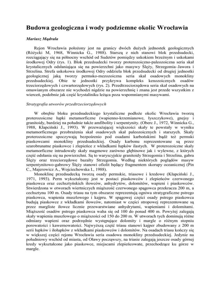 Budowa geologiczna i wody podziemne okolic Wrocławia Mariusz Mądrala Rejon Wrocławia położony jest na granicy dwóch dużych jednostek geologicznych (Różycki M, 1968, Winnicka G., 1988). Starszą z nich stanowi blok przedsudecki, rozciągający się na północny wschód od Sudetów pomiędzy uskokiem brzeżnym i uskokami środkowej Odry (rys. 1). Blok przedsudecki tworzy proterozoiczno-paleozoiczna seria skał krystalicznych odsłaniająca się na powierzchni jako masywy Ślęży, Strzegomia–Jawora i Strzelina. Strefa uskokowa środkowej Odry oddziela blok przedsudecki od drugiej jednostki geologicznej jaką tworzy permsko-mezozoiczna seria skał osadowych monokliny przedsudeckiej. Obie te jednostki przykrywa kompleks kenozoicznych osadów trzeciorzędowych i czwartorzędowych (rys. 2). Przedtrzeciorzędowa seria skał osadowych na omawianym obszarze nie wychodzi nigdzie na powierzchnię i znana jest przede wszystkim z wierceń, podobnie jak część krystaliniku leżąca poza wspomnianymi masywami. Stratygrafia utworów przedtrzeciorzędowych W obrębie bloku przedsudeckiego krystaliczne podłoże okolic Wrocławia tworzą proterozoiczne łupki metamorficzne (wapienno-krzemianowe, łyszczykowe), gnejsy i granitoidy, bardziej na południe także amfibolity i serpentynity. (Oberc J., 1972, Winnicka G., 1988, Kłapciński J., 1993). W przeważającej większości skały te powstały w wyniku metamorficznego przobrażenia skał osadowych skał paleozoicznych i starszych. Skały proterozoiczne spoczywają bezpośrenio pod osadami karbońskimi bądź też permski piaskowcami monokliny przedsudeckiej. Osady karbonu reprezentowane są przez szarobrunatne piaskowce i zlepieńce z wkładkami łupków ilastych. W proterozoiczne skały metamorficzne intrudowały skały magmowe zarówno głębinowe jak i wylewne, z których część odsłania się na powierzchni. Są to waryscyjskie granitoidy Strzegomia i Strzelina, gabra Ślęży oraz trzeciorzędowe bazalty Strzegomia. Według niektórych poglądów masyw serpentynitowo-gabrowy Ślęży stanowi ofiolit będący fragmentem skorupy oceanicznej (Pin C., Majerowicz A., Wojciechowska I., 1988). Monoklinę przedsudecką tworzą osady permskie, triasowe i kredowe (Kłapciński J., 1971, 1993). Perm wykształcony jest w postaci piaskowców i zlepieńców czerwonego piaskowca oraz cechsztyńskich iłowców, anhydrytów, dolomitów, wapieni i piaskowców. Stwierdzona w otworach wiertniczych miąższość czerwonego spągowca przekracza 200 m, a cechsztynu 100 m. Osady triasu na tym obszarze reprezentują ogniwa stratygraficzne pstrego piaskowca, wapienia muszlowego i kajpru. W spągowej części osady pstrego piaskowca budują piaskowce z wkładkami iłowców, natomiast w części stropowej reprezentowane są przez margliste iłowce licznie przewarstwiane anhydrytami, wapieniami i dolomitami. Miąższość osadów pstrego piaskowca waha się od 100 do ponad 400 m. Powyżej zalegają skały wapienia muszlowego o miąższości od 150 do 200 m. W utworach tych dominują różne odmiany wapieni oraz podrzędnie występujące dolomity i margle o różnym stopniu porowatości i kawernowatości. Najwyższą część triasu stanowi kajper zbudowany z 200 m serii łupków i iłołupków z wkładkami piaskowców i dolomitów. Na osadach triasu kończy się w większej części rejonu Wrocławia seria osadowa monokliny przedsudeckiej. Jedynie na południowy wschód od miasta, od Oławy począwszy, na triasie zalegają jeszcze osady górnej kredy wykształcone jako piaskowce, miejscami zlepieńcowate, przechodzące ku górze w margle. Utwory Kenozoiku Z wyjątkiem wzniesień zbudowanych ze skał krystalicznych podłoże kenozoiku przykrywa ciągła pokrywa utworów trzeciorzędowych o miąższości 100-150 m (rys. 2). Składają się one prawie wyłącznie z luźnych skał osadowych wykształconych jako mioceńskie iły, piaski i mułki, w stropowej części z cienkimi soczewkami węgli. W części omawianego obszaru trzeciorzędową sedymentację kończą plioceńskie gliny, piaski i żwiry serii Gozdnicy. Trzeciorzęd często odkrywa się na powierzchni terenu. W obrębie Wrocławia odsłania się w zachodniej części miasta w rejonie Pilczyc, Stabłowic i Żernik na terenie wyrobisk po byłych cegielniach. Na przełomie trzeciorzędu i czwartorzędu, w Sudetach i na obszarze przedsudeckim, rozwinęła się sieć rzeczna, która wytworzyła system kopalnych dolin w rozmywanych na skutek erozji rzecznej osadach trzeciorzędu (Dyjor S., 1987 Kryza J., Poprawski L., 1987). We wczesnym plejstocenie doliny kopalne, stwierdzone także w rejonie Wrocławia, były zasypywane piaskami i żwirami akumulacji rzecznej. Utwory czwartorzędowe w rejonie Wrocławia związane są głównie z osadami wysoczyzn morenowych wykształconych jako kompleks glin zwałowych rozdzielanych nieciągłymi przewarstwieniami piasków i żwirów wodnolodowcowych, powstałych na skutek plejstoceńskich zlodowaceń (Winnicka G., 1988). Lokalnie w profilu spotykane są również mułki, piaski i iły zastoiskowe, a także utwory eoliczne o charakterze wydmowym. U schyłku epoki lodowcowej powstaje pradolina Odry, będąca szerokim obniżeniem wypełnionym osadami fluwioglacjalnymi. W trakcie ostatniego zlodowacenia ostatecznie formuje się współczesna dolina Odry wraz z tarasami nadzalewowymi. W holocenie wody Odry tworzą tarasy zalewowe wykształcone w postaci piasków i żwirów oraz namułów. Na skutek naturalnych procesów rzecznych a także prac regulacyjnych prowadzonych przez człowieka w dolinie Odry postało szereg starorzeczy. Tektonika Utwory przedtrzeciorzędowe podlegały kilkakrotnie ruchom tektonicznym. Proterozoiczne skały metamorficzne i utwory karbońskie podlegały fałdowaniom i tektonice uskokowej (Winnicka G., 1988). Zalegające na nich osady permo-mezozoiczne tworzą monoklinę zapadającą maksymalnie pod kątem kilku stopni na północny wschód. Na skutek ruc