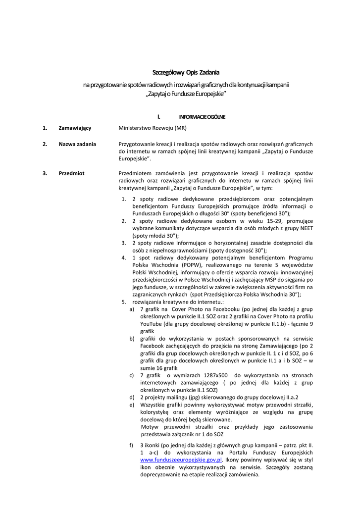 Szczegółowy Opis Zadania na przygotowanie spotów radiowych i rozwiązań graficznych dla kontynuacji kampanii „Zapytaj o Fundusze Europejskie” I. INFORMACJE OGÓLNE 1. Zamawiający Ministerstwo Rozwoju (MR) 2. Nazwa zadania Przygotowanie kreacji i realizacja spotów radiowych oraz rozwiązań graficznych do internetu w ramach spójnej linii kreatywnej kampanii „Zapytaj o Fundusze Europejskie”. 3. Przedmiot Przedmiotem zamówienia jest przygotowanie kreacji i realizacja spotów radiowych oraz rozwiązań graficznych do internetu w ramach spójnej linii kreatywnej kampanii „Zapytaj o Fundusze Europejskie”, w tym: 1. 2. 3. 4. 5. 2 spoty radiowe dedykowane przedsiębiorcom oraz potencjalnym beneficjentom Funduszy Europejskich promujące źródła informacji o Funduszach Europejskich o długości 30” (spoty beneficjenci 30”); 2 spoty radiowe dedykowane osobom w wieku 15-29, promujące wybrane komunikaty dotyczące wsparcia dla osób młodych z grupy NEET (spoty młodzi 30”); 2 spoty radiowe informujące o horyzontalnej zasadzie dostępności dla osób z niepełnosprawnościami (spoty dostępność 30”); 1 spot radiowy dedykowany potencjalnym beneficjentom Programu Polska Wschodnia (POPW), realizowanego na terenie 5 województw Polski Wschodniej, informujący o ofercie wsparcia rozwoju innowacyjnej przedsiębiorczości w Polsce Wschodniej i zachęcający MŚP do sięgania po jego fundusze, w szczególności w zakresie zwiększenia aktywności firm na zagranicznych rynkach (spot Przedsiębiorcza Polska Wschodnia 30”); rozwiązania kreatywne do internetu.: a) 7 grafik na Cover Photo na Facebooku (po jednej dla każdej z grup określonych w punkcie II.1 SOZ oraz 2 grafiki na Cover Photo na profilu YouTube (dla grupy docelowej określonej w punkcie II.1.b) - łącznie 9 grafik b) grafiki do wykorzystania w postach sponsorowanych na serwisie Facebook zachęcających do przejścia na stronę Zamawiającego (po 2 grafiki dla grup docelowych określonych w punkcie II. 1 c i d SOZ, po 6 grafik dla grup docelowych określonych w punkcie II.1 a i b SOZ – w sumie 16 grafik c) 7 grafik o wymiarach 1287x500 do wykorzystania na stronach internetowych zamawiającego ( po jednej dla każdej z grup określonych w punkcie II.1 SOZ) d) 2 projekty mailingu (jpg) skierowanego do grupy docelowej II.a.2 e) Wszystkie grafiki powinny wykorzystywać motyw przewodni strzałki, kolorystykę oraz elementy wyróżniające ze względu na grupę docelową do której będą skierowane. Motyw przewodni strzałki oraz przykłady jego zastosowania przedstawia załącznik nr 1 do SOZ f) 3 ikonki (po jednej dla każdej z głównych grup kampanii – patrz. pkt II. 1 a-c) do wykorzystania na Portalu Funduszy Europejskich www.funduszeeuropejskie.gov.pl. Ikony powinny wpisywać się w styl ikon obecnie wykorzystywanych na serwisie. Szczegóły zostaną doprecyzowanie na etapie realizacji zamówienia. 4. Budżet Zamawiający planuje przeznaczyć na realizację Zamówienia kwotę nie przekraczającą 48 000 zł netto, tj. 59 040 zł brutto 5. Podstawa do realizacji zadania W związku z trwającymi licznymi naborami wniosków w krajowych i regionalnych programach operacyjnych zaplanowanymi na III i IV kwartał 2016 r., Ministerstwo Rozwoju (MR) planuje przeprowadzić kontynuację kampanii „Zapytaj o Fundusze Europejskie” promującej bezpłatne źródła informacji o FE oraz wybrane komunikaty dotyczące krajowych programów operacyjnych. II. 1. Grupa docelowa ZAŁOŻENIA a. spoty beneficjenci 30” 1) potencjalni beneficjenci Funduszy Europejskich (FE) 2) przedsiębiorcy mogący ubiegać się o wsparcie z FE na innowacyjne projekty b. spoty młodzi 30” 1) osoby w wieku 15-24 z grupy NEET (tj. osoby, które spełniają łącznie trzy warunki: nie pracują, nie kształcą się, nie szkolą się) 2) osoby w wieku 24-30 z grupy NEET (tj. osoby, które spełniają łącznie trzy warunki: nie pracują, nie kształcą się, nie szkolą się) c. spoty „Dostępność” 30” 1) potencjalni beneficjenci i beneficjenci FE 2) osoby z niepełnosprawnością (potencjalni uczestnicy projektów) d. spot Przedsiębiorcza Polska Wschodnia 30” 1) potencjalni beneficjenci POPW (w szczególności MŚP zainteresowane zwiększeniem swojej aktywności na zagranicznych rynkach) oraz mieszkańcy Polski Wschodniej (lubelskie, podlaskie, podkarpackie, świętokrzyskie i warmińsko-mazurskiego). 2. Cele komunikacyjne kampanii 1) wzrost świadomości opinii publicznej na temat możliwości skorzystania z bezpłatnych źródeł informacji na temat Funduszy Europejskich: Sieci Punktów Informacyjnych Funduszy Europejskich, w których można skorzystać m.in. z konsultacji mailowych, telefonicznych, osobistych, Portalu www.FunduszeEuropejskie.gov.pl, na którym można skorzystać m.in. z Wyszukiwarki Dotacji. 2) wzrost świadomości osób młodych z grupy NEET na temat działań przewidzianych dla tej grupy, finansowanych z Funduszy Europejskich przede wszystkim w Programie Wiedza Edukacja Rozwój, 3) wzrost świadomości potencjalnych beneficjentów, beneficjentów i osób z niepełnosprawnością (potencjalnych uczestników projektów) na temat horyzontalnej zasady dostępności w działaniach dofinansowanych z Funduszy Europejskich, 4) wzrost świadomości mieszkańców i potencjalnych beneficjentów POPW z terenu 5 województw Polski Wschodniej, na temat oferty wsparcia rozwoju innowacyjnej przedsiębiorczości w Programie Polska Wschodnia, w szczególności zachęcenia MŚP do sięgania po fundusze na zwiększenie aktywności na zagranicznych rynkach. 3. Wykorzystanie Ze względu na wieloelementowość oraz różnorodne grupy docelowe, kampania będzie rozłożona w czasie oraz emitowana w stacjach radiowych we flightach od 12 września do 4 grudnia 2016 r. 4. Czas Przekazanie spotów Zamawiającemu musi nastąpić do: I etap – 12.09.2016 r. (realizacja zadań, o których mowa w pkt I.3.1 i I.3.5) II etap – 19.09.2016 r. (r