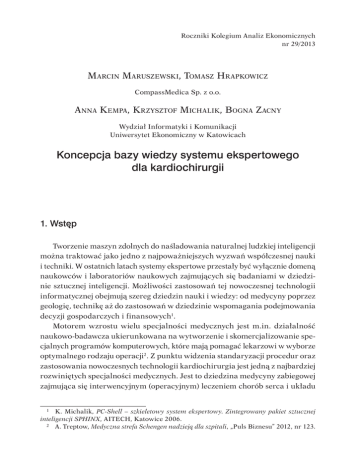 Roczniki Kolegium Analiz Ekonomicznych nr 29/2013 Marcin Maruszewski, Tomasz Hrapkowicz CompassMedica Sp. z o.o. Anna K empa, K rzysztof Michalik, Bogna Zacny Wydział Informatyki i Komunikacji Uniwersytet Ekonomiczny w Katowicach Koncepcja bazy wiedzy systemu ekspertowego dla kardiochirurgii 1. Wstęp Tworzenie maszyn zdolnych do naśladowania naturalnej ludzkiej inteligencji można traktować jako jedno z najpoważniejszych wyzwań współczesnej nauki i techniki. W ostatnich latach systemy ekspertowe przestały być wyłącznie domeną naukowców i laboratoriów naukowych zajmujących się badaniami w dziedzinie sztucznej inteligencji. Możliwości zastosowań tej nowoczesnej technologii informatycznej obejmują szereg dziedzin nauki i wiedzy: od medycyny poprzez geologię, technikę aż do zastosowań w dziedzinie wspomagania podejmowania decyzji gospodarczych i finansowych1. Motorem wzrostu wielu specjalności medycznych jest m.in. działalność naukowo-badawcza ukierunkowana na wytworzenie i skomercjalizowanie specjalnych programów komputerowych, które mają pomagać lekarzowi w wyborze optymalnego rodzaju operacji2. Z punktu widzenia standaryzacji procedur oraz zastosowania nowoczesnych technologii kardiochirurgia jest jedną z najbardziej rozwiniętych specjalności medycznych. Jest to dziedzina medycyny zabiegowej zajmująca się interwencyjnym (operacyjnym) leczeniem chorób serca i układu 1 K. Michalik, PC-Shell – szkieletowy system ekspertowy. Zintegrowany pakiet sztucznej inteligencji SPHINX, AITECH, Katowice 2006. 2 A. Treptow, Medyczna strefa Schengen nadzieją dla szpitali, „Puls Biznesu” 2012, nr 123. 660 Marcin Maruszewski, Tomasz Hrapkowicz, Anna Kempa, Krzysztof Michalik, Bogna Zacny krążenia. Pomimo to, iż pod względem anatomii kardiochirurgię można ograniczyć do stosunkowo wąskiego obszaru ludzkiego ciała, lekarze uprawiający tę specjalność muszą wykazać się biegłością m.in. w zakresie torakochirurgii (chirurgii klatki piersiowej), chirurgii naczyniowej, kardiologii, intensywnej terapii, medycyny ratunkowej i innych. Jest to również dziedzina medycyny bardzo silnie powiązana z czynnikami ekonomiczno-społecznymi: choroby układu krążenia są najpowszechniejszą (po nowotworach) przyczyną zachorowań i umieralności w Polsce; koszty leczenia kardiochirurgicznego (wynikające m.in. z zastosowania dużej liczby drogiego sprzętu jednorazowego) są jednymi z najwyższych, a ryzyko wystąpienia powikłań pooperacyjnych, choć stale maleje, jest stosunkowo wysokie (w porównaniu do innych rodzajów operacji). Celem opisywanego projektu jest zgromadzenie rozproszonych źródeł wiedzy z zakresu kardiochirurgii oraz jej formalizacja na potrzeby opracowania bazy wiedzy umożliwiającej wspomaganie decyzji medycznych. Wspomaganie decyzji w medycynie (w tym w kardiochirurgii) jest mniej powszechne niż w dziedzinie zarządzania3. Wśród najważniejszych przyczyn takiego stanu rzeczy należy wymienić m.in. brak usystematyzowanej komunikacji pomiędzy potencjalnymi interesariuszami oraz użytkownikami systemu wspomagania decyzji (personel medyczny, pacjenci, płatnicy), zróżnicowany zakres oczekiwań poszczególnych grup użytkowników wobec narzędzi eksperckich, stały postęp technologiczny, jak również odmienności rasowe oraz epidemiologiczne ludzi na świecie. W przedstawionej pracy w pierwszej kolejności omówiono najważniejsze źródła informacji w kardiochirurgii, których znajomość pozwoli zasilać projektowany system. W dalszej części autorzy przedstawiają poszczególne fazy projektu i zależności pomiędzy kolejnymi etapami prac: formalizację wiedzy kardiochirurgicznej oraz wzbogacanie i uzupełnianie bazy wiedzy systemu ekspertowego. W zasadniczej części artykułu przedstawiono zarys metodyki prowadzonych prac, zastosowane narzędzia (w tym projektowane) oraz wstępne wyniki – prototyp systemu eksperckiego. W podsumowaniu autorzy przedstawiają zarówno potencjalne zagrożenia realizacji projektu, korzyści wynikające z jego realizacji, jak i możliwości rozwoju i dalszych zastosowań. 3 Jest to o tyle zaskakujące, że pierwsze aplikacje systemów ekspertowych dotyczyły m.in. medycyny (np. MYCIN, Internist, CASNET/GLAUCOMA). Były one jednak odległe od zagadnień chorób serca i układu krążenia. Koncepcja bazy wiedzy systemu ekspertowego dla kardiochirurgii 661 2. Założenia i cele pracy 2.1. Przedstawienie źródeł informacji w kardiochirurgii Podstawowymi narzędziami, jakimi posługują się kardiochirurdzy w podejmowaniu decyzji klinicznych, są wytyczne i standardy postępowania, rejestry, doświadczenia własne (określonego ośrodka lub opinie ekspertów) oraz skale ryzyka, które wspierają informacje pochodzące z wytycznych w odniesieniu do konkretnego przypadku, ale także pozwalają ocenić zasadność leczenia, szczególnie gdy istnieją wskazania do takiego leczenia, ale ryzyko jego przeprowadzenia jest zbyt wysokie. Źródła informacji w kardiochirurgii, które stanowią podstawę opracowania wytycznych, są ograniczone, ponieważ pochodzą w całości z danych historycznych (opublikowanych), a tym samym nie odzwierciedlają stałego postępu medycyny lub są opóźnione w stosunku do niego4. Zalicza się do nich m.in.: wyniki randomizowanych, prospektywnych, wieloośrodkowych badań klinicznych, analiz retrospektywnych i innych z metaanalizami włącznie, a także opinie ekspertów powołanych w skład grup roboczych w celu ustalenia zasad postępowania w określonych przypadkach medycznych. Na podstawie wyżej wymienionych źródeł wiedzy są opracowywane wytyczne (zalecenia) postępowania w poszczególnych sytuacjach klinicznych, które nie zawsze są w stanie objąć wszystkie scenariusze diagnostyczno-terapeutyczne5. Istotnym ograniczeniem wytycznych jest ekstrapolowanie założeń leczniczych na całą populację pacjentów na podstawie danych, które zostały sprawdzone na wybr