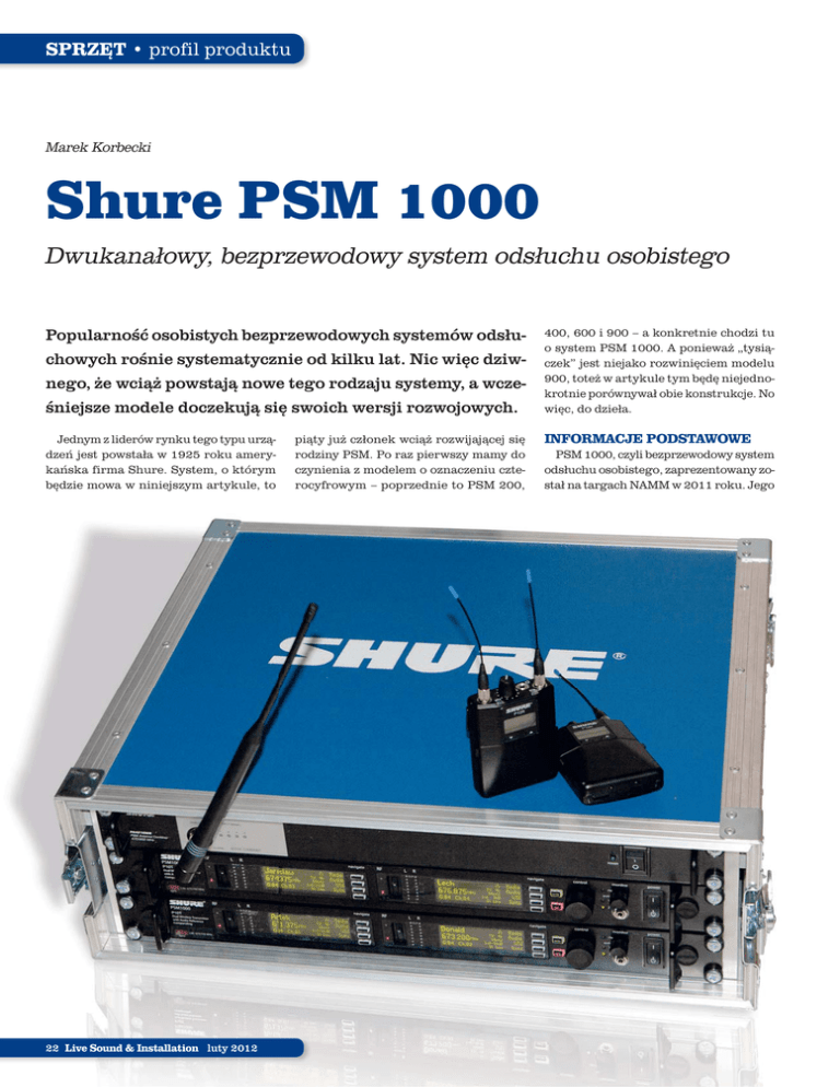 SPRZĘT • profil produktu Marek Korbecki Shure PSM 1000 Dwukanałowy, bezprzewodowy system odsłuchu osobistego Popularność osobistych bezprzewodowych systemów odsłuchowych rośnie systematycznie od kilku lat. Nic więc dziwnego, że wciąż powstają nowe tego rodzaju systemy, a wcześniejsze modele doczekują się swoich wersji rozwojowych. Jednym z liderów rynku tego typu urządzeń jest powstała w 1925 roku amerykańska firma Shure. System, o którym będzie mowa w niniejszym artykule, to 22 Live Sound & Installation luty 2012 piąty już członek wciąż rozwijającej się rodziny PSM. Po raz pierwszy mamy do czynienia z modelem o oznaczeniu czterocyfrowym – poprzednie to PSM 200, 400, 600 i 900 – a konkretnie chodzi tu o system PSM 1000. A ponieważ „tysiączek” jest niejako rozwinięciem modelu 900, toteż w artykule tym będę niejednokrotnie porównywał obie konstrukcje. No więc, do dzieła. INFORMACJE PODSTAWOWE PSM 1000, czyli bezprzewodowy system odsłuchu osobistego, zaprezentowany został na targach NAMM w 2011 roku. Jego SHURE PSM 1000 moduł nadajnika P10T, jako pierwszy w całej rodzince, ma pełną szerokość raka i, podobnie jak poprzednicy, wysokość 1U, co łącznie niewątpliwie ułatwia montaż urządzenia w stelażach. Producent przystosował go do trudów pracy w trasie – obudowa P10T wykonana jest w całości z metalu. Układ elementów sterujących jest prosty i bardzo czytelny. Sterowanie pracą nowego PSM-a i regulację parametrów „ad hoc”, na stanowisku realizacji odsłuchów, umożliwiają dwa wyświetlacze ciekłokrystaliczne, wraz z zestawem przycisków pozwalających na poruszanie się po menu. Zaraz, zaraz, jak to dwa wyświetlacze? Każdy użytkownik poprzednich modeli z serii PSM wie, że tam wystarczał jeden wyświetlacz, a tu potrzebne są aż dwa? No tak, bo PSM 1000, jako pierwszy w serii, jest systemem dwukanałowym. Innymi słowy składa się z dwóch nadajników w jednej obudowie i pozwala na obsłużenie dwóch niezależnych torów odsłuchowych. Również stereofonicznych. To chyba najważniejszy jego wyróżnik w całej rodzinie PSM-ów. System dostępny jest w dwóch odmianach, czy też „pakietach” – P10TR425CL oraz P10TR. W obu zawarty jest moduł nadawczy P10T oraz dwie sztuki odbiorników P10R, natomiast pierwszy wariant wzbogacony jest o dwie pary słuchawek dokanałowych SE425 Sound Isolation Earphones. Po otwarciu klapki baterii odbiornika znajdziemy przyciski do konfiguracji ustawień Menu urządzenia oraz przycisk skanera pasma RF i okienko transmisji IR. Zakres częstotliwości audio transmitowanych przez system zawiera się w granicach 35 Hz-15 kHz, zaś dynamika sygnału audio, czyli odstęp sygnału od szumu, wynosi 90 dBA, przy poziomie zniekształceń harmonicznych oscylującym typowo w okolicach 0,5% dla częstotliwości 1 kHz. System PSM 1000 operuje w paśmie dwukrotnie szerszym, niż jego poprzednik. Dla PSM 900 było to pasmo 36, zaś w przypadku bohatera niniejszego tekstu jest to 72 MHz, przestrajane w zakresie 470-952 MHz. Daje to znacznie większe, niż dotychczas, możliwości „manewrowania” w zagęszczonym środowisku RF. Moc sygnału radiowego, emitowanego przez P10T, to 10, 50 lub 100 mW. We wspólnym paśmie może pracować do 49 kanałów, co oznacza możliwość jednoczesnego uruchomienia 25 systemów PSM 1000 i zestawienia niemal 50 torów odsłuchowych! To liczba znacznie przekraczająca potrzeby większości typowych konfiguracji i w obecnej chwili czyniąca system PSM Shure’a najbardziej funkcjonalnym i zaawansowanym na rynku. NADAJNIK P10T Wracając do nadajnika i jego przedniego panelu… Znajdziemy tutaj także włącznik zasilania, odrębne dla obu nadajników włączniki sygnału radiowego, które przydatne są np. podczas skanowania pasma, gdyż pracujące nadajniki mogłyby wprowadzać dodatkowe interferencje, a także dwa gniazda słuchawkowe TRS 3,5 mm, dające możliwość monitorowania sygnałów podawanych na wejścia audio. Niestety, z przodu nie wyprowadzono gniazd anten, a umieszczono je wyłącznie na ścianie tylnej. Można byłoby takie rozwiązanie uznać za pewną wadę – nieco utrudnia ono podłączanie anten, szczególnie gdy nadajnik zamknięty jest w głębokim kejsie – gdyby nie fakt, że raczej nigdy raz zmontowanego zestawu nie instaluje się od nowa przed każdą „sztuką”. Anteny podłącza się więc za pomocą dodatkowych przewodów lub, jak w przypadku zestawu otrzymanego do testu, combinera antenowego, wyposażonego w wyjściowe złącze antenowe z przodu. Generalnie rzecz biorąc design urządzenia jest dość zachowawczy i, można powiedzieć, tradycyjny. Żadnych ekstrawagancji, tylko prosta elegancja. Spójrzmy teraz na tylny panel modułu P10T. Na tymże panelu umieszczono gniazdo zasilania oraz przelotowe, dzięki któremu można podłączyć następny Odbiorniki systemów PSM 1000 i PSM 900 są na tyle do siebie podobne, że na pierwszy rzut oka można byłoby je pomylić, gdyby nie to, że pierwszy ma… dwie ćwierćfalowe anteny zamiast jednej! nadajnik, bez konieczności ciągnięcia kolejnego przewodu z gniazdka elektrycznego – wystarczy odpowiedni kabel przelotowy. Obok znajduje się też główny włącznik zasilania. Nadajniki P10T akceptują wyłącznie analogowe sygnały audio. Dlatego też urządzenie wyposażono tylko w zestaw złącz analogowych – po dwa gniazda combo XLR/jack dla każdego z nadajników, pozwalające na wprowadzanie sygnałów zarówno symetrycznych, jak i niesymetrycznych. Wejściom towarzyszą też dwa wyjścia, umożliwiające podanie sygnałów wejściowych na kolejne urządzenie. Ponadto panel tylny zawiera też dwa ethernetowe gniazda RJ45, ale do tego tematu wrócę później. No, i to byłoby na tyle, jeśli chodzi o „plecy” P10T. ODBIORNIK OSOBISTY P10R Odbiornik systemu PSM 1000, czyli P10R, ma – podobnie jak P9R z PSM 900 – wymiary niewiele większe od paczki papieros