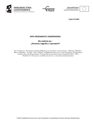Część III SIWZ OPIS PRZEDMIOTU ZAMÓWIENIA dla zadania pn.: „Dostawa ciągnika z osprzętem” Dot. Projektu pn.: Rewitalizacja Kanału Elbląskiego na odcinkach: Jezioro Drużno - Miłomłyn, Miłomłyn Zalewo, Miłomłyn – Ostróda – Stare Jabłonki, współfinansowanego przez Unie Europejska z Europejskiego Funduszu Rozwoju Regionalnego; Program Operacyjny Innowacyjna Gospodarka 2007 – 2013; Działanie 6.4. Inwestycje w produkty turystyczne o znaczeniu ponadregionalnym Projekt współfinansowany przez Unię Europejską z Europejskiego Funduszu Rozwoju Regionalnego I. CEL ZAMÓWIENIA Celem realizacji zadania pn.: „Dostawa ciągnika z osprzętem” jest zakup sprzętu niezbędnego do utrzymania trwałości projektu. Zakupiony sprzęt będzie wykorzystywany przez pracowników jednostek terenowych RZGW w Gdańsku do prac mających na celu utrzymanie należytego stanu zrealizowanych inwestycji na Kanale Elbląskim (dot. m.in. brzegów kanału, dróg technologicznych wzdłuż kanału, ciągów komunikacyjnych w obrębie zrewitalizowanych obiektów). Zadanie jest realizowane w ramach projektu pn.: „Rewitalizacja Kanału Elbląskiego na odcinkach: Jezioro Drużno – Miłomłyn, Miłomłyn – Zalewo, Miłomłyn – Ostróda – Stare Jabłonki” (zwanego dalej „Projektem”). Projekt jest współfinansowany przez Unię Europejską w ramach Programu Operacyjnego Innowacyjna Gospodarka 2007–2013, 6. Oś priorytetowa „Polska gospodarka na rynku międzynarodowym, Działanie 6.4 „Inwestycje w produkty turystyczne o znaczeniu ponadregionalnym”. II. PRZEDMIOT ZAMÓWIENIA Przedmiot zamówienia obejmuje: 1. dostawę: 1) ciągnika z ładowaczem czołowym, szuflą objętościową, 2szt. wideł do palet, 2) kosiarki do trawy i żywopłotów na ramionach wysięgnikowych, 3) kosiarki bijakowej czołowej, 4) pługu do odśnieżania, 5) zamiatarki. 2. przekazanie niezbędnych dokumentów i wyposażenia dopuszczających ciągnik z osprzętem do zarejestrowania i dopuszczenia do ruchu drogowego. 3. przekazanie niezbędnych dokumentów dotyczących ciągnika z osprzętem w zakresie gwarancji i serwisu pogwarancyjnego, instrukcji (w języku polskim). 4. przeprowadzenie przeszkolenia w zakresie teoretycznym i praktycznym z obsługi i eksploatacji dostarczanego ciągnika z osprzętem (5 osób wskazanych przez Zamawiającego) na terenie pochylni Kanału Elbląskiego. W szczególności zapewnienie napełnionego baku ciągnika w ilości 50 litrów paliwa celem przeprowadzenia praktycznego przeszkolenia w/w osób. III. SPECYFIKACJA I WARUNKI REALIZACJI ZAMÓWIENIA 1. Parametry techniczne przedmiotu zamówienia: Ciągnik z osprzętem winien być: − fabrycznie nowy (rok produkcji 2015), nieużywany, w pełni sprawny, − kompatybilny zarówno z ładowaczem czołowym, szuflą objętościową, 2szt. wideł do palet jak również z kosiarką do traw i żywopłotów na ramionach wysięgowych, kosiarką bijakową czołową, pługiem do odśnieżania i zamiatarką, pod względem możliwości pracy. − wolny od wad fizycznych i prawnych, − nie obciążony prawami osób trzecich, W stosunku do przedmiotowego ciągnika z osprzętem nie może toczyć się żadne postępowanie sądowe, egzekucyjne lub administracyjne. Projekt współfinansowany przez Unię Europejską z Europejskiego Funduszu Rozwoju Regionalnego Ciągnik wraz z osprzętem musi posiadać niezbędne dokumenty i wyposażenie dopuszczające go do ruchu drogowego. Parametry techniczne: ciągnik z ładowaczem czołowym, szuflą objętościową i 2 szt. wideł do palet 1 Ciągnik oraz osprzęt fabrycznie nowy z 2015 roku 2 Świadectwo homologacji 3 Silnik wysokoprężny z turbodoładowaniem 4 Silnik 6 cylindrowy (4 zawory na cylindrze) 5 Pojemność silnika 6,6 – 7,0l 6 Norma emisji spalin TIER 4 7 Moc znamionowa min. 110 kW 8 Rodzaj paliwa: olej napędowy 9 Zbiornik paliwa min. 270L 10 Układ zimnego rozruchu 11 Przełożenia w skrzyni biegów min. 20/20 z biegami pełzającymi 12 Elektryczna blokada mechanizmu różnicowego przód i tył 13 Akumulator 12V/174Ah 14 Liczba gniazd zaworów hydraulicznych – min. 4 pary 15 Wydatek pompy hydraulicznej min. 110l/min 16 Ciśnienie pompy hydraulicznej min. 200bar 17 Pompa hydrauliki zmiennowydatkowa 18 Podnośnik czołowy trójpunktowy – TUZ 19 TUZ - siła podnoszenia przód min. 3,0t; tył min. 6,5t 20 TUZ z wyjściem hydraulicznym i elektrycznym do zamocowania kosiarki czołowej, zamiatarki, pługa śnieżnego 21 Czołowy Wał Odbioru Mocy – WOM 22 Liczba obrotów czołowego WOM 540obr./min 23 WOM tylny o obrotach 540/540E/1000 24 Automatyka WOM 25 Sterowanie WOMem przednim z kabiny, tylnym z kabiny i z zewnątrz 26 Koła przednie – ogumienie 520/60-R28 Projekt współfinansowany przez Unię Europejską z Europejskiego Funduszu Rozwoju Regionalnego 27 Koła tył – ogumienie 650/60-R38 28 Komputer pokładowy 29 Klimatyzacja manualna 30 Radio z zestawem głośników 31 Fotel operatora pneumatyczny 32 Dach przeszklony bądź luk dachowy 33 Drugi zestaw świateł mijania montowany na słupkach kabiny 34 Amortyzowany podnośnik czołowy i tylny TUZ 35 Oś przednia ciągnika amortyzowana 36 Obciążniki na tylne koło ciągnika w ilości 2szt. o wadze 50kg70kg każdy 37 Ładowacz czołowy TUR 38 Sterowanie TURem joystickiem 39 Amortyzacja wstrząsów TURa mechaniczna 40 Ramka EURO 41 Szufla objętościowa o pojemności 0,9m3- 1,5m3, wzmocniona o szerokości 2,5m-2,8m i wadze od 250kg-370kg 42 2 szt. wideł do palet o sile podnoszenia powyżej 1t 43 Podłączenie mechaniczne osprzętu ładowacza 44 Udźwig TURa powyżej 2t 45 2 kamizelki odblaskowe 46 Walizka ze standardowym wyposażeniem podstawowych kluczy i narzędzi 47 Gaśnica - zgodna z obowiązującymi przepisami ustawy Prawo o ruchu drogowym - 1szt 48 Apteczka pierwszej pomocy DIN 13164 – 1szt. 49 Trójkąt ostrzegawczy – 1szt. 50 Komplet zapasowych żarówek wszystkich świateł zewnętrznych Parametry techniczne: kosiarka do