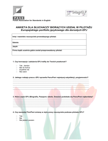 Polish Association for Standards in English ANKIETA DLA SŁUCHACZY BIORĄCYCH UDZIAŁ W PILOTAśU Europejskiego portfolio językowego dla dorosłych EPJ Imię i nazwisko nauczyciela prowadzącego pilotaŜ: Szkoła: Język: Firma bądź uczelnia gdzie został przeprowadzony pilotaŜ: 1. Czy koncepcja i załoŜenia EPJ trafiły do Twoich przekonań? Tak , bardzo Nie do końca Zupełnie nie Nie wiem 2. Jakiego rodzaju praca z EPJ sprawiła Panu/Pani najwięcej satysfakcji, przyjemności? ....................................................................................................................................................... ....................................................................................................................................................... ....................................................................................................................................................... ....................................................................................................................................................... ....................................................................................................................................................... ....................................................................................................................................................... 3. Która część EPJ (Biografia, Paszport, tabele, Dossier) podobała się Panu/Pani najbardziej? ....................................................................................................................................................... ....................................................................................................................................................... ....................................................................................................................................................... ....................................................................................................................................................... ....................................................................................................................................................... 4. Czy zauwaŜył Pan/Pani zmianę w stylu pracy nauczyciela podczas pilotaŜu EPJ? Tak Nie Nie jestem pewien Polish Association for Standards in English 5. Czego nowego dowiedziała się Pani/Pan o sobie pracując z EPJ? ....................................................................................................................................................... ....................................................................................................................................................... ....................................................................................................................................................... ....................................................................................................................................................... ....................................................................................................................................................... 6. Czy poziom Pana/ Pani umiejętności językowych określonych drogą samooceny w EPJ jest zbieŜny z poziomem kursu językowego w którym Pan/ Pani uczestniczy ? Tak Raczej tak Raczej nie Nie Nie wiem 7. Czy posługiwał się Pan/ Pani EPJ w innych niŜ lekcja okolicznościach (studia podyplomowe, prywatne lekcje, dla własnego rozwoju itp.) ....................................................................................................................................................... ....................................................................................................................................................... ....................................................................................................................................................... 8. Czy „samoocena” stała się dla Pana/ Pani pomocnym narzędziem w uczeniu się języka? Czy zachęciła Pana/ Panią do analizy procesu uczenia się pod kątem własnych osiągnięć? Tak Raczej tak Raczej nie Nie Nie wiem 9. Czy zajęcia z EPJ oceniasz jako: ciekawe i motywujące mało ciekawe strata czasu 10. Jak oceniasz stronę graficzną Portfolio? Twoje sugestie. ................................................................................................................................................... ................................................................................................................................................... ................................................................................................................................................... 11. Które elementy Portfolio wymagają modyfikacji i dlaczego? ................................................................................................................................................... ................................................................................................................................................... ................................................................................................................................................... ................................................................................................................................................... ................................................................................................................................................... Polish Association for Standards in English ................................................................................................................................................... ......................................................................................................................................