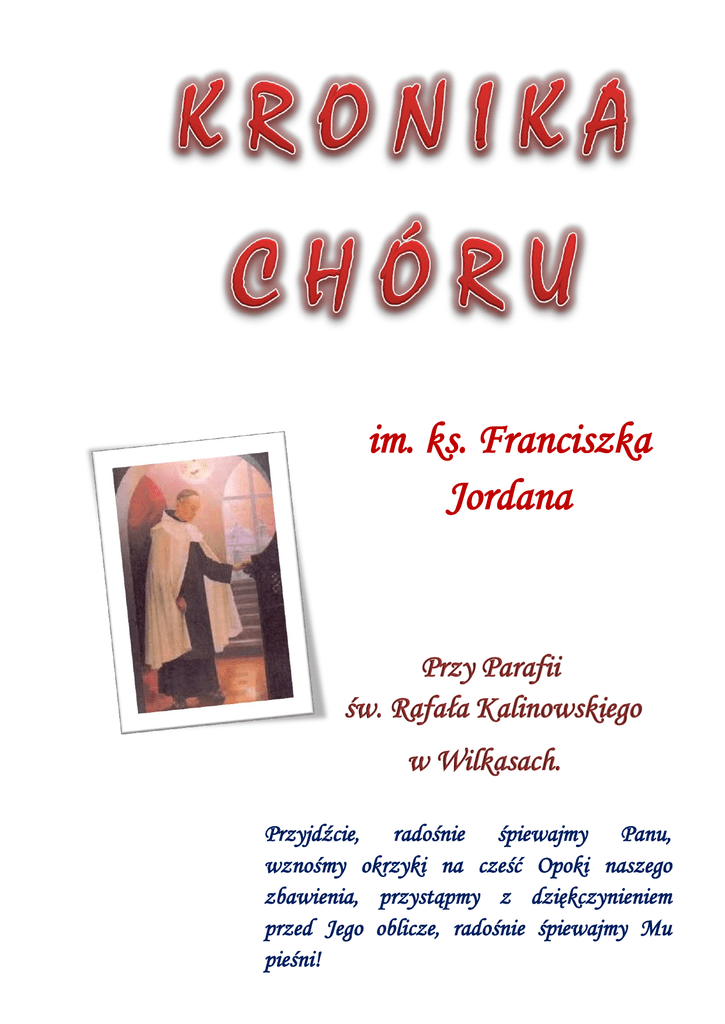 im. ks. Franciszka Jordana Przy Parafii św. Rafała Kalinowskiego w Wilkasach. Przyjdźcie, radośnie śpiewajmy Panu, wznośmy okrzyki na cześć Opoki naszego zbawienia, przystąpmy z dziękczynieniem przed Jego oblicze, radośnie śpiewajmy Mu pieśni! Psalm 95 Z początkiem 2011 roku wśród naszych duszpasterzy zrodziła się idea utworzenia chóru parafialnego, aby śpiewem wzbogacał liturgię i jednocześnie motywował uczestników nabożeństw do wspólnego śpiewania pieśni. Ksiądz proboszcz wezwał parafian do zgłaszania swoich kandydatur. Początki okazały się jednak bardzo trudne i nic nie wskazywało, że ta akcja rekrutacyjna zakończy się sukcesem. Jak zwykle w takich sytuacjach przeważały obawy i brak pozytywnego myślenia. Dominowały: niewiara we własne umiejętności wokalne i możliwości wygospodarowania czasu, a przede wszystkim brak tzw. cywilnej odwagi. To spowodowało, że na pierwsze spotkanie organizacyjne w dniu 15 lutego przybyło tylko kilka osób i decyzję o powołaniu chóru trzeba było odłożyć. W tej sytuacji ks. Jerzy ogłosił „pospolite ruszenie” pod hasłem – nie ważne czy umiesz śpiewać, ważne czy chcesz. Okazało się, że było to bardzo trafne posunięcie i już niebawem na liście chętnych znalazło się kilkanaście osób, które wkrótce metodą łagodnej perswazji zmobilizowały kolejnych kandydatów. I tak oto, zebrało się grono parafian, którzy zdecydowali się stworzyć chór przy Parafii św. Rafała Kalinowskiego. W dniu 22.02.2011 roku odbyło się drugie spotkanie, na które przybyło już kilkanaście osób i w związku z tym podjęto ostateczną decyzję o powołaniu chóru. Zatem, dzień 22 lutego 2011 roku stał się faktycznie dniem „narodzin” Chóru Parafialnego przy kościele pod wezwaniem św. Rafała Kalinowskiego w Wilkasach. Podczas tego spotkania dokonano zasadniczych uzgodnień organizacyjnych, i tak:  Funkcję dyrygenta i nauczyciela objął organista parafialny Pan Marek Wojciechowski;  Kierownikiem administracyjnym została Pani Halina Lis;  Skarbnikiem wybrano Panią Teresę Santo;  Prowadzenie kroniki chóru powierzono Pani Bożennie Górniak.  Uzgodniono terminy prób – wtorki, po mszy wieczornej. Członkowie chóru postanowili przyjąć nazwę „Chóru Parafialnego im. ks. Franciszka Jordana”, założyciela zgromadzeń zakonnych Salwatorianów i Salwatorianek. Franciszek Maria od Krzyża Jordan Podczas tego spotkania odbyły się też pierwsze zajęcia, które pokazały, że jest wiele osób potrafiących śpiewać i dysponujących odpowiednimi warunkami głosowymi, ale uczestników chóru czekają godziny wytężonej pracy indywidualnej i zespołowej, aby w przyszłości można było zaprezentować swoje umiejętności szerokiej publiczności. Pan Marek – dyrygent chóru - uznał jednak, że ta grupa jest zdolna osiągnąć bardzo wiele o ile wystarczy systematyczności, zapału i determinacji w dążeniu do osiągnięcia celów przez niego nakreślonych. Zasadniczym zaś celem w pierwszym okresie to: pozbyć się zahamowań, uwolnić swój głos – po prostu rozśpiewać się. D o połowy marca 2011 roku stabilizował się skład chóru. Część parafian, którzy w początkowym okresie nie zdecydowali się, aby wziąć udział w próbach, po wysłuchaniu relacji i opinii członków chóru na temat wymogów, sposobu pracy i atmosfery jak tam panuje, zgłosiło chęć uczestnictwa w zajęciach. W rezultacie do składu chóru parafialnego weszło: 17 kobiet oraz 8 mężczyzn (w tym dyrygent). SKŁAD OSOBOWY CHÓRU Marek WOJCIECHOWSKI (Dyrygent) Halina LIS (Kierownik Administracyjny) Teresa SANTO (Skarbnik) Bożenna GÓRNIAK (Kronikarz) Małgorzata BOĆ Halina FORYSIAK Bożena GRABIEC Alicja HEKSEL Lucyna KONCEWICZ Wiesława KORYCKA Mirosława MASŁOWSKA Kazimiera OSTROWSKA Teresa ROGOWSKA Małgorzata TOMCZYK Anna WASILEWSKA Stanisława WASILEWSKA Krystyna ĆWIKOWSKA Alicja WILCZYŃSKA Jan CIEPŁY Krzysztof DOMIANIUK Krzysztof KORYCKI Ryszard MASŁOWSKI Władysław WASILEWSKI Paweł WŁOSOWSKI Jerzy GULANOWSKI Przyjęto zasadę, że chór jest przez cały czas otwarty na przyjęcie wszystkich chętnych, którzy zapragną przyłączyć się do grona parafian pragnących swym śpiewem wzbogacać przebieg nabożeństw i wszelkich uroczystości kościelnych. pierwszym półroczu 2011 roku chór ograniczał swoje wystąpienia do udziału w mszach świętych w macierzystej parafii, przez cały czas doskonaląc swoje umiejętności. Zostało to zauważone przez miejscową społeczność (o czym świadczą bardzo przychylne opinie, jakie wypowiadano po każdym występie), ale przede wszystkim wiadomości o postępach chóru przekroczyły granice Wilkas, docierając do Giżycka oraz Diecezji Ełckiej. W w rezultacie, chór otrzymał propozycję udziału rocznicowych obchodach święta św. Brunona z Kwerfurtu – patrona giżyckiej parafii. Przyjęcie tego zaproszenia oznaczało, że chór wystąpi po raz pierwszy poza murami swojego kościoła. W dniu 3 lipca 2011 roku, na wzgórzu św. Brunona, podczas nabożeństwa koncelebrowanego przez J.E. ks. Ordynariusza Jerzego Mazura Diecezji Biskupa Ełckiej, chór zaprezentował się wiernym naszego dekanatu oraz zaproszonym gościom z kraju i zagranicy. Wykonane zostały psalmy i pieśni. Po zakończeniu mszy J.E. ks. Biskup Jerzy Mazur pogratulował dyrygentowi i członkom chóru, życzył sukcesów w dalszej pracy i udzielił błogosławieństwa. W okresie wakacyjnym chór zawiesił swoją działalność ze względu na małą frekwencję spowodowaną urlopami i wyjazdami, jednak w pierwszych dniach września wznowił próby. Trzeba było powrócić do „starych” tekstów i na nowo przetrenować poszczególne partie wokalne tak, aby osiągnąć poziom przedwakacyjny. Szczególnie trudne zadanie stanęło przed panem Markiem i Jego zespołem na początku października w związku z zaplanowanym w Wilkasach występem chórów w ramach „
