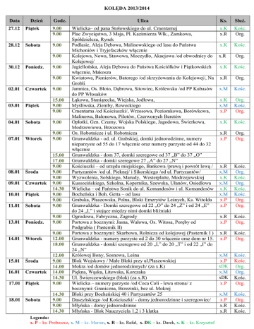 KOLĘDA 2013/2014 Data Dzień Godz. 27.12 Piątek 9.00 9.00 28.12 Sobota 9.00 9.00 30.12 Poniedz. 9.00 9.00 02.01 Czwartek 9.00 03.01 Piątek 15.00 9.00 9.00 04.01 Sobota 9.00 07.01 Wtorek 9.00 9.00 08.01 Środa 09.01 Czwartek 10.01 Piątek 11.01 Sobota 15.00 17.00 9.00 9.00 9.00 9.00 14.30 9.00 9.00 9.00 13.01 Poniedz. 9.00 9.00 14.01 Wtorek 15.01 Środa 16.01 Czwartek 17.01 Piątek 18.01 Sobota 9.00 12.00 18.00 12.00 9.00 14.00 14.00 14.30 9.00 14.30 9.00 9.00 14.30 Ks. Służ. Wielicka– od pana Stołowskiego do ul. Cmentarnej x.K Plac Zwycięstwa, 3 Maja, Pl. Kazimierza Wlk., Zamkowa, x.R Spółdzielcza, Rynek Podlasie, Aleja Dębowa, Malinowskiego od lasu do Państwa x.K Michoniów i Tryjefaczków włącznie Kolejowa, Nowa, Stawowa, Moczydło, Akacjowa /od obwodnicy do x.R Kolejowej/ Jagiellońska, Aleja Dębowa do Państwa Kościółków i Piątkowskich x.K włącznie, Makosza Kwiatowa, Pionierów, Batorego /od skrzyżowania do Kolejowej/, Na x.R Grobli Jamnica, Os. Błoto, Dąbrowa, Sitowiec, Królewska /od PP Kubasów x.M do PP Włosaków Łąkowa, Staniątecka, Wiejska, Jodłowa, x.K Myśliwska, Ziemby, Roweckiego x.M Cmentarna /od Kościuszki/, Wrzosowa, Poziomkowa, Borówkowa, x.P Malinowa, Balonowa, Pilotów, Czerwonych Beretów Opłotki, Gen. Czumy, Wojska Polskiego, Jagodowa, Świerkowa, x.K Modrzewiowa, Brzozowa Os. Robotnicze i ul. Robotnicza x.R Grunwaldzka - od. ul. Grabskiej, domki jednorodzinne, numery x.P nieparzyste od 55 do 17 włącznie oraz numery parzyste od 44 do 32 włącznie Grunwaldzka - dom 37, domki szeregowe od 37 „B” do 37 „O” Grunwaldzka - domki szeregowe 27 „A” do 27 „N” Kościuszki – od urzędu miejskiego, Bankowa /prawą i powrót lewą / x.R Partyzantów /od ul. Pieknej/ i Sikorskiego /od ul. Partyzantów/ x.M Wyzwolenia, Solskiego, Marudy, Westerplatte, Modrzejewskiej x.K Kussocińskiego, Szkolna, Kopernika, Szewska, Ułanów, Osiedlowa x.M Wielicka – od Państwa Sonik do ul. Komandosów i ul. Komandosów x.K Bocheńska i Boh. Getta – od lasu x.M Grabska, Płaszowska, Polna, Bloki Emerytów Leśnych, Ks. Witolda x.P Grunwaldzka - Domki szeregowe od 22 „O” do 24 „Ż” i od 24 „E” x.P do 24 „L” i stojące między nimi domki bliźniaki Ogrodowa, Fabryczna, Zagrody x.R Portowa z bocznymi: Jasna, Wałowa, Os. Witosa, Poręby od x.P Podgrabia ( Pasternik II) Portowa z bocznymi: Skarbowa, Rolnicza od kolejowej (Pasternik I ) x.R Grunwaldzka - numery parzyste od 2 do 30 włącznie oraz dom nr 15. x.P Grunwaldzka - domki szeregowe od 20 „L” do 20 „T” i od 22 „I” do 24 „N” Królowej Bony, Sosnowa, Leśna x.M Blok Wojskowy / Małe Bloki przy ul.Płaszowskiej x.P xDK Mokra /od domów jednorodzinnych/ (za x.K) Piękna, Wąska, Litewska, Korczaka x.M xDK Ul. Świerczewskiego (blok) (za x.R) Wielicka – numery parzyste /od Coca Coli - lewa strona/ z x.P bocznymi: Graniczna, Brzezinki, bez ul. Mokrej Bloki przy Bocheńskiej 40 i Partyzantów 25 x.M Daszyńskiego /od Kościuszki/ - domy jednorodzinne i szeregowiec/ x.P Młyńska - domy jednorodzinne x.R Młyńska - Blok Nauczyciela 1,2 i 3 klatka x.R Kośc. Org. Ulica Legenda: x. P – ks. Proboszcz, x. M – ks. Marian, x. R – ks. Rafał, x. DK – ks. Darek, x. K – ks. Krzysztof Kośc. Org. Kośc. Org. Kośc. Org. Kośc. Org. Kośc. Org. Org. Kośc. Org. Kośc. Org. Kośc. Kośc. Org. Org. Kośc. Org. Kośc. Org. Kośc. Kośc. Org. Org. Kośc. Org. Kośc. Org. Kośc. Kośc.