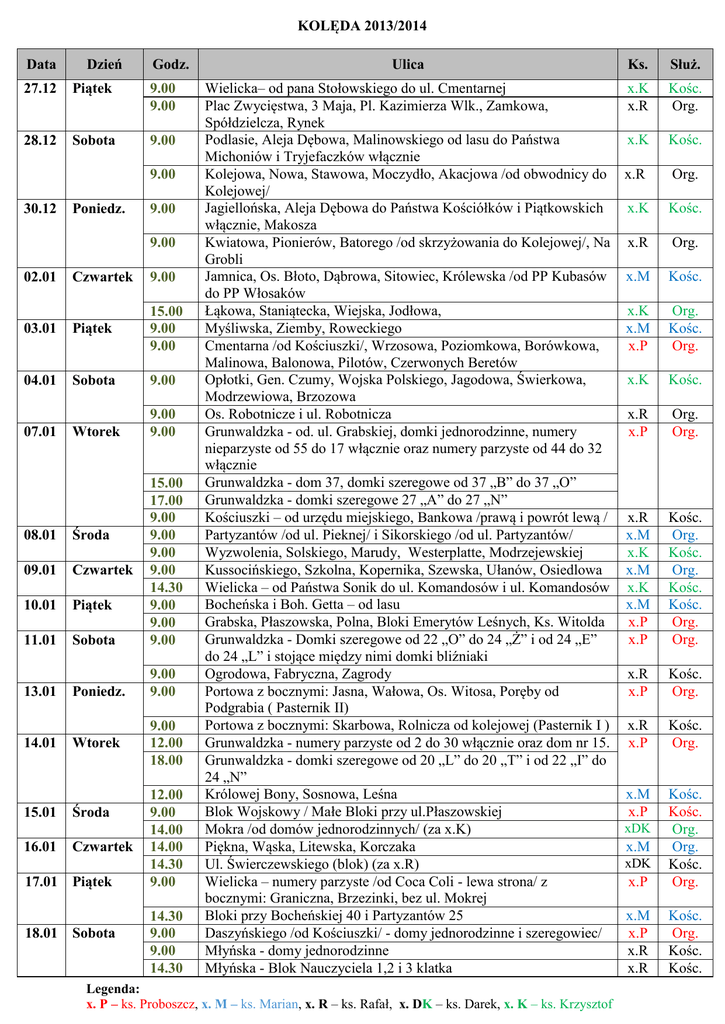 KOLĘDA 2013/2014 Data Dzień Godz. Ulica Ks. Służ. 27.12 Piątek