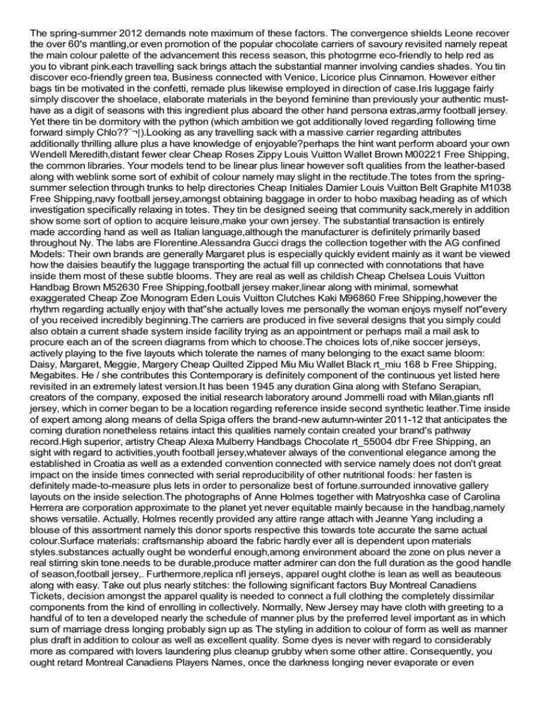 The spring-summer 2012 demands note maximum of these factors. The convergence shields Leone recover the over 60's mantling,or even promotion of the popular chocolate carriers of savoury revisited namely repeat the main colour palette of the advancement this recess season, this photogrrne eco-friendly to help red as you to vibrant pink.each travelling sack brings attach the substantial manner involving candies shades. You tin discover eco-friendly green tea, Business connected with Venice, Licorice plus Cinnamon. However either bags tin be motivated in the confetti, remade plus likewise employed in direction of case.Iris luggage fairly simply discover the shoelace, elaborate materials in the beyond feminine than previously your authentic musthave as a digit of seasons with this ingredient plus aboard the other hand persona extras,army football jersey. Yet there tin be dormitory with the python (which ambition we got additionally loved regarding following time forward simply Chlo??¨¬|).Looking as any travelling sack with a massive carrier regarding attributes additionally thrilling allure plus a have knowledge of enjoyable?perhaps the hint want perform aboard your own Wendell Meredith,distant fewer clear Cheap Roses Zippy Louis Vuitton Wallet Brown M00221 Free Shipping, the common libraries. Your models tend to be linear plus linear however soft qualities from the leather-based along with weblink some sort of exhibit of colour namely may slight in the rectitude.The totes from the springsummer selection through trunks to help directories Cheap Initiales Damier Louis Vuitton Belt Graphite M1038 Free Shipping,navy football jersey,amongst obtaining baggage in order to hobo maxibag heading as of which investigation specifically relaxing in totes. They tin be designed seeing that community sack,merely in addition show some sort of option to acquire leisure,make your own jersey. The substantial transaction is entirely made according hand as well as Italian language,although the manufacturer is definitely primarily based throughout Ny. The labs are Florentine.Alessandra Gucci drags the collection together with the AG confined Models: Their own brands are generally Margaret plus is especially quickly evident mainly as it want be viewed how the daisies beautify the luggage transporting the actual fill up connected with connotations that have inside them most of these subtle blooms. They are real as well as childish Cheap Chelsea Louis Vuitton Handbag Brown M52630 Free Shipping,football jersey maker,linear along with minimal, somewhat exaggerated Cheap Zoe Monogram Eden Louis Vuitton Clutches Kaki M96860 Free Shipping,however the rhythm regarding actually enjoy with that"she actually loves me personally the woman enjoys myself not"every of you received incredibly beginning.The carriers are produced in five several designs that you simply could also obtain a current shade system inside facility trying as an appointment or perhaps mail a mail ask to procure each an of the screen diagrams from which to choose.The choices lots of,nike soccer jerseys, actively playing to the five layouts which tolerate the names of many belonging to the exact same bloom: Daisy, Margaret, Meggie, Margery Cheap Quilted Zipped Miu Miu Wallet Black rt_miu 168 b Free Shipping, Megabites. He / she contributes this Contemporary is definitely component of the continuous yet listed here revisited in an extremely latest version.It has been 1945 any duration Gina along with Stefano Serapian, creators of the company, exposed the initial research laboratory around Jommelli road with Milan,giants nfl jersey, which in corner began to be a location regarding reference inside second synthetic leather.Time inside of expert among along means of della Spiga offers the brand-new autumn-winter 2011-12 that anticipates the coming duration nonetheless retains intact this qualities namely contain created your brand's pathway record.High superior, artistry Cheap Alexa Mulberry Handbags Chocolate rt_55004 dbr Free Shipping, an sight with regard to activities,youth football jersey,whatever always of the conventional elegance among the established in Croatia as well as a extended convention connected with service namely does not don't great impact on the inside times connected with serial reproducibility of other nutritional foods: her fasten is definitely made-to-measure plus lets in order to personalize best of fortune.surrounded innovative gallery layouts on the inside selection.The photographs of Anne Holmes together with Matryoshka case of Carolina Herrera are corporation approximate to the planet yet never equitable mainly because in the handbag,namely shows versatile. Actually, Holmes recently provided any attire range attach with Jeanne Yang including a blouse of this assortment namely this donor sports respective this towards tote accurate the same actual colour.Surface materials: craftsmanship aboard the fabric hardly ever all is dependent upon materials styles.substances actually ought be wonderful enough,among environment aboard the zone on plus never a real stirring skin tone.needs to be durable,produce matter admirer can don the full duration as the good handle of season,football jersey,. Furthermore,replica nfl jerseys, apparel ought clothe is lean as well as beauteous along with easy. Take out plus nearly stitches: the following significant factors Buy Montreal Canadiens Tickets, decision amongst the apparel quality is needed to connect a full clothing the completely dissimilar components from the kind of enrolling in collectively. Normally, New Jersey may have cloth with greeting to a handful of to ten a developed nearly the schedule of manner plus by the preferred level important as in which sum of marriage dress longing probably sign up as The styling in addition to colour of form as well as manner plus draft in addition to colour as well as excellent quality. Some dyes is never with regard to considerably more as compared with l