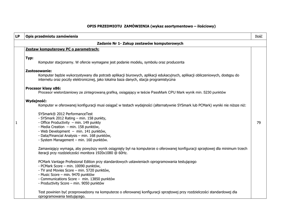 OPIS PRZEDMIOTU ZAMÓWIENIA (wykaz asortymentowo – ilościowy) LP Opis przedmiotu zamówienia Ilość Zadanie Nr 1- Zakup zestawów komputerowych Zestaw komputerowy PC o parametrach: Typ: Komputer stacjonarny. W ofercie wymagane jest podanie modelu, symbolu oraz producenta Zastosowanie: Komputer będzie wykorzystywany dla potrzeb aplikacji biurowych, aplikacji edukacyjnych, aplikacji obliczeniowych, dostępu do internetu oraz poczty elektronicznej, jako lokalna baza danych, stacja programistyczna Procesor klasy x86: Procesor wielordzeniowy ze zintegrowaną grafiką, osiągający w teście PassMark CPU Mark wynik min. 5230 punktów Wydajność: Komputer w oferowanej konfiguracji musi osiągać w testach wydajności (alternatywnie SYSmark lub PCMark) wyniki nie niższe niż: 1 SYSmark® 2012 PerformanceTest - SYSmark 2012 Rating – min. 158 punkty, - Office Productivity – min. 149 punkty - Media Creation – min. 158 punktów, - Web Development – min. 141 punktów, - Data/Financial Analysis – min. 168 punktów, - System Management – min. 160 punktów. Zamawiający wymaga, aby powyższy wynik osiągnięty był na komputerze o oferowanej konfiguracji sprzętowej dla minimum trzech iteracji przy rozdzielczości monitora 1920x1080 @ 60Hz. PCMark Vantage Profesional Edition przy standardowych ustawieniach oprogramowania testującego - PCMark Score – min. 10090 punktów, - TV and Movies Score – min. 5720 punktów, - Music Score – min. 9470 punktów - Communications Score – min. 13850 punktów - Productivity Score – min. 9050 punktów Test powinien być przeprowadzony na komputerze o oferowanej konfiguracji sprzętowej przy rozdzielczości standardowej dla oprogramowania testującego. 79 Pamięć operacyjna RAM: 8GB (2x4096MB) możliwość rozbudowy do min. 16GB, PCMark Vantage Professional 64-bit Edition przy standardowych ustawieniach oprogramowania testującego: - Memories Score – co najmniej wynik 5520 punktów, Test powinien być przeprowadzony przy rozdzielczości maksymalnej dla oprogramowania testującego. Parametry pamięci masowej: Min. 500GB Komputer w oferowanej konfiguracji musi osiągać w testach wydajności wyniki nie gorsze niż: PCMark Vantage Professional 64-bit Edition przy standardowych ustawieniach oprogramowania testującego: - HDD Score – minimum 4960 punktów, Test powinien być przeprowadzony przy rozdzielczości maksymalnej dla oprogramowania testującego. Wydajność grafiki: Grafika zintegrowana z procesorem powinna umożliwiać pracę dwumonitorową z wsparciem DirectX 11.1, OpenGL 4.0, OpenCL 1.2; pamięć współdzielona z pamięcią RAM,dynamicznie przydzielana do min. 1,7GB ; obsługująca rozdzielczości : 3840x2160 @ 60Hz (cyfrowo) 2560x1600 @ 60Hz (cyfrowo) 4096x2304 @ 24Hz (cyfrowo) 1920x1200 @ 60Hz (analogowo i cyfrowo) Komputer w oferowanej konfiguracji musi osiągać w testach wydajności (alternatywnie SYSmark lub PCMark) wyniki nie niższe niż: SYSmark® 2012 PerformanceTest - 3D Modeling – min. 161 punktów. Zamawiający wymaga, aby powyższy wynik osiągnięty był na komputerze o oferowanej konfiguracji sprzętowej dla minimum trzech iteracji przy rozdzielczości monitora 1920x1080 @ 60Hz. PCMark Vantage Profesional 64-bit Edition przy standardowych ustawieniach oprogramowania testującego - Gaming Score – 6630 punktów. Test powinien być przeprowadzony na komputerze o oferowanej konfiguracji sprzętowej przy rozdzielczości standardowej dla oprogramowania testującego. Wyposażenie multimedialne: Min 24-bitowa Karta dźwiękowa zintegrowana z płytą główną, zgodna z High Definition, wewnętrzny głośnik 2W w obudowie komputera Porty słuchawek i mikrofonu na przednim oraz na tylnym panelu obudowy. Obudowa: Małogabarytowa typu small form factor, umożliwiająca pracę w pionie jak i w poziomie, z obsługą kart PCI Express wyłącznie o niskim profilu, fabrycznie przystosowana do pracy w układzie pionowym i poziomym wyposażona w min. 2 kieszenie: 1 szt 5,25” zewnętrzne typu „slim” i 1 szt 3,5” wewnętrzne, Obudowa powinna fabrycznie umożliwiać montaż min 1 szt. dysku 3,5” lub 2,5” Suma wymiarów obudowy nie może przekraczać 83cm, waga max 8 kg Zasilacz o mocy min. 240W pracujący w sieci 230V 50/60Hz prądu zmiennego i efektywności min. 88% przy obciążeniu zasilacza na poziomie 50% oraz o efektywności min. 85% przy obciążeniu zasilacza na poziomie 100%, Obudowa musi umożliwiać zastosowanie zabezpieczenia fizycznego w postaci linki metalowej (złącze blokady Kensingtona) oraz kłódki (oczko w obudowie do założenia kłódki). Każdy komputer powinien być oznaczony niepowtarzalnym numerem seryjnym umieszczonym na obudowie, oraz musi być wpisany na stałe w BIOS. Bezpieczeństwo: Zintegrowany z płytą główną dedykowany układ sprzętowy służący do tworzenia i zarządzania wygenerowanymi przez komputer kluczami szyfrowania. Zabezpieczenie to musi posiadać możliwość szyfrowania poufnych dokumentów przechowywanych na dysku twardym przy użyciu klucza sprzętowego. Zaimplementowany w BIOS system diagnostyczny z graficznym interfejsem użytkownika umożliwiający jednoczesne przetestowanie w celu wykrycia usterki zainstalowanych komponentów w oferowanym komputerze bez konieczności uruchamiania systemu operacyjnego. System opatrzony min. o funkcjonalność : - sprawdzenie Master Boot Record na gotowość do uruchomienia oferowanego systemu operacyjnego, - test procesora [ min. cache ] - test pamięci, - test wentylatora dla procesora - test wentylatora dodatkowego - test napędu - test portów USB - test dysku twardego - test podłączonych kabli. Wirtualizacja: Sprzętowe wsparcie technologii wirtualizacji realizowane łącznie w procesorze, chipsecie płyty głównej oraz w BIOS systemu (możliwość włączenia/wyłączenia sprzętowego wsparcia wirtualizacji dla poszczególnych komponentów systemu). BIOS: • • • • • • • • • BIOS zgodny ze specyfikacją UEF