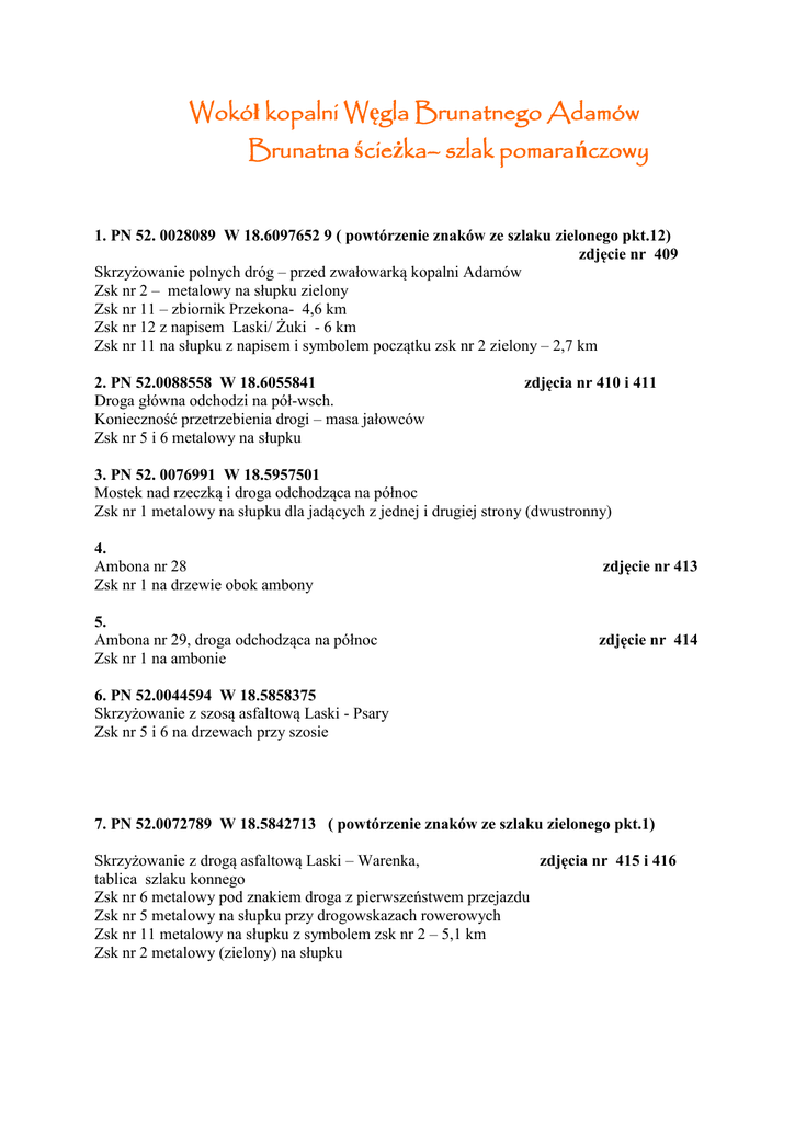 Wokół kopalni Węgla Brunatnego Adamów Brunatna ścieżka– szlak pomarańczowy 1. PN 52. 0028089 W 18.6097652 9 ( powtórzenie znaków ze szlaku zielonego pkt.12) zdjęcie nr 409 Skrzyżowanie polnych dróg – przed zwałowarką kopalni Adamów Zsk nr 2 – metalowy na słupku zielony Zsk nr 11 – zbiornik Przekona- 4,6 km Zsk nr 12 z napisem Laski/ Żuki - 6 km Zsk nr 11 na słupku z napisem i symbolem początku zsk nr 2 zielony – 2,7 km 2. PN 52.0088558 W 18.6055841 Droga główna odchodzi na pół-wsch. Konieczność przetrzebienia drogi – masa jałowców Zsk nr 5 i 6 metalowy na słupku zdjęcia nr 410 i 411 3. PN 52. 0076991 W 18.5957501 Mostek nad rzeczką i droga odchodząca na północ Zsk nr 1 metalowy na słupku dla jadących z jednej i drugiej strony (dwustronny) 4. Ambona nr 28 Zsk nr 1 na drzewie obok ambony zdjęcie nr 413 5. Ambona nr 29, droga odchodząca na północ Zsk nr 1 na ambonie zdjęcie nr 414 6. PN 52.0044594 W 18.5858375 Skrzyżowanie z szosą asfaltową Laski - Psary Zsk nr 5 i 6 na drzewach przy szosie 7. PN 52.0072789 W 18.5842713 ( powtórzenie znaków ze szlaku zielonego pkt.1) Skrzyżowanie z drogą asfaltową Laski – Warenka, zdjęcia nr 415 i 416 tablica szlaku konnego Zsk nr 6 metalowy pod znakiem droga z pierwszeństwem przejazdu Zsk nr 5 metalowy na słupku przy drogowskazach rowerowych Zsk nr 11 metalowy na słupku z symbolem zsk nr 2 – 5,1 km Zsk nr 2 metalowy (zielony) na słupku 8. PN 52.0087838 W. 18.5850699 Droga polna odchodzi w las, jedziemy drogą asfaltową Zsk nr 1 metalowe na słupkach dla każdej ze stron 2 szt. 9. PN 52.0127957 W 18.5825174 Prostopadła droga asfaltowa Początek niebieskiego szlaku konnego (szlak na skraju lasu) Zsk nr 5 i 6 metalowe na słupku Zsk nr 2 ( niebieski) na słupku Zsk nr 3 metalowy na słupku Zsk nr 1 metalowy na słupku zdjęcie nr 421 zdjęcie nr 423 i 424 10. współrzędne brak Główne skrzyżowanie leśnych dróg Zsk nr 11 metalowy na słupku – Zbiornik Przykona – 4,6 11. PN 52.0264201 W 18.6644926 Koniec lasu Zsk nr 1 - 12 szt., na drzewach dla jadących z jednej i drugiej strony 12. PN 52.0149838 W 18.6636420 Po 300 m Skrzyżowanie polnych dróg Zsk nr 5 i 6 metalowe na słupkach 13. PN 52. 0122780 W. 18.6565540 Skrzyżowanie polnych dróg – widoczny zalew Przykona Zsk nr 1 metalowe na słupkach za i przed skrzyżowaniem – 2szt. 14. PN 52.0093230 W 18.6504238 zdjęcia nr 488 – 494 Droga dochodzi na skraj terenu należącego do Kopalni Adamów, szlaban Przed nami na wyczucie 4,6 km ugoru z rowem o głębokości 1-1,5 m Abstrahując od pomysłu przebiegu tej trasy w tym miejscu … Proponuję dać tablicę z informacją o konieczności jechania stępa i kłusem z wielką uwagą ze wzg. na ugór i mało widoczne rowy… Zsk. nr 11 metalowy na słupku Sacały – 7,2 km Zsk nr 11 metalowy na słupku – symbol zsk nr 2( niebieski) – 4,6 km 15. współrzędne brak Przed polną drogą prostopadła prowadzącą do Psar Zsk nr 5 i 6 metalowy na słupku 16. PN 51.9935695 W 18.6172178 Mostek betonowy Zsk nr 3 na betonowym słupie malowane Zsk nr 4 metalowy na słupku 17. PN 52. 0028089 W 18.6097652 zdjęcie nr 409 Skrzyżowanie polnych dróg – przed zwałowarką kopalni Adamów Ilość tablic informacyjnych z mapą szlaku konnego – 2 Ilość miejsc popasu – 1 Ilość znaków nr 1 metalowych na słupku - ( 6 szt. znaków i 5 szt. słupków) Ilość znaków nr 1 malowanych – 14 szt. Ilość znaków nr 2 metalowych na słupku - 3 szt. Ilość znaków nr 3 malowanych - 1 szt. Ilość znaków nr 4 metalowych na słupku - 1 szt. Ilość znaków nr 5 metalowych na słupku – 6 szt. Ilość znaków nr 6 metalowych na słupku – 6 szt. Ilość znaków nr 11 metalowych na słupku – 6 szt. Ilość znaków nr 12 metalowych na słupku – 1 szt.