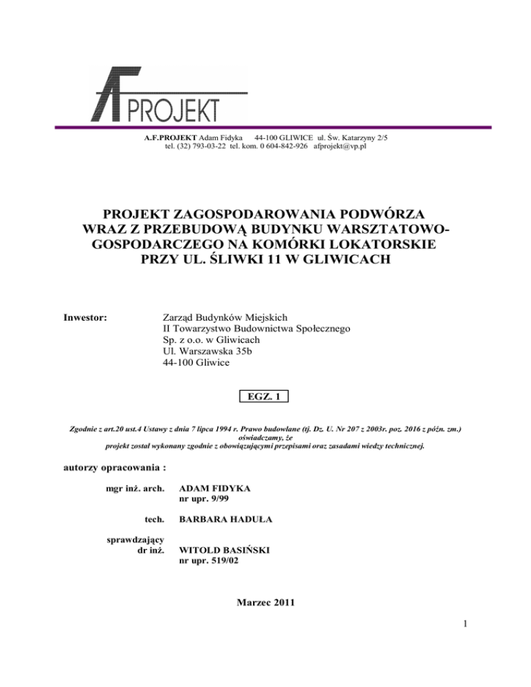 A.F.PROJEKT Adam Fidyka 44-100 GLIWICE ul. Św. Katarzyny 2/5 tel. (32) 793-03-22 tel. kom. 0 604-842-926 [email protected] PROJEKT ZAGOSPODAROWANIA PODWÓRZA WRAZ Z PRZEBUDOWĄ BUDYNKU WARSZTATOWOGOSPODARCZEGO NA KOMÓRKI LOKATORSKIE PRZY UL. ŚLIWKI 11 W GLIWICACH Inwestor: Zarząd Budynków Miejskich II Towarzystwo Budownictwa Społecznego Sp. z o.o. w Gliwicach Ul. Warszawska 35b 44-100 Gliwice EGZ. 1 Zgodnie z art.20 ust.4 Ustawy z dnia 7 lipca 1994 r. Prawo budowlane (tj. Dz. U. Nr 207 z 2003r. poz. 2016 z późn. zm.) oświadczamy, że projekt został wykonany zgodnie z obowiązującymi przepisami oraz zasadami wiedzy technicznej. autorzy opracowania : mgr inż. arch. tech. sprawdzający dr inż. ADAM FIDYKA nr upr. 9/99 BARBARA HADUŁA WITOLD BASIŃSKI nr upr. 519/02 Marzec 2011 1 SPIS ZAWARTOŚCI OPRACOWANIA I. CZĘŚĆ OGÓLNA 1. 2. 3. 4. PRZEDMIOT I ZAKRES OPRACOWANIA PODSTAWA OPRACOWANIA LOKALIZACJA STAN ISTNIEJĄCY PODWÓRZA II. OPIS TECHNICZNY 1. 2. 3. 4. 5. 6. 7. OPIS ZAMIERZENIA ROZBIÓRKA BUDYNKU WARSZTATOWO-GOSPODARCZEGO KOMÓRKI LOKATORSKIE STANOWISKO NA ŚMIETNIK WRAZ Z MURKIEM OPOROWYM MUREK PRZY WSCHODNIEJ GRANICY DZIAŁKI NAWIERZCHNIA PODWÓRZA ZESTAWIENIE POWIERZCHNI PODWÓRZA III. UWAGI KOŃCOWE IV. INFORAMCJA DOTYCZĄCA BEZPIECZEŃSTWA I OCHRONY ZDROWIA V. SPECYFIKACJA TECHNICZNA WYKONANIA I ODBIORU ROBÓT w egz. 4 i 5 VI. DOKUMENTACJA FOTOGRAFICZNA STANU ISTNIEJĄCEGO VII. CZĘŚĆ GRAFICZNA 1. 2. 3. 4. 5. 6. 7. 8. 9. PLAN SYTUACYJNY BUDYNEK WARSZTATOWO-GOSPODARCZY.RYSUNEK ROZBIÓRKI. RZUTY BUDYNEK WARSZTATOWO-GOSPODARCZY.RYSUNEK ROZBIÓRKI.PRZEKRÓJ ZAGOSPODAROWANIE PODWÓRZA KOMÓRKI LOKATORSKIE DRZWI DESKOWE DO KOMÓREK STANOWISKO NA ŚMIETNIK WRAZ MURKIEM OPOROWYM MUREK PRZY GRANICY DZIAŁKI NAWIERZCHNIE 1 : 500 1 : 100 1 : 100 1 : 200 1 : 50 1 : 50 1 : 50 1 : 20 1 : 20 2 I. CZĘŚĆ OGÓLNA 1. PRZEDMIOT I ZAKRES OPRACOWANIA Przedmiotem niniejszego opracowania jest projekt zagospodarowania podwórza budynku mieszkalnego przy ul. Jana Śliwki 11 w Gliwicach. Zakres projektu obejmuje remont nawierzchni podwórza wraz z odwodnieniem, wykonanie stanowiska na śmietnik oraz przebudowę budynku warsztatowo-gospodarczego na siedem komórek lokatorskich wraz z częściową jego rozbiórką. Rozbiórka pozostałych budynków gospodarczych została ujęta w odrębnym opracowaniu. 2. PODSTAWA OPRACOWANIA 2.1. Umowa z inwestorem: Zarząd Budynków Mieszkalnych II Towarzystwo Budownictwa Społecznego Sp. z o.o. w Gliwicach. 2.2. Mapa zasadnicza w skali 1 : 500; 2.3. Projekt remontu elewacji wraz z dociepleniem (wykonany przez pracownię A.F.PROJEKT – 11.2010 r.). 2.4. Inwentaryzacja budynków gospodarczych (wyk. przez pracownię projektową PP-U „ABRYS” w 2010 roku – mgr inż. arch. M. Laskowski) 2.5. Uzgodnienia robocze z inwestorem (ZBM II TBS w Gliwicach). 2.6. Wizja lokalna i dokumentacja fotograficzna 3. LOKALIZACJA Przedmiotowe podwórze mieści się za budynkiem mieszkalnym, na działce przy ul. Jana Śliwki 11, z wjazdem wzdłuż zachodniej elewacji działki. Od strony południowozachodniej zamknięte ogrodzeniem. Od strony północno-wschodniej, strony wjazdu na posesję, nie ograniczone ogrodzeniem, łączące się z wjazdem na dziąłkę sąsiadującą. 4. STAN ISTNIEJĄCY PODWÓRZA Podwórze dostępne jest wjazdem wzdłuż północnej wschodniej elewacji budynku mieszkalnego. Wokół budynku mieszczą się zabudowania gospodarcze: wzdłuż południowozachodniej granicy działki nieużytkowany 2-kondygnacyjny budynek warsztatowo- gospodarczy przeznaczony do częściowej rozbiórki i przebudowy na komórki lokatorskie. 3 Poza budynkiem działkę od tej strony zamyka betonowe ogrodzenie. Wzdłuż i przy północno-wschodniej granicy działki znajduje się budynek gospodarczy z komórkami lokatorskimi i przybudowanym garażem, przeznaczony do rozbiórki wg odrębnego opracowania. Znajdujące się w głębi małe komórki gospodarcze (również przeznaczone do rozbiórki) wraz z siatkowym ogrodzeniem zamykają utwardzony teren podwórza od południowego-zachodu. Dalej poza komórkami znajduje się teren zielony– ogródek. Nawierzchnia podwórza jest utwardzona - wyłożona płytami betonowymi typu „TRYLINKA” – obecnie z licznymi nierównościami powodującymi w czasie deszczu zalewiska, szczególnie przy budynku mieszkalnym (niekorzystny spadek terenu). W pobliżu wjazdu przy granicy działki rosną trzy drzewa. 4 II. OPIS TECHNICZNY 1. OPIS ZAMIERZENIA W ramach podwórza przy budynku przewidywane są do wykonania następujące prace: − rozbiórka zlokalizowanego kondygnacyjnego budynku wzdłuż północno-wschodniej gospodarczego z granicy komórkami działki 2- lokatorskimi i przybudowanym garażem oraz małych komórek gospodarczych w głębi działki (ujęte w odrębnym opracowaniu), − częściowa rozbiórka budynku warsztatowo-gospodarczego, z przeznaczeniem zachowanej części na komórki lokatorskie oraz śmietnik. − remont istniejącego muru w granicy działki oraz wykonanie małych murków z kwietnikami wokół drzew. − rozbiórka starej nawierzchni z bloczków betonowych i wykonanie nowej z kostki betonowej, w tym wykonanie miejsc parkingowych oraz uporządkowanie uzyskanego terenu zielonego. 2. ROZBIÓRKA BUDYNKU WARSZTATOWO-GOSPODARCZEGO 2.1. Stan istniejący budynku Budynek warsztatowo-gospodarczy jest budynkiem wolnostojącym, 2-kondygnacyjnym, niepodpiwniconym. Budynek murowany z cegły, strop nad parterem drewniany; dach jednospadowy o więźbie drewnianej, schody stalowe (wewętrzne i zewnętrzne). Budynek był wyposażony w instalację wodną kanalizacyjną i elektryczną. W budynku znajdują się pozostałości wyposażenia technologicznego. 2.2. Rozbiórka budynku. Rozbiórkę należy wykonywać w kolejności odwrotnej do budowy budynku. Należy kolejno: - usunąć elementy instalacji i wyposażenia z wnętrza budynku, a także zewnętrzne wygrodzenia. - zdemontować elementy stolarki i ślusarki, - rozebrać elementy z