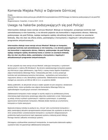 Komenda Miejska Policji w Dąbrowie Górniczej Źródło: http://www.dabrowa.slaska.policja.gov.pl/ka8/informacje/wiadomosci/25378,Uwaga-na-hakerow-podszywajacych-sie-pod-Poli cje.html Wygenerowano: Czwartek, 2 marca 2017, 14:41 Uwaga na hakerów podszywających się pod Policję! Internautów atakuje nowa wersja wirusa Weelsof. Blokuje on komputer, przejmuje kontrolę nad zainstalowaną w nim kamerką, a na ekranie pojawia się komunikat o nagrywaniu obrazu. Hakerzy, podszywając się pod Policję, żądają następnie wpłaty określonej kwoty w zamian za usunięcie blokady. Aby nie stać się ofiarą ataku, pamiętajmy o korzystaniu z legalnych i aktualizowanych programów antywirusowych. Internautów atakuje nowa wersja wirusa Weelsof. Blokuje on komputer, przejmuje kontrolę nad zainstalowaną w nim kamerką, a na ekranie pojawia się komunikat o nagrywaniu obrazu. Hakerzy, podszywając się pod Policję, żądają następnie wpłaty określonej kwoty w zamian za usunięcie blokady. Aby nie stać się ofiarą ataku, pamiętajmy o korzystaniu z legalnych i aktualizowanych programów antywirusowych. W sieci pojawiła się nowa wersja wirusa Weelsof, atakująca komputery z systemami operacyjnymi z rodziny MS Windows®. Na ekranie zaatakowanego komputera pojawia się informacja o jego zablokowaniu, logo Policji z nazwą miasta Sępólno Krajeńskie i zdjęcie Komendanta Głównego Policji. Ciekawostką jest fakt, iż wirus przejmuje kontrolę nad zainstalowaną kamerką internetową – wyświetlany jest komunikat o nagrywaniu obrazu w celu identyfikacji użytkownika. Odblokowanie komputera ma nastąpić po uiszczeniu od 200 do 500 zł m.in. w systemie UKASH. Należy podkreślić, że aktywność wirusa w żaden sposób nie jest związana z działaniami polskiej Policji. Użyta symbolika oraz zdjęcie Komendanta Głównego Policji są ogólnodostępne na policyjnych stronach internetowych. Zablokowanie komputera może nastąpić w wyniku wejścia na zainfekowaną stronę internetową bądź otworzenia zarażonego załącznika wiadomości e-mail. Dokonywane są wtedy zmiany w plikach systemowych i rejestrze systemowym, co powoduje ograniczenie funkcjonalności komputera. Blokada działa również po uruchomieniu komputera w trybie awaryjnym. Najskuteczniejszą metodą na pozbycie się „intruza” jest uruchomienie komputera z płyty zawierającej aktualne oprogramowanie antywirusowe (do uzyskania za darmo ze stron producentów) i przeskanowanie komputera z usunięciem zdiagnozowanych problemów bądź przywrócenie kopii zapasowej systemu zrobionej przed infekcją. Pomaga również całkowita reinstalacja systemu. Ostrzegamy użytkowników zarażonych komputerów, że ewentualne dokonanie wpłaty i uzyskanie kodu nie gwarantuje odblokowania komputera. Źródło: Biuro Kryminalne KGP / mg Ocena: 0/5 (0) Tweetnij