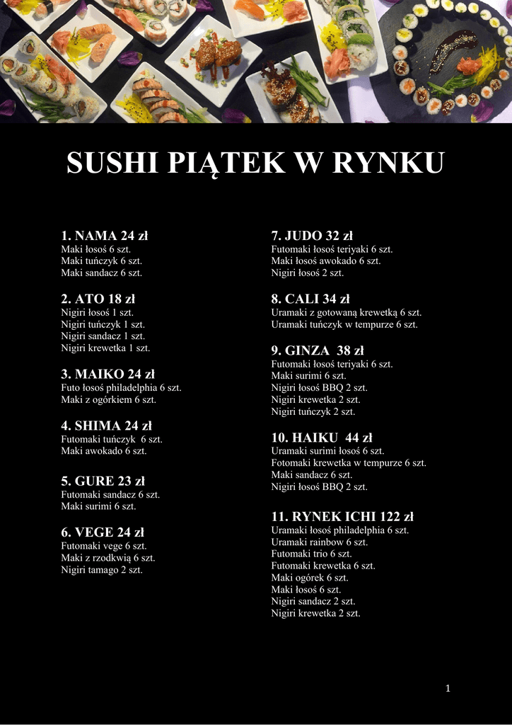 SUSHI PIĄTEK W RYNKU 1. NAMA 24 zł 7. JUDO 32 zł Maki łosoś 6 szt. Maki tuńczyk 6 szt. Maki sandacz 6 szt. Futomaki łosoś teriyaki 6 szt. Maki łosoś awokado 6 szt. Nigiri łosoś 2 szt. 2. ATO 18 zł 8. CALI 34 zł Nigiri łosoś 1 szt. Nigiri tuńczyk 1 szt. Nigiri sandacz 1 szt. Nigiri krewetka 1 szt. Uramaki z gotowaną krewetką 6 szt. Uramaki tuńczyk w tempurze 6 szt. 3. MAIKO 24 zł Futo łosoś philadelphia 6 szt. Maki z ogórkiem 6 szt. 4. SHIMA 24 zł Futomaki tuńczyk 6 szt. Maki awokado 6 szt. 5. GURE 23 zł Futomaki sandacz 6 szt. Maki surimi 6 szt. 6. VEGE 24 zł Futomaki vege 6 szt. Maki z rzodkwią 6 szt. Nigiri tamago 2 szt. 9. GINZA 38 zł Futomaki łosoś teriyaki 6 szt. Maki surimi 6 szt. Nigiri łosoś BBQ 2 szt. Nigiri krewetka 2 szt. Nigiri tuńczyk 2 szt. 10. HAIKU 44 zł Uramaki surimi łosoś 6 szt. Fotomaki krewetka w tempurze 6 szt. Maki sandacz 6 szt. Nigiri łosoś BBQ 2 szt. 11. RYNEK ICHI 122 zł Uramaki łosoś philadelphia 6 szt. Uramaki rainbow 6 szt. Futomaki trio 6 szt. Futomaki krewetka 6 szt. Maki ogórek 6 szt. Maki łosoś 6 szt. Nigiri sandacz 2 szt. Nigiri krewetka 2 szt. 1 12. RYNEK NI 114 zł 13. RYNEK SAN 179 zł Uramaki łosoś teriyaki 6 szt. Uramaki tuńczyk w tempurze 6 szt. Futomaki sandacz w tempurze 6 szt. Futomaki łosoś w tempurze 6 szt. Maki łosoś teriyaki 6 szt. Nigiri łosoś BB2 2 szt. Nigiri krewetka 2 szt. Uramaki łosoś phyladelphia 6 szt. Uramaki tuńczyk w tempurze 6 szt. Uramaki sandacz 6 szt. Futomaki łosoś teriyaki 6 szt. Futomaki krewetka w tempurze 6 szt. Futomaki tatar łosoś 6 szt. Maki awokado 6 szt. Maki krewetka 6 szt. Nigiri łosoś 2 szt. Nigiri tuńczyk 2 szt. Nigiri sandacz 2 szt. Nigiri krewetka 2 szt. POJEDYNCZE ROLKI NIGIRI 1. 2. 3. 4. 5. 6. Łosoś 2 szt. (salmonnigiri) 12 zł Tuńczyk 2 szt. (tunanigiri) 14 zł Sandacz 2 szt. (suzukinigiri) 12 zł Krewetka 2 szt. (ebinigiri) 12 zł Tamago 2 szt. (tamagonigiri) 10 zł Łosoś BBQ 2 szt. (salmonnigiri BBQ) 14 zł MAKI 1. Łosoś 6 szt. (salmonmaki) 10 zł 2. Tuńczyk 6 szt. (tunamaki) 14 zł 3. Sandacz 6 szt. (suzukimaki) 14 zł 4. Krewetka 6 szt. (ebimaki) 14 zł 5. Tamago 6 szt. (tamagomaki) 12 zł 6. Rzodkiew 6 szt. (daikonmaki) 10 zł 7. Ogórek 6 szt. (kappamaki) 10 zł 8. Awokado 6 szt. 10 zł 9. Tykwa 6 szt. (kampiomaki) 10 zł 10. Łosoś, awokado 6 szt. 15 zł FUTOMAKI 1. 2. 3. 4. Łosoś serek Philadelphia 6 szt. (serek, awokado, ogórek) 21zł Tuńczyk 6 szt. (serek, awokado, por, rzodkiew, ogórek) 23 zł Sandacz 6 szt. (serek, sałata, ogórek, rzodkiew) 20 zł Łosoś teriyaki 6 szt. (serek, sałata, ogórek) 22 zł 2 5. Vege 6 szt. (sałata, ogórek, rzodkiew, tamago, tykwa) 18 zł 6. Krewetka w tempurze 6 szt. (serek, sałata, rzodkiew, tykwa) 22 zł 7. Trio 6 szt. (łosoś, tuńczyk, sandacz) 27 zł 8. Krewetka 6 szt. (serek, ogórek, tamago) 24 zł 9. Sandacz w tempurze 6 szt. (serek, sałata, ogórek, rzodkiew) 21 zł 10. Łosoś w tempurze 6 szt. (serek, ogórek, tamago, tykwa, chilli) 23 zł 11. Tatar łosoś 6 szt. 23 zł 12. Tatar tuńczyk 6 szt. 26 zł 13. Opiekany łosoś 6 szt. (serek, łosoć, sałata, awokado, ogórek, chilli) 25 zł URAMAKI 1. Krewetka 6 szt. (serek, ogórek, awokado) 21 zł 2. Tuńczuk w tempurze 6 szt. (serek, szczypior, prażona cebulka, tamago) 24 zł 3. Surimi 6 szt. (serek, ogórek, rzodkiew, tykwa, łosoś) 20 zł 4. Łosoś Philadelphia 6 szt. ( serek, sałata, ogórek, sezam) 21 zł 5. Rainbow 6 szt. (serek, surimi, sałata, ogórek, rzodkiew, łosoś, tuńczyk, sandacz) 23 zł 6. Łosoś teriyaki 6 szt. (serek, ogórek, tykwa) 22 zł 7. Sandacz 6 szt. (serek, sałata, ogórek, rzodkiew, sezam) 21 zł 8. Tuńćzyk 6 szt. (serek, ogórek, por, sezam) 23 zł 9. Vege 6 szt. (serek, tamago, rzodkiew, tykwa, sezam) 18 zł 10. Krewetka w tempurze 6 szt. (serek, ogórek, surimi, tykwa) 22 zł SUSHI MASTER POLECA 1. Futomaki sałatka z pieczonym łososiem 6 szt. (majonez, surimi, szczypior, por, sezam, chilli) 25 zł 2. Uramaki krewetka w tempurze na słodko z opiekanym łososiem 6 szt. ( serek, awokado, tykwa, orzechy włoskie, miód wielokwiatowy) 28 zł 3
