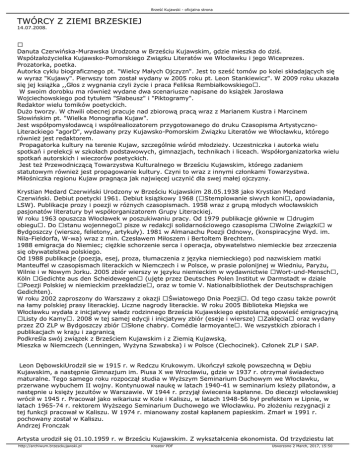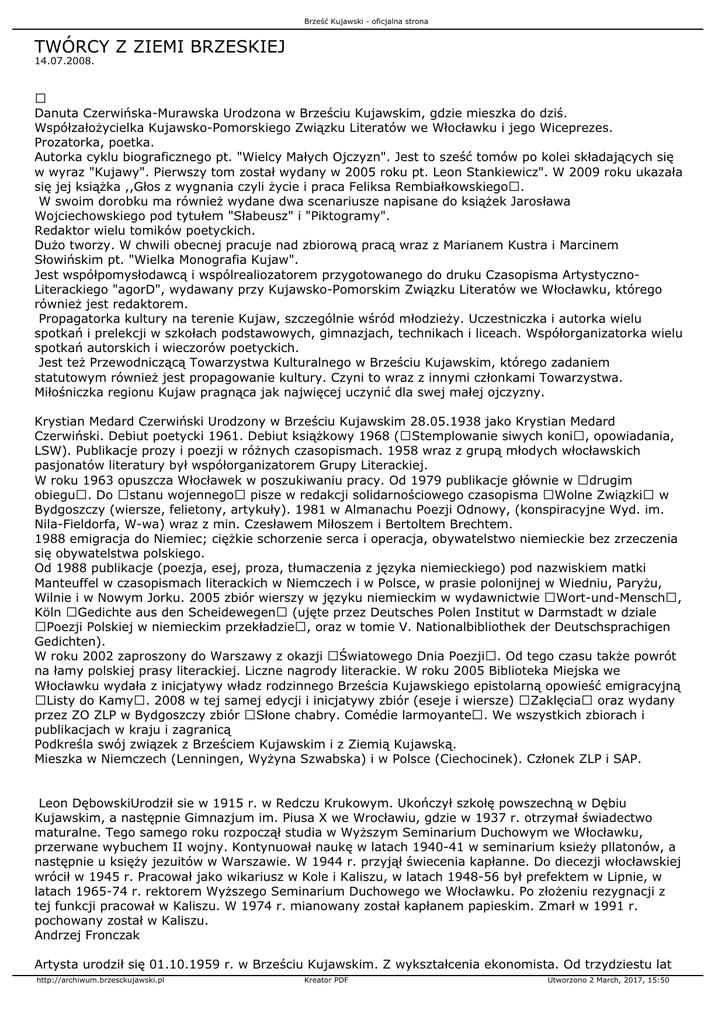 Brześć Kujawski - oficjalna strona TWÓRCY Z ZIEMI BRZESKIEJ 14.07.2008. Danuta Czerwińska-Murawska Urodzona w Brześciu Kujawskim, gdzie mieszka do dziś. Współzałożycielka Kujawsko-Pomorskiego Związku Literatów we Włocławku i jego Wiceprezes. Prozatorka, poetka. Autorka cyklu biograficznego pt. "Wielcy Małych Ojczyzn". Jest to sześć tomów po kolei składających się w wyraz "Kujawy". Pierwszy tom został wydany w 2005 roku pt. Leon Stankiewicz". W 2009 roku ukazała się jej książka ,,Głos z wygnania czyli życie i praca Feliksa Rembiałkowskiego. W swoim dorobku ma również wydane dwa scenariusze napisane do książek Jarosława Wojciechowskiego pod tytułem "Słabeusz" i "Piktogramy". Redaktor wielu tomików poetyckich. Dużo tworzy. W chwili obecnej pracuje nad zbiorową pracą wraz z Marianem Kustra i Marcinem Słowińskim pt. "Wielka Monografia Kujaw". Jest współpomysłodawcą i wspólrealiozatorem przygotowanego do druku Czasopisma ArtystycznoLiterackiego "agorD", wydawany przy Kujawsko-Pomorskim Związku Literatów we Włocławku, którego również jest redaktorem. Propagatorka kultury na terenie Kujaw, szczególnie wśród młodzieży. Uczestniczka i autorka wielu spotkań i prelekcji w szkołach podstawowych, gimnazjach, technikach i liceach. Współorganizatorka wielu spotkań autorskich i wieczorów poetyckich. Jest też Przewodniczącą Towarzystwa Kulturalnego w Brześciu Kujawskim, którego zadaniem statutowym również jest propagowanie kultury. Czyni to wraz z innymi członkami Towarzystwa. Miłośniczka regionu Kujaw pragnąca jak najwięcej uczynić dla swej małej ojczyzny. Krystian Medard Czerwiński Urodzony w Brześciu Kujawskim 28.05.1938 jako Krystian Medard Czerwiński. Debiut poetycki 1961. Debiut książkowy 1968 (Stemplowanie siwych koni, opowiadania, LSW). Publikacje prozy i poezji w różnych czasopismach. 1958 wraz z grupą młodych włocławskich pasjonatów literatury był współorganizatorem Grupy Literackiej. W roku 1963 opuszcza Włocławek w poszukiwaniu pracy. Od 1979 publikacje głównie w drugim obiegu. Do stanu wojennego pisze w redakcji solidarnościowego czasopisma Wolne Związki w Bydgoszczy (wiersze, felietony, artykuły). 1981 w Almanachu Poezji Odnowy, (konspiracyjne Wyd. im. Nila-Fieldorfa, W-wa) wraz z min. Czesławem Miłoszem i Bertoltem Brechtem. 1988 emigracja do Niemiec; ciężkie schorzenie serca i operacja, obywatelstwo niemieckie bez zrzeczenia się obywatelstwa polskiego. Od 1988 publikacje (poezja, esej, proza, tłumaczenia z języka niemieckiego) pod nazwiskiem matki Manteuffel w czasopismach literackich w Niemczech i w Polsce, w prasie polonijnej w Wiedniu, Paryżu, Wilnie i w Nowym Jorku. 2005 zbiór wierszy w języku niemieckim w wydawnictwie Wort-und-Mensch, Köln Gedichte aus den Scheidewegen (ujęte przez Deutsches Polen Institut w Darmstadt w dziale Poezji Polskiej w niemieckim przekładzie, oraz w tomie V. Nationalbibliothek der Deutschsprachigen Gedichten). W roku 2002 zaproszony do Warszawy z okazji Światowego Dnia Poezji. Od tego czasu także powrót na łamy polskiej prasy literackiej. Liczne nagrody literackie. W roku 2005 Biblioteka Miejska we Włocławku wydała z inicjatywy władz rodzinnego Brześcia Kujawskiego epistolarną opowieść emigracyjną Listy do Kamy. 2008 w tej samej edycji i inicjatywy zbiór (eseje i wiersze) Zaklęcia oraz wydany przez ZO ZLP w Bydgoszczy zbiór Słone chabry. Comédie larmoyante. We wszystkich zbiorach i publikacjach w kraju i zagranicą Podkreśla swój związek z Brześciem Kujawskim i z Ziemią Kujawską. Mieszka w Niemczech (Lenningen, Wyżyna Szwabska) i w Polsce (Ciechocinek). Członek ZLP i SAP. Leon DębowskiUrodził sie w 1915 r. w Redczu Krukowym. Ukończył szkołę powszechną w Dębiu Kujawskim, a następnie Gimnazjum im. Piusa X we Wrocławiu, gdzie w 1937 r. otrzymał świadectwo maturalne. Tego samego roku rozpoczął studia w Wyższym Seminarium Duchowym we Włocławku, przerwane wybuchem II wojny. Kontynuował naukę w latach 1940-41 w seminarium ksieży pllatonów, a następnie u księży jezuitów w Warszawie. W 1944 r. przyjął świecenia kapłanne. Do diecezji włocławskiej wrócił w 1945 r. Pracował jako wikariusz w Kole i Kaliszu, w latach 1948-56 był prefektem w Lipnie, w latach 1965-74 r. rektorem Wyższego Seminarium Duchowego we Włocławku. Po złożeniu rezygnacji z tej funkcji pracował w Kaliszu. W 1974 r. mianowany został kapłanem papieskim. Zmarł w 1991 r. pochowany został w Kaliszu. Andrzej Fronczak Artysta urodził się 01.10.1959 r. w Brześciu Kujawskim. Z wykształcenia ekonomista. Od trzydziestu lat http://archiwum.brzesckujawski.pl Kreator PDF Utworzono 2 March, 2017, 15:50 Brześć Kujawski - oficjalna strona uprawia malarstwo sztalugowe i rysunek. W 2004 r. został przyjęty do Związku Polskich Artystów Plastyków (Okręg Toruński). Ma na koncie 36 wystaw indywidualnych, między innymi w Warszawie, Toruniu, Koszalinie, Słupsku, Włocławku, Ciechocinku, Lubaniu Śląskim oraz zagranicznych w Chicago, Detroit i Paryżu. Brał udział w około 80. wystawach zbiorowych oraz 9. plenerach malarskich regionalnych i ogólnopolskich. W 2010 r. odznaczony Srebrnym Krzyżem Zasługi za działalność społeczno - artystyczną. Andrzej Fronczak prezentuje malarstwo sztalugowe oraz prace na papierze wykonane techniką własną. W rodzinnym mieście prezentował swoje prace w maju 2010 roku, a we wrześniu 2011 roku w Galerii Sztuk Plastycznych we Włocławku otwarto wystawę Jego prac p.n. ,,Zapisy C.D."Kazimierz Grodzicki Urodził się w 1884 r. w majątku Psarskie koło Śremu, gdzie uczęszczał do szkól. Usunięto go z gimnazjum za czytanie ,,Pana Tadeusza. Przeniósł sie do Lwowa, gdzie zdał maturę. Studiował rolnictwo na UJ w Krakowie, Lipsku i Berlinie. Po studiach rozpoczął gospodarowanie w majątku Sokołowo. Majątek ten był wzorowo prowadzony. W latach trzydziestych podczas wizytowania prze