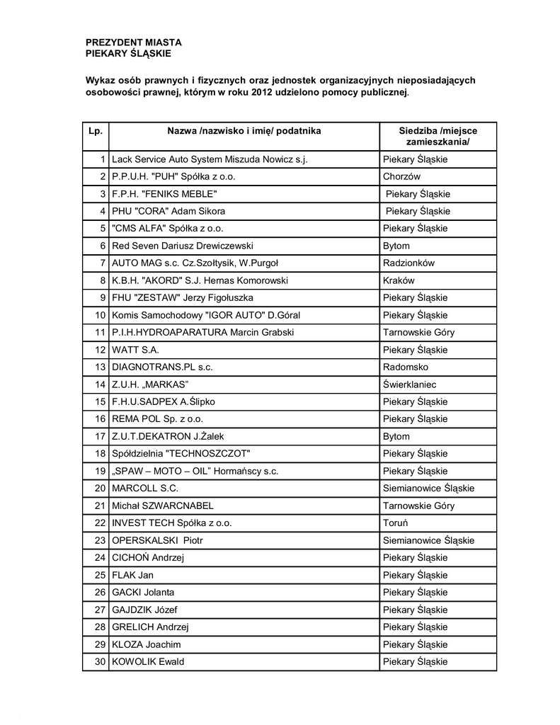 PREZYDENT MIASTA PIEKARY ŚLĄSKIE Wykaz osób prawnych i fizycznych oraz jednostek organizacyjnych nieposiadających osobowości prawnej, którym w roku 2012 udzielono pomocy publicznej. Lp. Nazwa /nazwisko i imię/ podatnika Siedziba /miejsce zamieszkania/ 1 Lack Service Auto System Miszuda Nowicz s.j. Piekary Śląskie 2 P.P.U.H. "PUH" Spółka z o.o. Chorzów 3 F.P.H. "FENIKS MEBLE" Piekary Śląskie 4 PHU "CORA" Adam Sikora Piekary Śląskie 5 "CMS ALFA" Spółka z o.o. Piekary Śląskie 6 Red Seven Dariusz Drewiczewski Bytom 7 AUTO MAG s.c. Cz.Szołtysik, W.Purgoł Radzionków 8 K.B.H. "AKORD" S.J. Hernas Komorowski Kraków 9 FHU "ZESTAW" Jerzy Figołuszka Piekary Śląskie 10 Komis Samochodowy "IGOR AUTO" D.Góral Piekary Śląskie 11 P.I.H.HYDROAPARATURA Marcin Grabski Tarnowskie Góry 12 WATT S.A. Piekary Śląskie 13 DIAGNOTRANS.PL s.c. Radomsko 14 Z.U.H. „MARKAS” Świerklaniec 15 F.H.U.SADPEX A.Ślipko Piekary Śląskie 16 REMA POL Sp. z o.o. Piekary Śląskie 17 Z.U.T.DEKATRON J.Żalek Bytom 18 Spółdzielnia "TECHNOSZCZOT" Piekary Śląskie 19 „SPAW – MOTO – OIL” Hormańscy s.c. Piekary Śląskie 20 MARCOLL S.C. Siemianowice Śląskie 21 Michał SZWARCNABEL Tarnowskie Góry 22 INVEST TECH Spółka z o.o. Toruń 23 OPERSKALSKI Piotr Siemianowice Śląskie 24 CICHOŃ Andrzej Piekary Śląskie 25 FLAK Jan Piekary Śląskie 26 GACKI Jolanta Piekary Śląskie 27 GAJDZIK Józef Piekary Śląskie 28 GRELICH Andrzej Piekary Śląskie 29 KLOZA Joachim Piekary Śląskie 30 KOWOLIK Ewald Piekary Śląskie 31 MACHA Jan Piekary Śląskie 32 MOJ Mirosław Piekary Śląskie 33 PODORA Karol Piekary Śląskie 34 STOMPEL Paweł Piekary Śląskie 35 WÓJCIK Lidia Piekary Śląskie 36 SZCZYRBA Regina Piekary Śląskie 37 WÓJCIK Piotr Piekary Śląskie 38 WÓJCIK Krzysztof Piekary Śląskie 39 CESARZ Maria Piekary Śląskie 40 MOJ Piotr Piekary Śląskie 41 LUBOSIK Grzegorz Piekary Śląskie 42 GRELICH Andrzej Siemianowice Śląskie 43 GRELICH Monika i Jan Siemianowice Śląskie 44 AGRO -SAD Spółka z o.o. Radzionków 45 WPRiR „Energopol – WSK” Koziegłowy 46 Spółdzielnia "TECHNOSZCZOT" Piekary Śląskie 47 Andrzej Bieniek P.P.H.U. "FEMINA - FASHION" 48 Agnieszka Kot, Piotr Kot, Józef Cieszyński Sklep Ogólnospożywczy s.c. "Tradycja" 49 Firma Handlowa Piekarnia - Ewa Januszek Chorzów Piekary Śląskie Piekary Śląskie 50 Firma Handlowa "U ANI" Świerklaniec 51 Firma Handlowo-Usługowa "Kaffka" s.c. Danuta Piękoś, Jerzy Piękoś Bytom 52 Firma Produkcyjno - Usługowo-Handlowa "Raffaello" Agnieszka Murawska Katowice 53 Szeja Krzysztof Blacharstwo Lakiernictwo Mechanika Piekary Śląskie 54 S.C. Beata Zdebel, Arkadiusz Zdebel Piekary Śląskie 55 MARKET-POL Tadeusz Zientecki Radzionków 56 DIESEL SERVIS - Adamczyk Piekary Śląskie 57 Piekarnia - Cukiernia "Konowoł" Piekary Śląskie 58 P.H.U. "Dingar" Sp. z o.o. Piekary Śląskie 59 T&M Skórka Auto Serwis Tomasz Skórka Piekary Śląskie 60 PEWBUD Zakład Remontowo -Budowlany Piotr Chochołek, Edward Nawratek Piekary Śląskie 61 Tura Krzysztof Auto Electronic Technologic Service Piekary Śląskie 62 PUH Wistur s.c. Adam Wisniewski, Ewa Gorzędowska Wiśniewska, Krzysztof Wiśniewski Piekary Śląskie 63 Spółdzielnia Mieszkaniowa w Piekarch Śląskich Piekary Śląskie 64 CIS Bogusław Piekary Śląskie 65 "AUTO - RENO" s.c. Stanisław Szwarc, Roman Szwarc Piekary Śląskie 66 PPHU "TUREX" Elżbieta Turek Bytom 67 Auto - Serwis Tomasz Piórkowski Wojkowice 68 P.H.U. Piotr Musioł Piekary Śląskie 69 Chłodnictwo -A.G.D. Józef Habura Piekary Śląskie 70 Galeria Upominków'TOFI" Ewa Malina Piekary Śląskie 71 "ANDBUT" Barbra Widera Piekary Śląskie 72 Ryszard Mazanek Firma Handlowa Radzionków 73 Zakład Fryzjerski "Mirka" Mirosława Boszko Piekary Śląskie 74 FHU "BROL - MAX" Karina Sulik-Brol Piekary Śląskie 75 Auto Serwis "Tekspol" Damian Wiertelorz Piekary Śląskie 76 Studio Fryzur Lusi Lucyna Lubos - Bartczak Piekary Śląskie 77 "Auto - Complex Szewczyk" Józef Szewczyk Piekary Śląskie 78 P.P.H.U. "Warmex" Jerzy Warmiński Piekary Śląskie 79 Cukiernia -Lodziarnia "Alaska" s.c. Piekary Śląskie 80 Szeja Krzysztof Blacharstwo Lakiernictwo Mechanika Piekary Śląskie 81 Zakład Mięsny "Hemax" H.M.Blachlińscy Spółka Jawna Bobrowniki 82 PHU "Kan - Jan" Jan Kandora Piekary Śląskie 83 Instytut Urody MMM Maria Mońka -Mikos Piekary Śląskie 84 Cukiernia "Spruś" s.c. Michał Trembaczowski, Danuta Spruś, Karolina Spruś Piekary Śląskie 85 Salon Fryzjerski "Anita" Anita Parada Piekary Śląskie 86 "Pasion" s.c Joanna Bieniek, Katarzyna Daniel, Joanna Górka Piekary Śląskie 87 Salon Fryzjersko - Kosmetyczny "Barbara - Anna" Barbara Wałęga - Duda Piekary Śląskie 88 Joachim Foltinek "Piekarnia - Ciastkarnia" Piekary Śląskie 89 Folrian Knapik "Auto-Geo-Test" Mechanika Pojazdowa i Wulkanizacja Piekary Śląskie 90 "Mimar" Sp. z o.o. Piekary Śląskie 91 GÓRECKI Jacek Piekary Śląskie 92 Zakład Produkcji i Transportu "EKO-BET" Żaneta Bromis, Piekary Śląskie 93 CIASNOCHA Dorota i Lesław Radzionków 94 Zasada ZUP Sp. z o.o. Piekary Śląskie 95 Servis Area Sp. z o.o. Piekary Śląskie 96 Zakład Przetwórstwa Tworzyw Sztucznych "IMPLAST" Lucjan Piekary Śląskie Zając 97 FHU „JAMBI” Dominika Jastrzębska Piekary Śląskie WYKAZ POMOCY PUBLICZNEJ UDZIELONEJ OSOBOM PRAWNYM I FIZYCZNYM PRZEZ POWIATOWY URZĄD PRACY W ROKU 2012 Lp. Nazwa /nazwisko i imię/ podatnika Siedziba /miejsce zamieszkania/ 1 „EMTO-TECH” Mateusz Macioł Piekary Śląskie 2 PHU „MARPOL”Marcin Mikołajczyk Piekary Śląskie 3 PIEKARNIA-CUKIERNIA KONOWOŁ Piekary Śląskie 4 Usługi Garmażeryjno-Gastronomiczne BAR SŁONECZKO Halina Sitek Piekary Śląskie 5 WOCARO Wojciech Zając Piekary Śląskie 6 T&M SKÓRKA AUTO SERWIS Tomasz Skórka Piekary Śląskie 7 F.H.U. ZOFIA SZEFER Piekary Śląskie 8 S.C Beata Zdebel Arkadiusz Zdebel Piekary Śląskie 9 F.H.U. „STRACH” Krzysztof Strach Piekary Śląskie 10 CENT