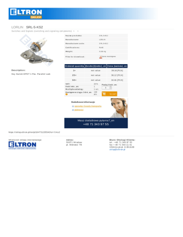 LORLINSRL-5-KS2 Swi tchesandSi gnal s(swi tchi ngandsi gnal i ngcom ponents) > > N a z wa p ro d u ktu : S RL-5-KS 2 M a n u fa c tu rer: LORLI N M a n u fa c tu rerc o d e: S RL-5-KS 2 C erti fi c a ti o n s : RoHS Wei g h t: 0.036 kg Ka rta ka ta logowa F i l es fo rd o wn l o a d : O rderedqua ntity [brutto ] /[netto ] _en Cena [wa luta ] _en Des criptio n: KeySwi tchDPDT1Pos.Par al l el Lock 1+ netval ue 39.16[PLN] 25+ netval ue 36.12[PLN] 50+ netval ue 34.61[PLN] VAT: Ilośćmin._en: M u ltipleord ering : 23% 1 1sz t. Dostępnewciąg u 3d ni_en: 100 pcs. Pod ajIlość_en: + 1 - tocart Maszdodatkowepytania?_en +48713439755 https://skl ep.el tr on.pl /en/p/18 47 51235543/sr l -5-ks2 Wł aści ci el skl epui nter netowego: Adres : 50-07 1Wr ocł aw pl .Wol ności 7 B Biuro O bs ługiKlienta : tel .:+48 7 134397 55 fax+48 7 13441141 Infol i ni apn-pt.8 .00-16.00 skl ep@ el tr on.pl