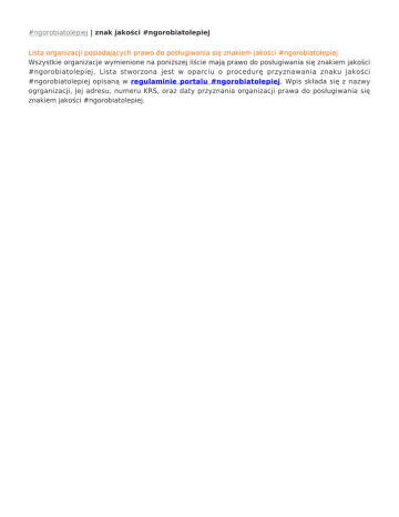 #ngorobiatolepiej | znak jakości #ngorobiatolepiej Lista organizacji posiadających prawo do posługiwania się znakiem jakości #ngorobiatolepiej Wszystkie organizacje wymienione na poniższej liście mają prawo do posługiwania się znakiem jakości #ngorobiatolepiej. Lista stworzona jest w oparciu o procedurę przyznawania znaku jakości #ngorobiatolepiej opisaną w regulaminie portalu #ngorobiatolepiej. Wpis składa się z nazwy ogrganizacji, jej adresu, numeru KRS, oraz daty przyznania organizacji prawa do posługiwania się znakiem jakości #ngorobiatolepiej.