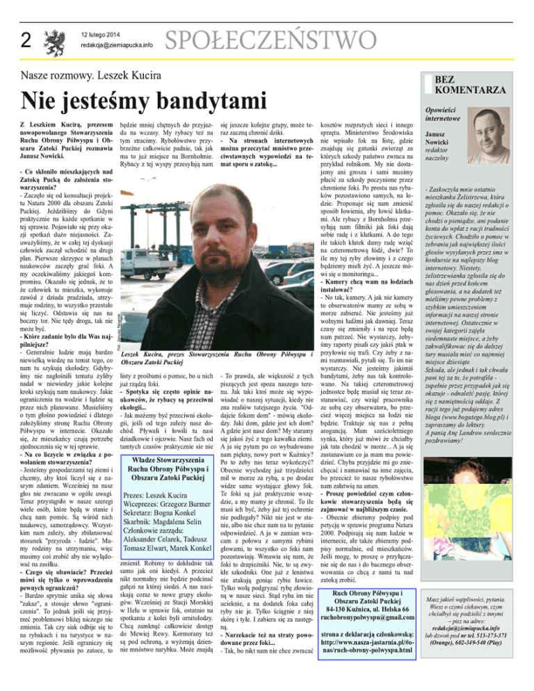 2 1 2 lutego 201 4 [email protected] SPOŁECZEŃSTWO Nasze rozmowy. Leszek Kucira Nie jesteśmy bandytami - Co skłoniło mieszkających nad Zatoką Pucką do założenia stowarzyszenia? - Zaczęło się od konsultacji projektu Natura 2000 dla obszaru Zatoki Puckiej. Jeździliśmy do Gdyni praktycznie na każde spotkanie w tej sprawie. Pojawiało się przy okazji spotkań dużo niejasności. Zauważyliśmy, że w całej tej dyskusji człowiek zaczął schodzić na drugi plan. Pierwsze skrzypce w planach naukowców zaczęły grać foki. A my oczekiwaliśmy jakiegoś kompromisu. Okazało się jednak, że to że człowiek tu mieszka, wykonuje zawód z dziada pradziada, utrzymuje rodziny, to wszystko przestało się liczyć. Odstawia się nas na boczny tor. Nie tędy droga, tak nie może być. - Które zadanie było dla Was najpilniejsze? - Generalnie ludzie mają bardzo niewielką wiedzę na temat tego, co nam tu szykują ekolodzy. Gdybyśmy nie nagłośnili tematu żyliby nadal w niewiedzy jakie kolejne kroki szykują nam naukowcy. Jakie ograniczenia na wodzie i lądzie są przez nich planowane. Musieliśmy o tym głośno powiedzieć i dlatego założyliśmy stronę Ruchu Obrony Półwyspu w internecie. Okazało się, że mieszkańcy czują potrzebę zjednoczenia się w tej sprawie. - Na co liczycie w związku z powołaniem stowarzyszenia? - Jesteśmy gospodarzami tej ziemi i chcemy, aby ktoś liczył się z naszym zdaniem. Wcześniej na nasz głos nie zwracano w ogóle uwagi. Teraz przystąpiło w nasze szeregi wiele osób, które będą w stanie i chcą nam pomóc. Są wśród nich naukowcy, samorządowcy. Wszystkim nam zależy, aby zbilansować stosunek "przyroda - ludzie". Mamy rodziny na utrzymaniu, więc musimy coś zrobić aby nie wylądować na zasiłku. - Czego się obawiacie? Przecież mówi się tylko o wprowadzeniu pewnych ograniczeń? - Bardzo sprytnie unika się słowa "zakaz", a stosuje słowo "ograniczenia". To jednak jeśli się przyjrzeć problemowi bliżej niczego nie zmienia. Tak czy siak odbije się to na rybakach i na turystyce w naszym regionie. Jeśli ograniczy się możliwość pływania po zatoce, to będzie mniej chętnych do przyjazdu na wczasy. My rybacy też na tym stracimy. Rybołówstwo przybrzeżne całkowicie padnie, tak jak ma to już miejsce na Bornholmie. Rybacy z tej wyspy przesyłają nam Fot. Janusz Nowicki Z Leszkiem Kucirą, prezesem nowopowołanego Stowarzyszenia Ruchu Obrony Półwyspu i Obszaru Zatoki Puckiej rozmawia Janusz Nowicki. się jeszcze kolejne grupy, może teraz zaczną chronić dziki. - Na stronach internetowych można przeczytać mnóstwo przeciwstawnych wypowiedzi na temat sporu o zatokę... BEZ KOMENTARZA kosztów rozprutych sieci i innego sprzętu. Ministerstwo Środowiska nie wpisało fok na listę, gdzie znajdują się gatunki zwierząt za których szkody państwo zwraca na przykład rolnikom. My nie dostajemy ani grosza i sami musimy płacić za szkody poczynione przez chronione foki. Po prostu nas rybaków pozostawiono samych, na lodzie. Proponuje się nam zmienić sposób łowienia, aby łowić klatkami. Ale rybacy z Bornholmu przesyłają nam filmiki jak foki dają sobie radę i z klatkami. A do tego ile takich klatek damy radę wziąć na czterometrową łódź, dwie? To ile my tej ryby złowimy i z czego będziemy mieli żyć. A jeszcze mówi się o monitoringu... - Kamery chcą wam na łodziach instalować? - No tak, kamery. A jak nie kamery to obserwatorów mamy ze sobą w morze zabierać. Nie jesteśmy już wolnymi ludźmi jak dawniej. Teraz czasy się zmieniły i na ręce będą nam patrzeć. Nie wystarczy, żebyśmy raporty pisali czy jakiś ptak w przyłowie się trafi. Czy żeby z nami rozmawiali, pytali się. To im nie wystarczy. Nie jesteśmy jakimiś bandytami, żeby nas tak kontrolowano. Na takiej czterometrowej jednostce będę musiał się teraz zastanawiać, czy wziąć pracownika ze sobą czy obserwatora, bo przecież więcej miejsca na łodzi nie będzie. Traktuje się nas z pełną arogancją. Mam sześcioletniego synka, który już mówi że chciałby jak tata chodzić w morze... A ja się zastanawiam co ja mam mu powiedzieć. Chyba przyjdzie mi go zniechęcać i namawiać na inne zajęcia, bo przecież to nasze rybołówstwo nam załatwią na amen. - Proszę powiedzieć czym członkowie stowarzyszenia będą się zajmować w najbliższym czasie. - Obecnie zbieramy podpisy pod petycją w sprawie programu Natura 2000. Podpisują się nam ludzie w internecie, ale także zbieramy podpisy normalnie, od mieszkańców. Jeśli mogę, to proszę o przyłączanie się do nas i do bacznego obserwowania co chcą z nami tu nad zatoką zrobić. Ruch Obrony Półwyspu i Obszaru Zatoki Puckiej 84-130 Kuźnica, ul. Helska 66 [email protected] Leszek Kucira, prezes Stowarzyszenia Ruchu Obrony Półwyspu i Obszaru Zatoki Puckiej listy z prośbami o pomoc, bo u nich - To prawda, ale większość z tych piszących jest spoza naszego terejuż rządzą foki. - Spotyka się często opinie na- nu. Jak taki ktoś może się wypoukowców, że rybacy są przeciwni wiadać o naszej sytuacji, kiedy nie zna realiów tutejszego życia. "Odekologii... - Jak możemy być przeciwni ekolo- dajcie fokom dom" - mówią ekologii, jeśli od tego zależy nasz do- dzy. Jaki dom, gdzie jest ich dom? chód. Pływali i łowili tu nasi A gdzie jest nasz dom? My staramy dziadkowie i ojcowie. Nasz fach od się jakoś żyć z tego kawałka ziemi. tamtych czasów praktycznie sie nie A ja się pytam po co wybudowano nam piękny, nowy port w Kuźnicy? Władze Stowarzyszenia Po to żeby nas teraz wykończyć? Ruchu Obrony Półwyspu i Obecnie wychodzę już trzydzieści Obszaru Zatoki Puckiej mil w morze za rybą, a po drodze widze same wystające głowy fok. Te foki są już praktycznie wszęPrezes: Leszek Kucira a my mamy je chronić. To ile Wiceprezes: Grzegorz Burmer dzie, musi ich być, żeby już tej ochronie Sekretarz: Bogna Konkel nie podlegały? 