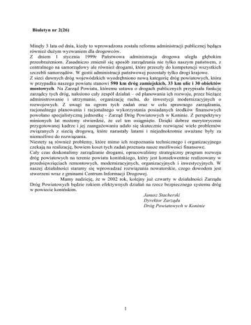 Biuletyn nr 2(26) Minęły 3 lata od dnia, kiedy to wprowadzona została reforma administracji publicznej będąca również dużym wyzwaniem dla drogowców. Z dniem 1 stycznia 1999r Państwowa administracja drogowa uległa głębokim przeobrażeniom. Zasadniczo zmienił się sposób zarządzania nie tylko naszym państwem, z centralnego na samorządowy ale również drogami, które przeszły do kompetencji wszystkich szczebli samorządów. W gestii administracji państwowej pozostały tylko drogi krajowe. Z sieci dawnych dróg wojewódzkich wyodrębniono nową kategorię dróg powiatowych, która w przypadku naszego powiatu stanowi 590 km dróg zamiejskich, 33 km ulic i 30 obiektów mostowych. Na Zarząd Powiatu, któremu ustawa o drogach publicznych przypisała funkcję zarządcy tych dróg, nałożono cały zespół działań – od planowania ich rozwoju, przez bieżące administrowanie i utrzymanie, organizację ruchu, do inwestycji modernizacyjnych o rozwojowych. Z uwagi na ogrom tych zadań oraz w celu sprawnego zarządzania, racjonalnego planowania i racjonalnego wykorzystania posiadanych środków finansowych powołano specjalistyczną jednostkę - Zarząd Dróg Powiatowych w Koninie. Z perspektywy minionych lat możemy stwierdzić, że cel ten osiągnięto. Dzięki dobrze merytorycznie przygotowanej kadrze i jej zaangażowaniu udało się skutecznie rozwiązać wiele problemów związanych z siecią drogową, które narastały latami i niejednokrotnie uważane były za niemożliwe do rozwiązania. Niestety są również problemy, które mimo ich rozpoznania technicznego i organizacyjnego czekają na realizację, bowiem koszt tych zadań przerasta nasze możliwości finansowe. Cały czas doskonalimy zarządzanie drogami, opracowaliśmy strategiczny program rozwoju dróg powiatowych na terenie powiatu konińskiego, który jest konsekwentnie realizowany w przedsięwzięciach remontowych, modernizacyjnych, organizacyjnych i inwestycyjnych. W naszej działalności staramy się wprowadzać rozwiązania nowatorskie, czego dowodem jest stworzeni wraz z gminami Centrum Informacji Drogowej. Mamy nadzieję, że w 2002 rok, kolejny już czwarty w działalności Zarządu Dróg Powiatowych będzie rokiem efektywnych działań na rzecz bezpiecznego systemu dróg w powiecie konińskim. Janusz Stacherski Dyrektor Zarządu Dróg Powiatowych w Koninie 1 1.Z prac Rady Powiatu 27 lutego br. odbyła się XXXVI sesja Rady Powiatu Konińskiego. Uczestniczyło w niej 42 radnych. Po przyjęciu informacji z prac Zarządu Powiatu i realizacji uchwał Rady Powiatu Konińskiego w okresie międzysesyjnym przystąpiono do omawiania głównych tematów obrad. Rada przyjęła informacje i sprawozdania: o stanie bezpieczeństwa i porządku publicznego w rejonie działania Komendy Miejskiej Policji w Koninie za 2001 rok; z realizacji zadań Komendy Miejskiej Państwowej Straży Pożarnej w Koninie w roku 2001; z realizacji zadań Powiatowej Stacji Sanitarno-Epidemiologicznej w Koninie w roku 2001 oraz stanu bezpieczeństwa sanitarnego nadzorowanego terenu; o działalności Powiatowego Inspektoratu Weterynarii dla Miasta Konina i Powiatu Konińskiego w 2001 r.; o realizacji zadań w 2001 roku Powiatowego Inspektoratu Nadzoru Budowlanego w Koninie; o projekcie harmonogramu robót na drogach powiatowych w 2002 roku; Na XXXVI sesji zostały podjęte uchwały w następujących sprawach: utworzenia szkół ponagimnazjalnych; porozumienia z gminą Kramsk; zasad udzielania stypendiów dla uczniów i studentów z terenu powiatu konińskiego; utworzenia w Specjalnym Ośrodku Szkolno-Wychowawczym w Rychwale zasadniczej szkoły zawodowej specjalnej; zmieniającej uchwałę w sprawie regulaminu wynagradzania nauczycieli oraz regulaminu przyznawania nauczycielskiego dodatku mieszkaniowego; zaciągnięcia i zabezpieczenia kredytu długoterminowego w wysokości 800.000 zł; ustanowienia tytułu honorowego „Zasłużony dla powiatu konińskiego” Ponadto Rada przyjęła: sprawozdanie Komisji Rewizyjnej z przeprowadzonych kontroli w 2001 roku; sprawozdanie z działalności Rady Powiatu Konińskiego i Komisji Rady Powiatu Konińskiego za 2001 rok; plany pracy Rady Powiatu Konińskiego oraz Komisji. Krystyna Grabowska Kierownik Biura Rady 2 2.Z prac Komisji Rady Powiatu 4 lutego odbyło się posiedzenie Komisji ds. Rodziny. Celem spotkania było przyjęcie sprawozdania z działalności Komisji oraz opracowanie planu pracy Komisji na I półrocze 2002 r. 12 lutego obradowała Komisja Rolnictwa, Leśnictwa i Gospodarki Wodnej. Komisja przyjęła „Sprawozdanie Powiatowego Lekarza Weterynarii dla Miasta Konina i Powiatu Konińskiego z zakresu realizacji zadań za 2001 rok”. Ponadto Komisja zapoznała się z informacją o gospodarowaniu Funduszem Ochrony Gruntów Rolnych oraz o działaniach Zarządu Powiatu w sprawie zmiany podziału środków z tego funduszu. Komisja przyjęła również sprawozdanie ze swojej działalności w 2001 roku i opracowała plan pracy na I półrocze 2002 roku. 14 lutego obradowała Komisja Kultury, Sportu i Turystyki, która przyjęła sprawozdanie z działalności w roku 2001 oraz opracowała plan pracy na I półrocze 2002 rok. We czwartek (14 lutego) odbyło się również posiedzenie Komisji Geodezji i Zagospodarowania Przestrzennego, na którym przedstawiona została informacja Powiatowego Inspektoratu Nadzoru Budowlanego w Koninie o realizacji zadań w 2001 roku. Ponadto Komisja rozpatrzyła informację o gospodarowaniu Funduszem Ochrony Gruntów Rolnych ustalając, aby temat ten podjąć podczas obrad Rady Powiatu Konińskiego. Komisja przyjęła także sprawozdanie z działalności w ubiegłym roku i opracowała plan pracy na I półrocze 2002 roku. Komisja Budżetowo-Finansowa na posiedzeniu w dniu 15 lutego wyraziła pozytywną opinię dotyczącą projektu uchwały Rady Powiatu Konińskiego w sprawie zaciągnięcia i zabezpieczenia kredytu długoterminowego w wysokości 800.000 zł. ponadto ko