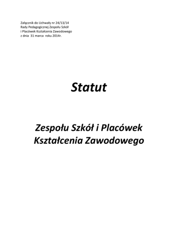 Załącznik do Uchwały nr 24/13/14 Rady Pedagogicznej Zespołu Szkół i Placówek Kształcenia Zawodowego z dnia 31 marca roku 2014r. Statut Zespołu Szkół i Placówek Kształcenia Zawodowego Statut Zespołu Szkół i Placówek Kształcenia Zawodowego I. POSTANOWIENIA OGÓLNE Rozdział 1 Przepisy definiujące §1 Ilekroć w dalszych przepisach jest mowa bez bliższego określenia o: 1. 2. 3. 4. 5. 6. 7. 8. Zespole - należy przez to rozumieć Zespół Szkół i Placówek Kształcenia Zawodowego, Ustawie - należy przez to rozumieć Ustawę z dnia 7 września 1991 r. o systemie oświaty, Statucie - należy przez to rozumieć Statut Zespołu, Dyrektorze, Radzie Pedagogicznej, organach Samorządu Uczniowskiego, należy przez to rozumieć organy działające w Zespole, Uczniach i Rodzicach - należy przez to rozumieć uczniów Zespołu oraz ich Rodziców lub prawnych opiekunów, Wychowawcy - należy przez to rozumieć nauczyciela, którego szczególnej opiece wychowawczej powierzono jeden z oddziałów w Zespole, organie prowadzącym Zespół - należy przez to rozumieć Miasto Zielona Góra, organie sprawującym nadzór pedagogiczny nad Zespołem - należy przez to rozumieć Lubuskiego Kuratora Oświaty, Rozdział 2 Nazwa Zespołu i inne informacje o Zespole. §2 1. Zespół Szkół i Placówek Kształcenia Zawodowego w Zielonej Górze jest zespołem szkół i placówek publicznych. 2. W skład Zespołu wchodzą: 1) Zasadnicza Szkoła Zawodowa nr 1, 2) Technikum nr 5, 3) Szkoła Policealna nr 6, 1 4) Ośrodek Dokształcania i Doskonalenia Zawodowego im. Ludwika Kasprzaka 5) Internat. 3. Siedzibą Zespołu jest Zielona Góra, Zespół użytkuje obiekty przy ul. Botanicznej: A nr 74, B nr 76, C nr 72 ,D nr 66, E nr 58, F nr 54,G nr 52. §3 1. Ustalona nazwa (Zespół Szkół i Placówek Kształcenia Zawodowego w Zielonej Górze) używana jest przez Zespół zasadniczo w pełnym brzmieniu. 2. Na pieczęciach i stemplach może być używany czytelny skrót nazwy (ZSiPKZ). §4 Zespół posiada własny sztandar. Opis sztandaru określa załącznik nr 1 do Statutu. §5 1. Czas trwania cyklu kształcenia w Zespole wynosi odpowiednio w szkołach: 1) w Zasadniczej Szkole Zawodowej nr 1 - trzy lata , 2) w Technikum nr 5 – cztery lata, 3) w Szkole Policealnej nr 6 – dwa lata, 4) w Ośrodku Dokształcania i Doskonalenia Zawodowego – 4 tygodniowe turnusy dokształcania teoretycznego młodocianych pracowników, kwalifikacyjne kursy zawodowe. 2. Zespół kształci w zakresie: 1) Zasadniczej Szkoły Zawodowej nr 1: − W trzyletnim cyklu kształcenia w zawodach: blacharz, betoniarz – zbrojarz, fotograf, kominiarz, koszykarz – plecionkarz, kowal, kucharz, lakiernik, mechanik maszyn i urządzeń drogowych, modelarz odlewniczy, monter budownictwa wodnego, monter kadłubów okrętowych, monter nawierzchni kolejowych, monter systemów rurociągowych, operator maszyn leśnych, operator urządzeń przemysłu ceramicznego, operator urządzeń przemysłu chemicznego, posadzkarz, pszczelarz, rybak śródlądowy, sprzedawca, pracownik pomocniczy obsługi hotelowej, blacharz samochodowy, cieśla, cukiernik, dekarz, drukarz, elektromechanik, elektromechanik pojazdów samochodowych, elektryk, fryzjer, introligator, garbarz skór, górnik eksploatacji otworowej, górnik eksploatacji podziemnej, górnik odkrywkowej eksploatacji złóż, kaletnik, kamieniarz, kowal, krawiec, kuśnierz, mechanik automatyki przemysłowej i urządzeń precyzyjnych, mechanik – monter maszyn i urządzeń, mechanik precyzyjny, mechanik – operator pojazdów i maszyn rolniczych, mechanik pojazdów samochodowych, monter - elektronik, monter instalacji gazowych, monter sieci, instalacji i urządzeń sanitarnych, monter – instalator 2 urządzeń technicznych w budownictwie wiejskim, monter mechatronik, monter sieci i urządzeń telekomunikacyjnych, monter instrumentów muzycznych, monter izolacji budowlanych, monter konstrukcji budowlanych, monter zabudowy i robót wykończeniowych w budownictwie, murarz-tynkarz, obuwnik, ogrodnik, optyk – mechanik, operator maszyn i urządzeń do obróbki plastycznej, operator maszyn i urządzeń metalurgicznych, operator maszyn i urządzeń odlewniczych, operator maszyn i urządzeń do przetwórstwa tworzyw sztucznych, operator maszyn i urządzeń przemysłu spożywczego, operator maszyn w przemyśle włókienniczym, operator urządzeń przemysłu szklarskiego, operator obrabiarek skrawających, piekarz, rolnik, wędliniarz, stolarz, ślusarz, tapicer, zdun, złotnik – jubiler, zegarmistrz, rękodzielnik wyrobów włókienniczych. 2) Technikum nr 5 w zawodach: kucharz, kelner, technik usług fryzjerskich, technik organizacji usług gastronomicznych, technik cyfrowych procesów graficznych, technik żywienia i usług gastronomicznych, fototechnik, 3) Szkoły Policealnej nr 6 w zawodach: technik usług kosmetycznych, 4) Ośrodka Dokształcania i Doskonalenia Zawodowego - turnusy dokształcania teoretycznego młodocianych pracowników, kwalifikacyjne kursy zawodowe. 3. Zespół zapewnia możliwość korzystania z: 1) biblioteki, 2) stołówki, 3) gabinetu pielęgniarki szkolnej, 4) internatu, 5) siłowni, 6) pracowni komputerowej. §6 Na zasadach określonych w ustawie Dyrektor może zezwolić Uczniowi na indywidualny program lub tok nauki. §7 1. Zespół współpracuje z: 1) Cechem Rzemiosł Różnych i Przedsiębiorczości, 2) Izbą Rzemieślnicza i Przedsiębiorczości, 3) Stowarzyszeniem Przyjaciół Wojewódzkiego Ośrodka Dokształcania Zawodowego, 4) Polskim Towarzystwem Walki z Kalectwem Oddział Terenowy w Zielonej Górze. 2. Zasady funkcjonowania w Zespole związków zawodowych regulują odrębne przepisy. §8 1. Zespół jest jednostką budżetową. 2. Szczegółowe zasady gospodarki finansowej Zespołu regulują odrębne przepisy. 3 3. Zespół może pozyskiwać dodatkowe środki na finansowanie niektórych form działalności statutowej z dotacji, z dobrowolnych wpłat Rodziców uc