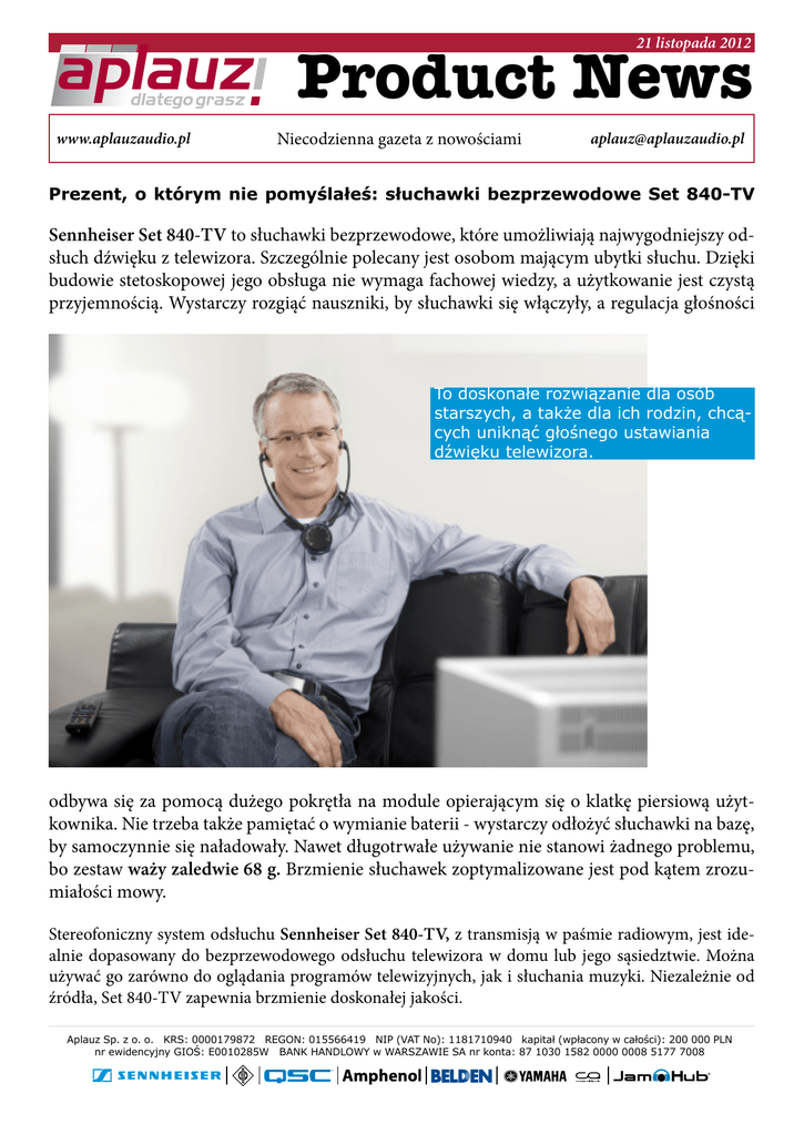 Product News 21 listopada 2012 www.aplauzaudio.pl Niecodzienna gazeta z nowościami [email protected] Prezent, o którym nie pomyślałeś: słuchawki bezprzewodowe Set 840-TV Sennheiser Set 840-TV to słuchawki bezprzewodowe, które umożliwiają najwygodniejszy odsłuch dźwięku z telewizora. Szczególnie polecany jest osobom mającym ubytki słuchu. Dzięki budowie stetoskopowej jego obsługa nie wymaga fachowej wiedzy, a użytkowanie jest czystą przyjemnością. Wystarczy rozgiąć nauszniki, by słuchawki się włączyły, a regulacja głośności To doskonałe rozwiązanie dla osób starszych, a także dla ich rodzin, chcących uniknąć głośnego ustawiania dźwięku telewizora. odbywa się za pomocą dużego pokrętła na module opierającym się o klatkę piersiową użytkownika. Nie trzeba także pamiętać o wymianie baterii - wystarczy odłożyć słuchawki na bazę, by samoczynnie się naładowały. Nawet długotrwałe używanie nie stanowi żadnego problemu, bo zestaw waży zaledwie 68 g. Brzmienie słuchawek zoptymalizowane jest pod kątem zrozumiałości mowy. Stereofoniczny system odsłuchu Sennheiser Set 840-TV, z transmisją w paśmie radiowym, jest idealnie dopasowany do bezprzewodowego odsłuchu telewizora w domu lub jego sąsiedztwie. Można używać go zarówno do oglądania programów telewizyjnych, jak i słuchania muzyki. Niezależnie od źródła, Set 840-TV zapewnia brzmienie doskonałej jakości. Aplauz Sp. z o. o. KRS: 0000179872 REGON: 015566419 NIP (VAT No): 1181710940 kapitał (wpłacony w całości): 200 000 PLN nr ewidencyjny GIOŚ: E0010285W BANK HANDLOWY w WARSZAWIE SA nr konta: 87 1030 1582 0000 0008 5177 7008 ® Product News www.aplauzaudio.pl Niecodzienna gazeta z nowościami [email protected] Wystarczy rozgięcie nauszników, aby urządzenie pracowało zgodnie z ustawieniami. Maksymalny poziom ciśnienia akustycznego w okolicach 125 dB gwarantuje, że dźwięk nigdy nie będzie zbyt cichy. Bardzo lekki odbiornik jest wyjątkowo komfortowy w noszeniu, dzięki zastosowaniu elastycznych wkładek dousznych. Ergonomiczne rozmieszczenie kontrolerów oraz wizualne komunikaty informujące o wykonywaniu poszczególnych czynności sprawiają, że obsługa zestawu jest niezwykle prosta. Może być on podłączony bezpośrednio do telewizora, systemu hi-fi czy radia. •Łatwy w skonfigurowaniu i działaniu. •Bezprzewodowa mobilność w promieniu do 100 metrów. •Transmisja sygnału nawet przez ściany. •Trzy przełączalne ustawienia charakterystyki odsłuchu dostępne w nadajniku. •Wzmocnienie górnego pasma może być indywidualnie regulowane. •Duży, ergonomicznie ukształtowany kontroler głośności na odbiorniku. •Regulacja balansu umieszczona na odbiorniku umożliwia niezależne ustawienie głośności dla prawego i lewego ucha. •Odbiornik automatycznie włącza się, gdy jest zakładany oraz wyłącza po zdjęciu. •Automatyczne wyszukiwanie wolnego kanału transmisji. Informacje o Sennheiser: Sennheiser Group, z siedzibą główną w miejscowości Wedemark koło Hanoweru w Niemczech, jest wiodącym na świecie producentem mikrofonów, słuchawek i systemów transmisji bezprzewodowej. Ta rodzinna firma, utworzona w 1945 roku, odnotowała sprzedaż rzędu 531 milionów Euro w 2011 roku. Sennheiser zatrudnia ponad 2100 ludzi na całym świecie i posiada zakłady produkcyjne w Niemczech, Irlandii i USA. Firma jest reprezentowana na całym świecie przez działy własne oraz przez partnerów handlowych. Oficjalnym przedstawicielem w Polsce jest firma Aplauz Sp. z o. o. Aplauz Sp. z o. o. KRS: 0000179872 REGON: 015566419 NIP (VAT No): 1181710940 kapitał (wpłacony w całości): 200 000 PLN nr ewidencyjny GIOŚ: E0010285W BANK HANDLOWY w WARSZAWIE SA nr konta: 87 1030 1582 0000 0008 5177 7008 ® Firmy Aplauz oraz Sennheiser odostępniają niniejsze zdjęcia wyłącznie do ublikacji prasowych. Jakiekolwiek inne użycie jest naruszeniem prawa. Przekazanie zdjęć osobom trzecim jest możliwe jedynie za zgodą firm Aplauz i Sennheiser.