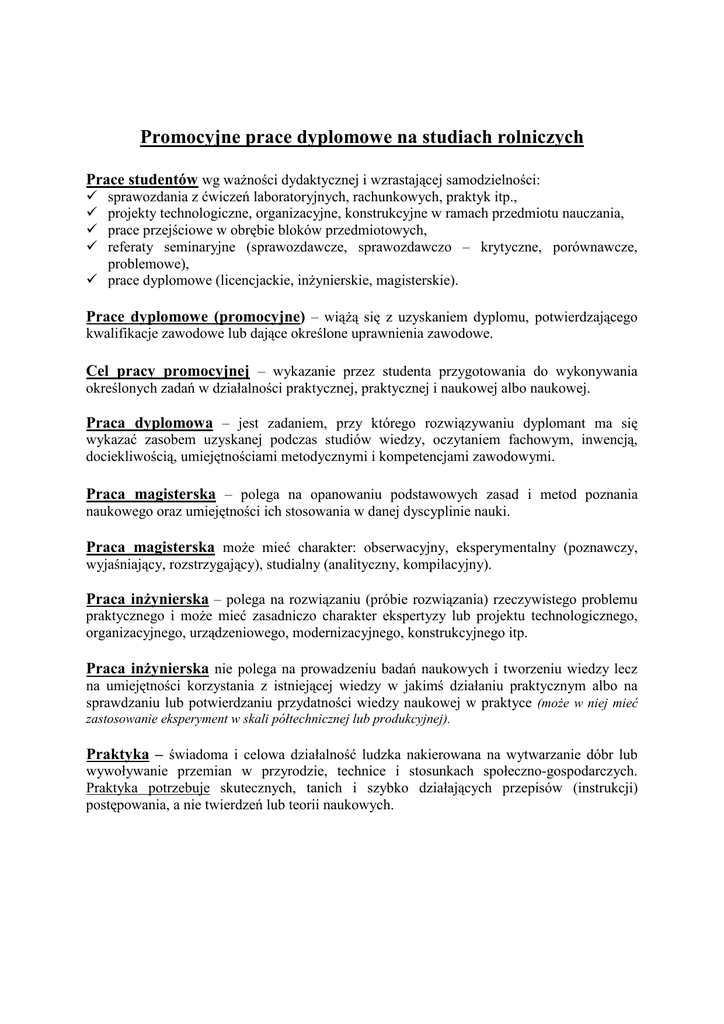 Promocyjne prace dyplomowe na studiach rolniczych Prace studentów wg ważności dydaktycznej i wzrastającej samodzielności: sprawozdania z ćwiczeń laboratoryjnych, rachunkowych, praktyk itp., projekty technologiczne, organizacyjne, konstrukcyjne w ramach przedmiotu nauczania, prace przejściowe w obrębie bloków przedmiotowych, referaty seminaryjne (sprawozdawcze, sprawozdawczo – krytyczne, porównawcze, problemowe), prace dyplomowe (licencjackie, inżynierskie, magisterskie). Prace dyplomowe (promocyjne) – wiążą się z uzyskaniem dyplomu, potwierdzającego kwalifikacje zawodowe lub dające określone uprawnienia zawodowe. Cel pracy promocyjnej – wykazanie przez studenta przygotowania do wykonywania określonych zadań w działalności praktycznej, praktycznej i naukowej albo naukowej. Praca dyplomowa – jest zadaniem, przy którego rozwiązywaniu dyplomant ma się wykazać zasobem uzyskanej podczas studiów wiedzy, oczytaniem fachowym, inwencją, dociekliwością, umiejętnościami metodycznymi i kompetencjami zawodowymi. Praca magisterska – polega na opanowaniu podstawowych zasad i metod poznania naukowego oraz umiejętności ich stosowania w danej dyscyplinie nauki. Praca magisterska może mieć charakter: obserwacyjny, eksperymentalny (poznawczy, wyjaśniający, rozstrzygający), studialny (analityczny, kompilacyjny). Praca inżynierska – polega na rozwiązaniu (próbie rozwiązania) rzeczywistego problemu praktycznego i może mieć zasadniczo charakter ekspertyzy lub projektu technologicznego, organizacyjnego, urządzeniowego, modernizacyjnego, konstrukcyjnego itp. Praca inżynierska nie polega na prowadzeniu badań naukowych i tworzeniu wiedzy lecz na umiejętności korzystania z istniejącej wiedzy w jakimś działaniu praktycznym albo na sprawdzaniu lub potwierdzaniu przydatności wiedzy naukowej w praktyce (może w niej mieć zastosowanie eksperyment w skali półtechnicznej lub produkcyjnej). Praktyka – świadoma i celowa działalność ludzka nakierowana na wytwarzanie dóbr lub wywoływanie przemian w przyrodzie, technice i stosunkach społeczno-gospodarczych. Praktyka potrzebuje skutecznych, tanich i szybko działających przepisów (instrukcji) postępowania, a nie twierdzeń lub teorii naukowych. Ekspertyza Ekspertyza – specjalistyczne badanie przeprowadzane przez ekspertów; też wynik tego badania (Słownik języka polskiego PWN) Ekspertyza może dotyczyć każdego problemu praktycznego, stąd ekspertyzy: techniczne, technologiczne, środowiskowe, krajobrazowe, organizacyjne, ekonomiczne, rynkowe, prawne, kryminalistyczne, radiestezyjne, językowe itp. Celem i istotą ekspertyzy jest ocena, wycena, diagnoza (stanu, skutków, właściwości, wartości czegoś) lub wyjaśnienie przyczyn (zdarzenia, zjawiska) po to, aby ustalić potrzebę i dostarczyć argumentów do działania ludzkiego w konkretnym przypadku lub sytuacji. Wobec różnorodności ekspertyz nie ma uniwersalnej, wspólnej metody ich wykonywania, a można jedynie wskazać cechy ekspertyzy. Ekspertyza powinna: dotyczyć problemu praktycznego z punktu widzenia gospodarczego lub społecznego; mieć charakter rzeczoznawczy (oceniający, diagnozujący, wyjaśniający); mieć określony cel, przedmiot i zakres merytoryczny; zawierać założenia metodyczne dotyczące sposobu pozyskania danych faktualnych; zawierać założenia metodyczne dotyczące sposobu analizy danych, np.: − podejście porównawcze z normami, normatywami, instrukcjami technologicznymi lub innymi obiektami, − podejście kosztowe (koszt wytworzenia czegoś, zatrudnienia itp.), − analiza uwarunkowań (np. metoda SWOT – mocne strony, słabe strony, szanse, zagrożenia), − analiza przestrzenna (np. rozmieszczenia odczynu gleb na obszarze gospodarstwa), − analiza przestrzenno - wskaźnikowa (np. ocena właściwości gleb na podstawie roślinności), − analiza dokumentów (np. ocena zdolności kredytowej podmiotu gospodarczego), − interpersonalna ocena rzeczoznawcza (kilku rzeczoznawców; w przypadku zjawisk trudnomierzalnych, np. walorów krajobrazowych danego obszaru). być wnikliwa i mieć uzasadnienie w faktach; zawierać uargumentowane wnioski; zawierać wskazania i rekomendacje co do potrzeby (albo nie) podjęcia działań naprawczych, zaradczych, kreujących (choć nie musi zawierać sposobów rozwiązania problemu). Przykłady tematów prac inżynierskich o charakterze ekspertyzy: Ocena zasobności gleb gospodarstwa rolnego X w składniki pokarmowe dla roślin. Ocena skutków produkcyjno – ekonomicznych posuchy majowo – czerwcowej w gospodarstwie (rejonie) X. Ocena przezimowania roślin ozimych w gospodarstwie (rejonie) X w roku… Ocena zasięgu i stopnia zanieczyszczenia gleb użytków rolnych substancjami ropopochodnymi w miejscowości X. Ocena udziału nasion burakochwastów w materiale siewnym buraka cukrowego będącym w obrocie handlowym na obszarze X. Ocena respektowania zasad rolnictwa ekologicznego i ustawy o rolnictwie ekologicznym w gospodarstwach ekologicznych na obszarze X. Ocena zawartości substancji szkodliwych dla zdrowia ludzi w warzywach sprzedawanych w sklepach na terenie X. Ocena mikrobiologiczna wody pitnej w studniach wsi X. Ocena zdolności kredytowej i możliwości rozwojowych gospodarstwa X. Wycena wartości gruntów rolnych przeznaczonych na budowę drogi nr X na obszarze gminy Y. Ekspertyza dotycząca popytu na nasiona roślin strączkowych w woj. Kujawskopomorskim. Ekspertyza dotycząca opłacalności produkcji ziemniaka jadalnego w gospodarstwie X. Ekspertyza dotycząca możliwości pozyskiwania biomasy na cele energetyczne na obszarze (w gospodarstwie) X. Ekspertyza dotycząca celowości budowy biogazowni w gospodarstwie X (lub w gospodarstwach rolnych). Ekspertyza dotycząca skuteczności rolniczego doradztwa ekonomiczno-technologicznego KPODR w Minikowie (na terenie powiatu…). Ekspertyza dotycząca realizacji programu rolno-środowiskowego na obszarze X. Ekspertyza 