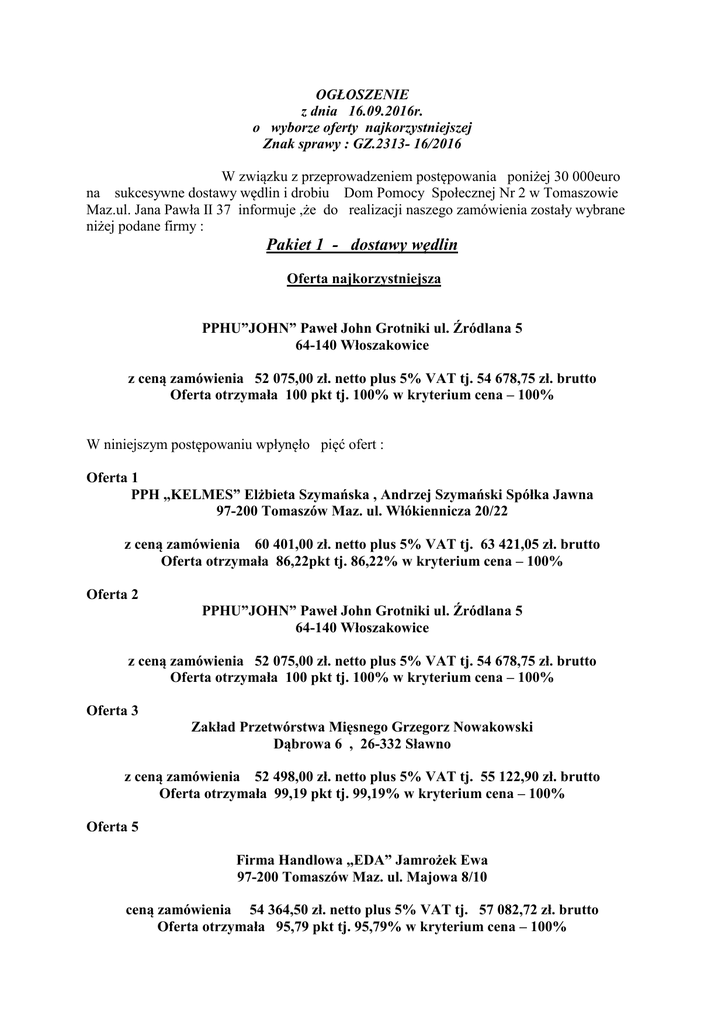 OGŁOSZENIE z dnia 16.09.2016r. o wyborze oferty najkorzystniejszej Znak sprawy : GZ.2313- 16/2016 W związku z przeprowadzeniem postępowania poniżej 30 000euro na sukcesywne dostawy wędlin i drobiu Dom Pomocy Społecznej Nr 2 w Tomaszowie Maz.ul. Jana Pawła II 37 informuje ,że do realizacji naszego zamówienia zostały wybrane niżej podane firmy : Pakiet 1 - dostawy wędlin Oferta najkorzystniejsza PPHU”JOHN” Paweł John Grotniki ul. Źródlana 5 64-140 Włoszakowice z ceną zamówienia 52 075,00 zł. netto plus 5% VAT tj. 54 678,75 zł. brutto Oferta otrzymała 100 pkt tj. 100% w kryterium cena – 100% W niniejszym postępowaniu wpłynęło pięć ofert : Oferta 1 PPH „KELMES” Elżbieta Szymańska , Andrzej Szymański Spółka Jawna 97-200 Tomaszów Maz. ul. Włókiennicza 20/22 z ceną zamówienia 60 401,00 zł. netto plus 5% VAT tj. 63 421,05 zł. brutto Oferta otrzymała 86,22pkt tj. 86,22% w kryterium cena – 100% Oferta 2 PPHU”JOHN” Paweł John Grotniki ul. Źródlana 5 64-140 Włoszakowice z ceną zamówienia 52 075,00 zł. netto plus 5% VAT tj. 54 678,75 zł. brutto Oferta otrzymała 100 pkt tj. 100% w kryterium cena – 100% Oferta 3 Zakład Przetwórstwa Mięsnego Grzegorz Nowakowski Dąbrowa 6 , 26-332 Sławno z ceną zamówienia 52 498,00 zł. netto plus 5% VAT tj. 55 122,90 zł. brutto Oferta otrzymała 99,19 pkt tj. 99,19% w kryterium cena – 100% Oferta 5 Firma Handlowa „EDA” Jamrożek Ewa 97-200 Tomaszów Maz. ul. Majowa 8/10 ceną zamówienia 54 364,50 zł. netto plus 5% VAT tj. 57 082,72 zł. brutto Oferta otrzymała 95,79 pkt tj. 95,79% w kryterium cena – 100% Oferta 7 „DEKO SMAKU” Cezary Dębiec 97-200 Tomaszów Maz.ul. Św. Antoniego 2 ceną zamówienia 63 225,00 zł. netto plus 5% VAT tj. 66 386,25 zł. brutto Oferta otrzymała 82,36 pkt tj. 82,36% w kryterium cena – 100% Pakiet 2 - dostawy drobiu Oferta najkorzystniejsza Oferta 1 PPH „KELMES” Elżbieta Szymańska , Andrzej Szymański Spółka Jawna 97-200 Tomaszów Maz. ul. Włókiennicza 20/22 z ceną zamówienia 22 730,00 zł. netto plus należny podatek VAT tj. 23 866,50 zł. brutto Oferta otrzymała 100 pkt tj. 100% w kryterium cena – 100% W niniejszym postępowaniu wpłynęły trzy oferty: Oferta 1 PPH „KELMES” Elżbieta Szymańska , Andrzej Szymański Spółka Jawna 97-200 Tomaszów Maz. ul. Włókiennicza 20/22 z ceną zamówienia 22 730,00 zł. netto plus należny podatek VAT tj. 23 866,50 zł. brutto Oferta otrzymała 100 pkt tj. 100% w kryterium cena – 100% Oferta 4 Zakład Przetwórstwa Mięsnego Grzegorz Nowakowski Dąbrowa 6 , 26-332 Sławno z ceną zamówienia 26 215,00 zł. netto plus 5% VAT tj. 27 525,75 zł. brutto Oferta otrzymała 86,71 pkt tj. 86,71% w kryterium cena – 100 Oferta 6 „DEKO SMAKU” Cezary Dębiec 97-200 Tomaszów Maz.ul. Św. Antoniego 2 ceną zamówienia 25 961,00 zł. netto plus 5% VAT tj. 27 259,05 zł. brutto Oferta otrzymała 87,55 pkt tj. 87,55% w kryterium cena – 100% Umowy z wybranymi firmami zostaną podpisane w dniu 27.09.2016r. w siedzibie Zamawiającego .