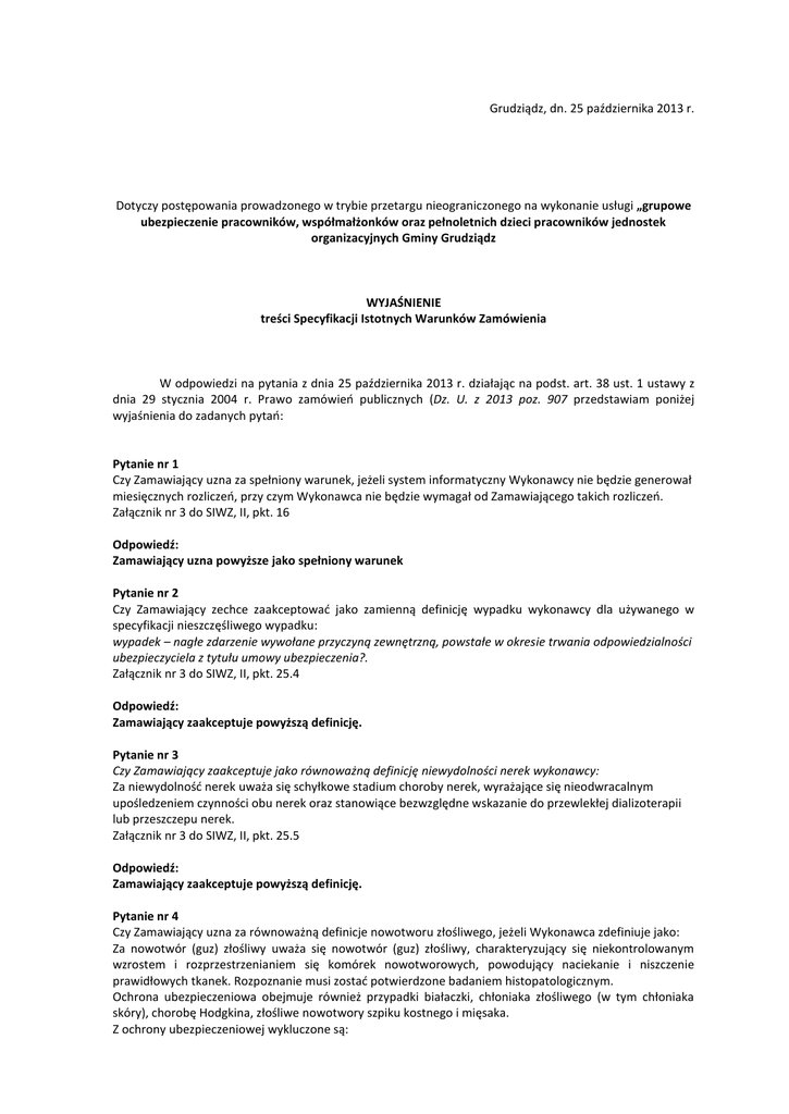 Grudziądz, dn. 25 października 2013 r. Dotyczy postępowania prowadzonego w trybie przetargu nieograniczonego na wykonanie usługi „grupowe ubezpieczenie pracowników, współmałżonków oraz pełnoletnich dzieci pracowników jednostek organizacyjnych Gminy Grudziądz WYJAŚNIENIE treści Specyfikacji Istotnych Warunków Zamówienia W odpowiedzi na pytania z dnia 25 października 2013 r. działając na podst. art. 38 ust. 1 ustawy z dnia 29 stycznia 2004 r. Prawo zamówień publicznych (Dz. U. z 2013 poz. 907 przedstawiam poniżej wyjaśnienia do zadanych pytań: Pytanie nr 1 Czy Zamawiający uzna za spełniony warunek, jeżeli system informatyczny Wykonawcy nie będzie generował miesięcznych rozliczeń, przy czym Wykonawca nie będzie wymagał od Zamawiającego takich rozliczeń. Załącznik nr 3 do SIWZ, II, pkt. 16 Odpowiedź: Zamawiający uzna powyższe jako spełniony warunek Pytanie nr 2 Czy Zamawiający zechce zaakceptować jako zamienną definicję wypadku wykonawcy dla używanego w specyfikacji nieszczęśliwego wypadku: wypadek – nagłe zdarzenie wywołane przyczyną zewnętrzną, powstałe w okresie trwania odpowiedzialności ubezpieczyciela z tytułu umowy ubezpieczenia?. Załącznik nr 3 do SIWZ, II, pkt. 25.4 Odpowiedź: Zamawiający zaakceptuje powyższą definicję. Pytanie nr 3 Czy Zamawiający zaakceptuje jako równoważną definicję niewydolności nerek wykonawcy: Za niewydolność nerek uważa się schyłkowe stadium choroby nerek, wyrażające się nieodwracalnym upośledzeniem czynności obu nerek oraz stanowiące bezwzględne wskazanie do przewlekłej dializoterapii lub przeszczepu nerek. Załącznik nr 3 do SIWZ, II, pkt. 25.5 Odpowiedź: Zamawiający zaakceptuje powyższą definicję. Pytanie nr 4 Czy Zamawiający uzna za równoważną definicje nowotworu złośliwego, jeżeli Wykonawca zdefiniuje jako: Za nowotwór (guz) złośliwy uważa się nowotwór (guz) złośliwy, charakteryzujący się niekontrolowanym wzrostem i rozprzestrzenianiem się komórek nowotworowych, powodujący naciekanie i niszczenie prawidłowych tkanek. Rozpoznanie musi zostać potwierdzone badaniem histopatologicznym. Ochrona ubezpieczeniowa obejmuje również przypadki białaczki, chłoniaka złośliwego (w tym chłoniaka skóry), chorobę Hodgkina, złośliwe nowotwory szpiku kostnego i mięsaka. Z ochrony ubezpieczeniowej wykluczone są: 1) rak nieinwazyjny (carcinoma in situ), dysplazja oraz wszelkie zmiany przedrakowe, 2) rak gruczołu krokowego w stopniu zaawansowania T1 według klasyfikacji TNM (łącznie z T1a, T1b, T1c) lub odpowiadający mu stopień zaawansowania według innej klasyfikacji, 3) wszelkie nowotwory skóry z wyjątkiem czerniaka złośliwego przekraczającego warstwę naskórka, 4) rak brodawkowaty tarczycy ograniczony do gruczołu tarczowego, 5) wszelkie nowotwory współistniejące z infekcją HIV. Załącznik nr 3 do SIWZ, II, pkt. 25.6 Odpowiedź: Zamawiający zaakceptuje powyższą definicję. Pytanie nr 5 Czy Zamawiający uzna za równoważną definicję OIOM/OIT na zdrowiu wykonawcy: OIOM – oddział intensywnej opieki medycznej (oddział intensywnej terapii) – wydzielony oddział szpitalny, w którym przebywają chorzy w stanie zagrożenia życia objęci intensywnym leczeniem specjalistycznym, ciągłą pielęgnacją i nadzorem, zaopatrzony w specjalistyczny sprzęt umożliwiający ciągłe monitorowanie czynności życiowych chorych, pozwalające uchwycić lub przewidzieć moment zagrożenia życia Załącznik nr 3 do SIWZ, II, pkt. 25.7 Odpowiedź: Zamawiający zaakceptuje powyższą definicję. Pytanie nr 6 Czy Zamawiający uzna za równoważną definicję operacji wykonawcy: operacja – zabieg chirurgiczny wykonany w szpitalu przez zespół lekarzy i pielęgniarek w celu przywrócenia prawidłowych czynności chorego narządu lub układu, usunięcia chorej tkanki, narządu lub jego części, usunięcia przyczyny choroby, ogniska chorobowego, dokonania przeszczepu, powiązany z koniecznością przecięcia skóry i innych tkanek Załącznik nr 3 do SIWZ, II, pkt. 25.8 Odpowiedź: Zamawiający zaakceptuje powyższą definicję. Pytanie nr 7 Czy Zamawiający w ryzyku operacji ubezpieczonego zaakceptuje poniższą definicję szpitala: szpital – działający na terenie Rzeczpospolitej Polskiej, zgodnie z przepisami Ministerstwa Zdrowia, państwowy lub niepaństwowy zamknięty zakład opieki zdrowotnej (z wyłączeniem zakładów psychiatrycznych i szpitali więziennych), którego zadaniem jest całodobowa opieka nad chorymi i ich leczenie w warunkach stałych i specjalnie do tych celów przystosowanych; szpitalem w rozumieniu niniejszego załącznika nie jest dom opieki lub inna placówka, której jedynym zadaniem jest leczenie alkoholizmu i innych uzależnień Załącznik nr 3 do SIWZ, II, pkt. 25.8 Odpowiedź: Zamawiający zaakceptuje powyższą definicję. Pytanie nr 8 Czy Zamawiający zaakceptuje definicję partnera Wykonawcy? partner – osoba płci przeciwnej wobec ubezpieczonego, wskazana przez ubezpieczonego w deklaracji uczestnictwa/zmiany jako osoba z nim nie spokrewniona, pozostająca z ubezpieczonym w nieformalnym związku, prowadząca z ubezpieczonym wspólne gospodarstwo domowe oraz nie pozostająca w związku małżeńskim z osobą trzecią, która w dniu składania stosownych oświadczeń o związku partnerskim, a także w dniu zajścia zdarzenia objętego ochroną w ramach dodatkowej umowy ubezpieczenia nie pozostaje w związku małżeńskim z osobą trzecią, o ile ubezpieczony w dniu składania stosownych oświadczeń o związku partnerskim, a także w dniu zajścia zdarzenia objętego ochroną ubezpieczeniową w ramach dodatkowej umowy ubezpieczenia również nie pozostaje/wał w związku małżeńskim z osobą trzecią Załącznik nr 3 do SIWZ, II, pkt. 25.9 Odpowiedź: Zamawiający uzna powyższą definicję jako równoważną. Pytanie nr 9 Czy Zamawiający zaakceptuje, definicję rodzica małżonka lub partnera Wykonawcy: