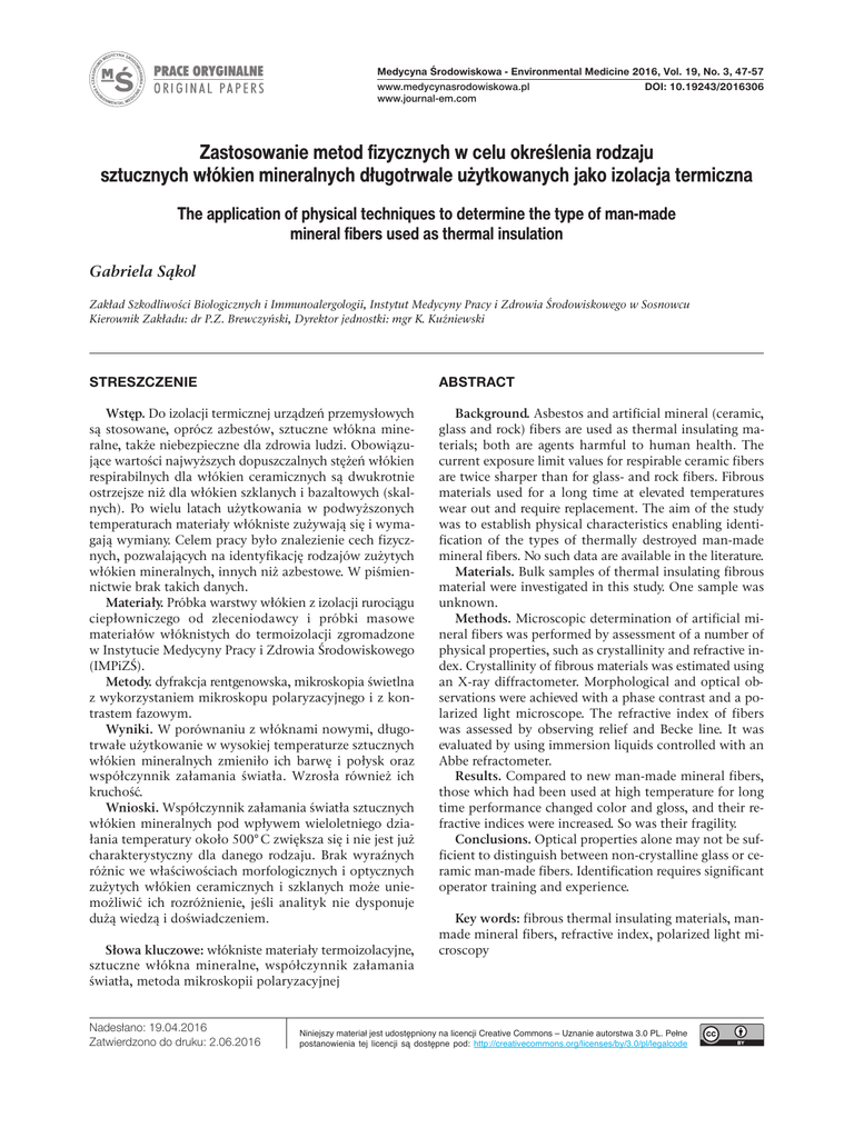 Medycyna Środowiskowa - Environmental Medicine 2016, Vol. 19, No. 3, 47-57 DOI: 10.19243/2016306 www.medycynasrodowiskowa.pl www.journal-em.com Zastosowanie metod fizycznych w celu określenia rodzaju sztucznych włókien mineralnych długotrwale użytkowanych jako izolacja termiczna The application of physical techniques to determine the type of man-made mineral fibers used as thermal insulation Gabriela Sąkol Zakład Szkodliwości Biologicznych i Immunoalergologii, Instytut Medycyny Pracy i Zdrowia Środowiskowego w Sosnowcu Kierownik Zakładu: dr P.Z. Brewczyński, Dyrektor jednostki: mgr K. Kuźniewski StrESzczENIE Wstęp. Do izolacji termicznej urządzeń przemysłowych są stosowane, oprócz azbestów, sztuczne włókna mineralne, także niebezpieczne dla zdrowia ludzi. Obowiązujące wartości najwyższych dopuszczalnych stężeń włókien respirabilnych dla włókien ceramicznych są dwukrotnie ostrzejsze niż dla włókien szklanych i bazaltowych (skalnych). Po wielu latach użytkowania w podwyższonych temperaturach materiały włókniste zużywają się i wymagają wymiany. Celem pracy było znalezienie cech fizycznych, pozwalających na identyfikację rodzajów zużytych włókien mineralnych, innych niż azbestowe. W piśmiennictwie brak takich danych. Materiały. Próbka warstwy włókien z izolacji rurociągu ciepłowniczego od zleceniodawcy i próbki masowe materiałów włóknistych do termoizolacji zgromadzone w Instytucie Medycyny Pracy i Zdrowia Środowiskowego (IMPiZŚ). Metody. dyfrakcja rentgenowska, mikroskopia świetlna z wykorzystaniem mikroskopu polaryzacyjnego i z kontrastem fazowym. Wyniki. W porównaniu z włóknami nowymi, długotrwałe użytkowanie w wysokiej temperaturze sztucznych włókien mineralnych zmieniło ich barwę i połysk oraz współczynnik załamania światła. Wzrosła również ich kruchość. Wnioski. Współczynnik załamania światła sztucznych włókien mineralnych pod wpływem wieloletniego działania temperatury około 500° C zwiększa się i nie jest już charakterystyczny dla danego rodzaju. Brak wyraźnych różnic we właściwościach morfologicznych i optycznych zużytych włókien ceramicznych i szklanych może uniemożliwić ich rozróżnienie, jeśli analityk nie dysponuje dużą wiedzą i doświadczeniem. Słowa kluczowe: włókniste materiały termoizolacyjne, sztuczne włókna mineralne, współczynnik załamania światła, metoda mikroskopii polaryzacyjnej Nadesłano: 19.04.2016 Zatwierdzono do druku: 2.06.2016 AbStrAct Background. Asbestos and artificial mineral (ceramic, glass and rock) fibers are used as thermal insulating materials; both are agents harmful to human health. The current exposure limit values for respirable ceramic fibers are twice sharper than for glass- and rock fibers. Fibrous materials used for a long time at elevated temperatures wear out and require replacement. The aim of the study was to establish physical characteristics enabling identification of the types of thermally destroyed man-made mineral fibers. No such data are available in the literature. Materials. Bulk samples of thermal insulating fibrous material were investigated in this study. One sample was unknown. Methods. Microscopic determination of artificial mineral fibers was performed by assessment of a number of physical properties, such as crystallinity and refractive index. Crystallinity of fibrous materials was estimated using an X-ray diffractometer. Morphological and optical observations were achieved with a phase contrast and a polarized light microscope. The refractive index of fibers was assessed by observing relief and Becke line. It was evaluated by using immersion liquids controlled with an Abbe refractometer. Results. Compared to new man-made mineral fibers, those which had been used at high temperature for long time performance changed color and gloss, and their refractive indices were increased. So was their fragility. Conclusions. Optical properties alone may not be sufficient to distinguish between non-crystalline glass or ceramic man-made fibers. Identification requires significant operator training and experience. Key words: fibrous thermal insulating materials, manmade mineral fibers, refractive index, polarized light microscopy Niniejszy materiał jest udostępniony na licencji Creative Commons – Uznanie autorstwa 3.0 PL. Pełne postanowienia tej licencji są dostępne pod: http://creativecommons.org/licenses/by/3.0/pl/legalcode 48 WStęp Medycyna Środowiskowa - Environmental Medicine 2016, Vol. 19, No. 3 Gabriela Sąkol: Zastosowanie metod fizycznych w celu określenia rodzaju sztucznych włókien mineralnych użytkowanych jako izolacja termiczna Jednym z głównych zastosowań naturalnych i sztucznych włókien mineralnych były i są nadal izolacje termiczne. W 1997 roku w Polsce wprowadzono zakaz stosowania azbestu w budownictwie miejskim i przemysłowym. Wcześniej był powszechnie stosowanym surowcem włóknistymi [1, 2]. Wraz z rozwojem technicznym w ciągu kilkudziesięciu ostatnich lat poszerzyła się różnorodność sztucznych włókien mineralnych. Oprócz włókien bazaltowych i szklanych zaczęto stosować włókna ceramiczne. W 2. połowie lat 90. Polska należała do grupy ich największych producentów [3]. Włókna bazaltowe, ceramiczne i szklane były traktowane równorzędnie jako instalacyjne materiały izolacyjne w temperaturach pracy do 500° C i szeroko stosowane [4–6]. Włókna z syntetycznych żużli wielkopiecowych w Polsce nie były rozpowszechnione [7]. Do instalacji termoizolacyjnych wykorzystywano włókna o długości do około kilkunastu centymetrów, tzw. krótkie, często jako warstwy luźnych włókien między warstwami cementowymi. Materiały włókniste stosowane do izolacji termicznych i ogniotrwałych w instalacjach przemysłowych mają ograniczoną trwałość, z czasem ulegają degradacji [4]. Obecnie często prowadzone są remonty lub rozbiórki obiektów budowla