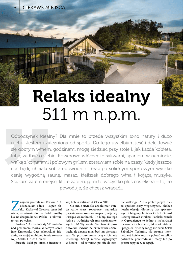 8 CIEKAWE MIEJSCA Relaks idealny 511 m n.p.m. Odpoczynek idealny? Dla mnie to przede wszystkim łono natury i dużo ruchu. Jestem uzależniona od sportu. Do tego uwielbiam jeść i delektować się dobrym winem, godzinami mogę siedzieć przy stole i, jak każda kobieta, lubię zadbać o siebie. Rowerowe włóczęgi z sakwami, spaniem w namiocie, walką z komarami i polowym grillem zostawiam sobie na czasy, kiedy jeszcze coś będę chciała sobie udowodnić. Teraz po solidnym sportowym wysiłku cenię wygodną saunę, masaż, kieliszek dobrego wina i kojącą muzykę. Szukam zatem miejsc, które zaoferują mi to wszystko plus coś ekstra – to, co powoduje, że chcesz wracać... Z najomi polecili mi Poziom 511, odszukałam adres – super, blisko Krakowa! Zresztą, teraz już wiem, że równie dobrze hotel mógłby być na drugim końcu Polski – i tak warto tam pojechać. Poziom 511 znajduje się 511 metrów nad poziomem morza, w samym sercu Jury Krakowsko-Częstochowskiej. Idealnie, na mojej ulubionej trasie rowerowej - Szlaku Orlich Gniazd. Buszuję dalej po stronie interneto- wej hotelu i klikam AKTYWNIE. Co mnie uwiodło absolutnie? Fantastyczne trasy rowerowe, wszystkie pięknie oznaczone na mapach, wiją się kusząco wokół hotelu. To lubię. Do tego jedna z trudniejszych tras wspinaczkowych. Ha! Wyzwanie. Wspinaczki próbowałam jedynie na sztucznych ściankach, ale zawsze musi być ten pierwszy raz. Te prostsze mnie oczywiście nie interesują. Sprzęt można wypożyczyć w hotelu – od rowerów, po kije do nor- dic walkingu. A dla preferujących nieco spokojniejszy wypoczynek, okolice hotelu oferują kilometry tras spacerowych i biegowych, Szlak Orlich Gniazd i szereg innych atrakcji. Pobliski zamek w Ogrodzieńcu to jedno z najbardziej niesamowitych miejsc, jakie widziałam. Spragnieni wiedzy mogą zwiedzić Szlak Zabytków Techniki. Na stronie internetowej hotelu można pobrać wszelkie potrzebne przewodniki i mapy lub po prostu zapytać w recepcji. CIEKAWE MIEJSCA Poziom 511 i jego personel to dość wyjątkowe „zjawisko”, wymagające osobnego omówienia. Nie sposób bowiem nie wspomnieć o samym miejscu, które mimo że wkute w designerskie formy geometryczne, na swój sposób ujarzmia naturę, wcale jej nie ujmując, a całość prezentuje się bardzo przytulnie. Hotel urządzony jest z niekwestionowanym smakiem, dość nowocześnie, ale dokładnie tak, jak lubię – czyli bardziej eko niż modern. Dużo szkła, ale w sercu budynku imponujący jurajski ostaniec, skała mająca z milion lat. Współczesny wystrój baru i do tego kolorowe pieńki zamiast hokerów. Na architekturze się nie znam, ale całość zrobiła na mnie ogromne wrażenie. Podobnie jak oszklony basen widoczny z holu głównego, od razu masz ochotę zrzucić ubranie i zanurzyć się w spokojnej tafli. Urzekła mnie także restauracja – przestronna i przytulna, a w głośnikach muzyka, która koi i z pewnością dodaje apetytu na więcej. Karta taka jak lubię: mało i konkretnie. Z szacunkiem dla mojego czasu i żołądka. Jedynie cztery dania główne, ale takie, na widok których szaleją kubki smakowe. Restauracja A’la carte, oprócz smaku stawia oczywiście na prezentację. Wyobraźcie sobie, jak pięknie można podać na przykład polędwiczka w pistacjach sous vide z polskimi warzywami, purée z topinamburu i czarną truflą, lub ravioli z kaczką, szałwią i chili. Talerz pachnie już z daleka, podawany przez uśmiechniętego kelnera w nieco hipsterskim, luźnym uniformie. Żadnych sztywnych koszul i rączek z tyłu, klasa jest na talerzu, nie ma potrzeby dodawać sobie animuszu zbędnym blichtrem. Animuszu zdecydowanie dodaje natomiast karta win. Włochy, Francja, Portugalia, Argentyna, Austria, Hiszpania, Niemcy… Dużo tego, ale ścisła selekcja powoduje, iż karta składa się tylko z dwudziestu ośmiu win, będących kwintesencją poszczególnych regionów. I, o Bachusie! Jestem zachwycona, że mają moje ukochane chilijskie Merlot, w bardzo zacnym wydaniu: Requinda Los Boldos Grand Reserve. Jestem w raju. Czas na małe podsumowanie: albo czytają w myślach gości, albo faktycznie mają niesamowite wyczucie potrzeb klienta. Jestem dość ciężkim przypad- 9 kiem. Oczywiście nie z tych awanturujących się, wiecznie niezadowolonych – raczej z takich, którym się podoba, ale… czegoś brakuje. A tu znalazłam wszystko, a nawet więcej. Spokój i ogromną przestrzeń, kiedy potrzebowałam oddechu. Sportowe wyzwania, sprzęt i odpowiednią opiekę, kiedy chciałam poczuć adrenalinę. Godną „strawę i napitek”: wykwintnie, lecz bez przerostu formy nad treścią. Zapomniałam dodać, że w Poziom 511 oprócz wyrafinowanych win można skosztować też regionalnego piwa, co oczywiście uczyniłam, lokując się na wygodnym leżaczku w cieniu jurajskich skał. Poziom 511 ma też to coś, co wystaje ponad poziom standardów. Umiejętnie łączy wysoką jakość usług z totalną przystępnością. Nie mylić luzu i gościnności z nonszalancją, okiełznać żywioł natury, nie zagłuszając jej – to sztuka, która się tu udała. Ja wrócę na pewno – na najwyższy poziom relaksu. Poziom 511 Design Hotel & SPA www.poziom511.com Bonerów 33, 42-440 Podzamcze tel: 32 746 28 00