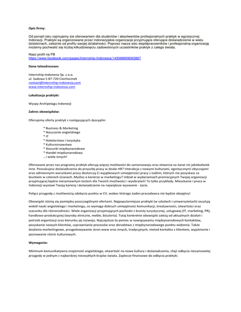 Opis firmy: Od ponad roku zajmujemy sie oferowaniem dla studentów i absolwentów profesjonalnych praktyk w egzotycznej Indonezji. Praktyki są organizowane przez indonezyjskie organizacje przyjmujące oferujące doświadczenie w wielu dziedzinach, zależnie od profilu swojej działalności. Poprzez nasza siec współpracowników i profesjonalną organizację możemy pochwalić się liczbą kilkudziesięciu zadowolonych uczestników praktyk z całego świata. Nasz profil na FB https://www.facebook.com/pages/Internship-Indonesia/143068909063867 Dane teleadresowe: Internship-Indonesia Sp. z o.o. ul. Sadowa 5 87-720 Ciechocinek [email protected] www.internship-indonesia.com Lokalizacja praktyki: Wyspy Archipelagu Indonezji Zakres obowiązków: Oferujemy oferty praktyk z następujących dyscyplin: * Business & Marketing * Nauczanie angielskiego * IT * Hotelarstwo i turystyka * Kulturoznawstwo * Stosunki międzynarodowe * Handel międzynarodowy ...i wiele innych! Oferowane przez nas programy praktyk oferują więcej możliwości do samorozwoju oraz otwarcia na świat niż jakiekolwiek inne. Poszukujesz doświadczenia do przyszłej pracy w dziale HR? Interakcja z nowymi kulturami, egzotycznymi obyczajami oraz odmiennymi warunkami pracy dostarczą Ci wyjątkowych umiejętności pracy z ludźmi, których nie pozyskasz za biurkiem w czterech ścianach. Myślisz o karierze w marketingu? Udział w wydarzeniach promocyjnych Twojej organizacji przyjmującej będzie niesamowitym testem dla Twoich możliwości i wyobrażeń! To tylko przykłady. Mieszkanie i praca w Indonezji wystawi Twoją karierę i doświadczenie na największe wyzwanie - życie. Połącz przygodę z możliwością zdobycia punktu w CV, wobec którego żaden pracodawca nie będzie obojętny! Obowiązki różnią się pomiędzy poszczególnymi ofertami. Najpopularniejsze praktyki (w szkołach i uniwersytetach) oscylują wokół nauki angielskiego i marketingu, co wymaga dobrych umiejętności komunikacji, kreatywności, otwartości oraz szacunku dla różnorodności. Wiele organizacji przyjmujących pochodzi z branży turystycznej, usługowej (IT, marketing, PR), handlowo-produkcyjnej (wyroby etniczne, meble, biżuteria). Tutaj konkretne obowiązki zależą od aktualnych działań i potrzeb organizacji oraz kierunku jej rozwoju. Najczęstsze to pomoc w nawiązywaniu międzynarodowych kontaktów, pozyskanie nowych klientów, usprawnianie procesów oraz doradztwo z międzynarodowego punktu widzenia. Także działania marketingowe, przygotowywanie stron www oraz innych, tradycyjnych, metod kontaktu z klientem, wyjaśnianie i poznawanie różnic kulturowych. Wymagania: Minimum komunikatywna znajomość angielskiego, otwartość na nowe kultury i doświadczenia, chęć odbycia niesamowitej przygody w jednym z najbardziej niezwykłych krajów świata. Zaplecze finansowe do odbycia praktyki. Oferowane warunki: • • Wszystkie praktyki gwarantują kieszonkowe wystarczające na swobodne utrzymanie się w Indonezji. Większość ofert obejmuje darmowe zakwaterowanie oraz dodatkowe benefity (wyżywienie, podróże, skuter na własny użytek itp.). Bilet lotniczy (ok.2500-3500zl w dwie strony), ubezpieczenie, wiza, ewentualne szczepionki - koszta po stronie wyjeżdżającego. Legalna podstawa pobytu w Indonezji - wiza social-cultural, maksymalny pobyt 6 miesięcy. Kontrakt z indonezyjska organizacją przyjmująca gwarantujący dotrzymanie warunków. • Czas rozpoczęcia do negocjacji zgodnie z preferencjami kandydata • • • Więcej informacji: www.internship-indonesia.com Facebook: Internship-Indonesia Aplikacje: http://www.internship-indonesia.com/applynow.php Okres ważności oferty: 31.12.2012
